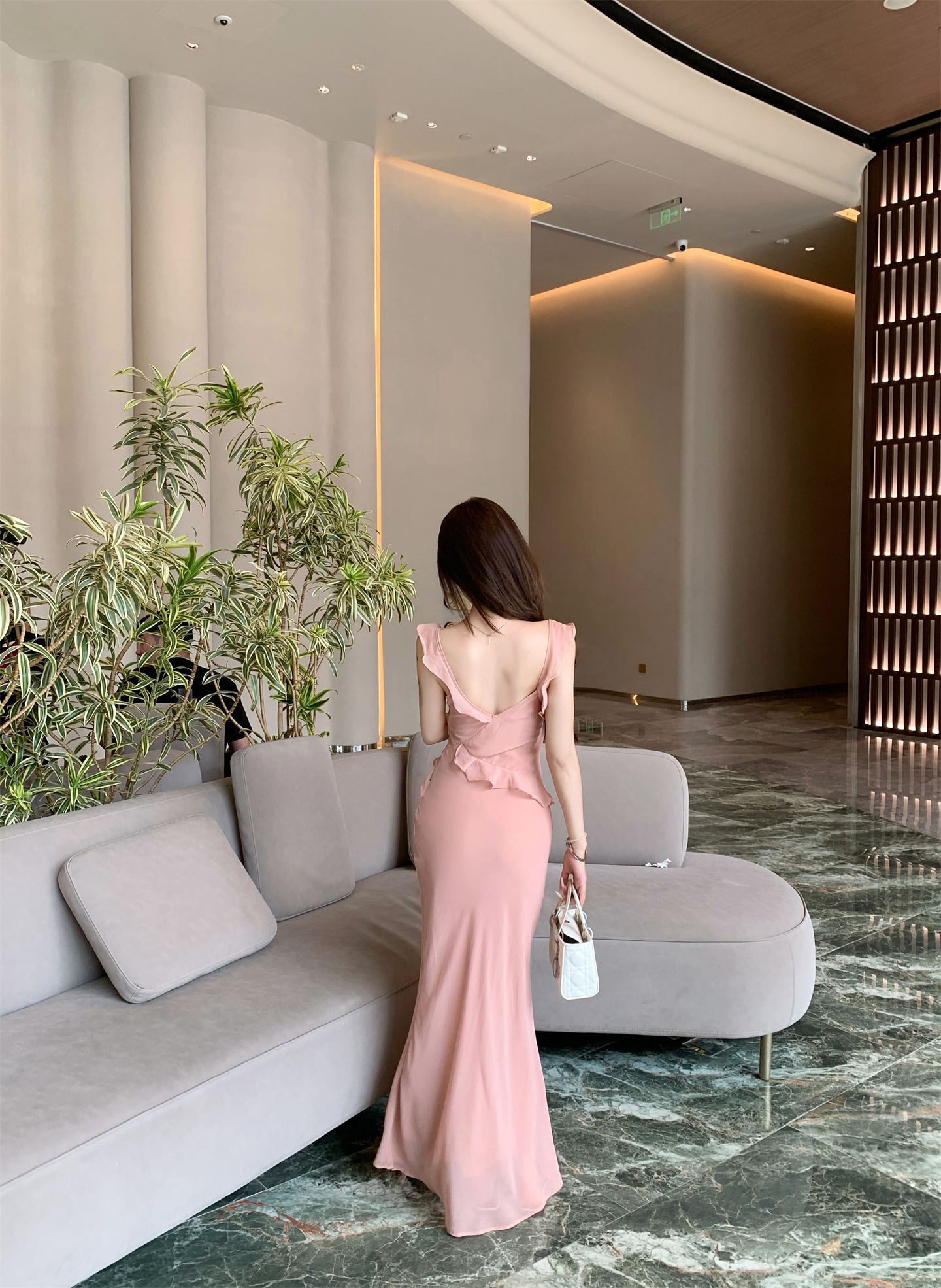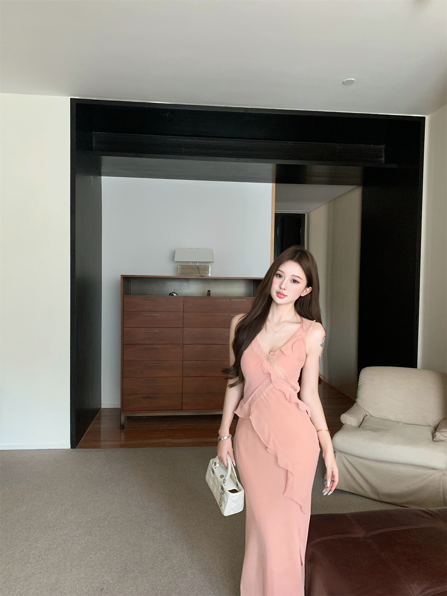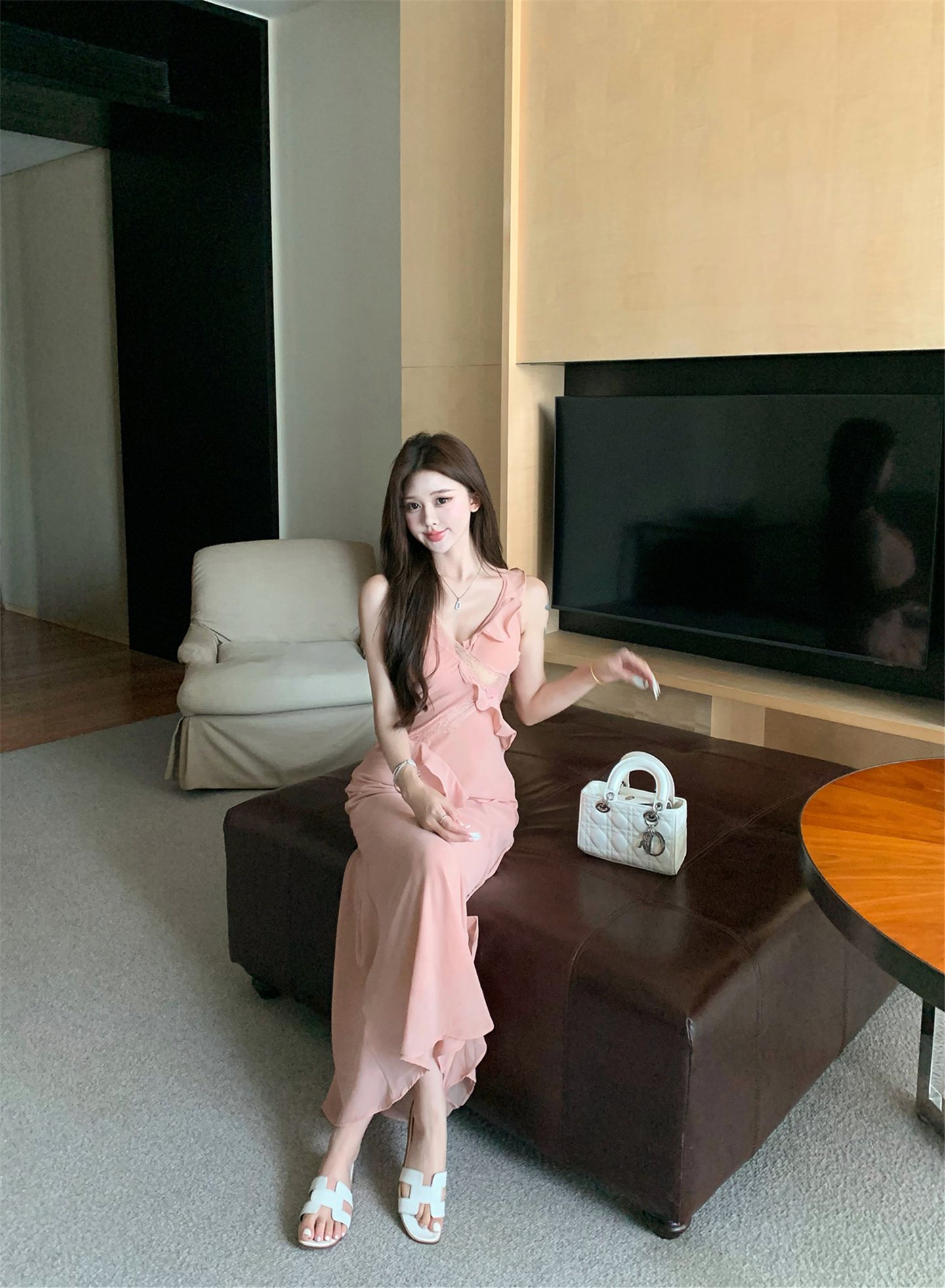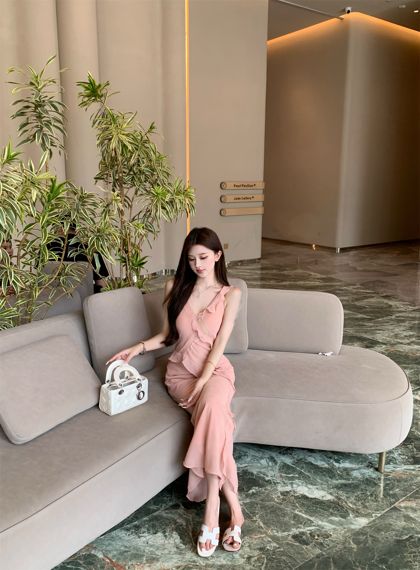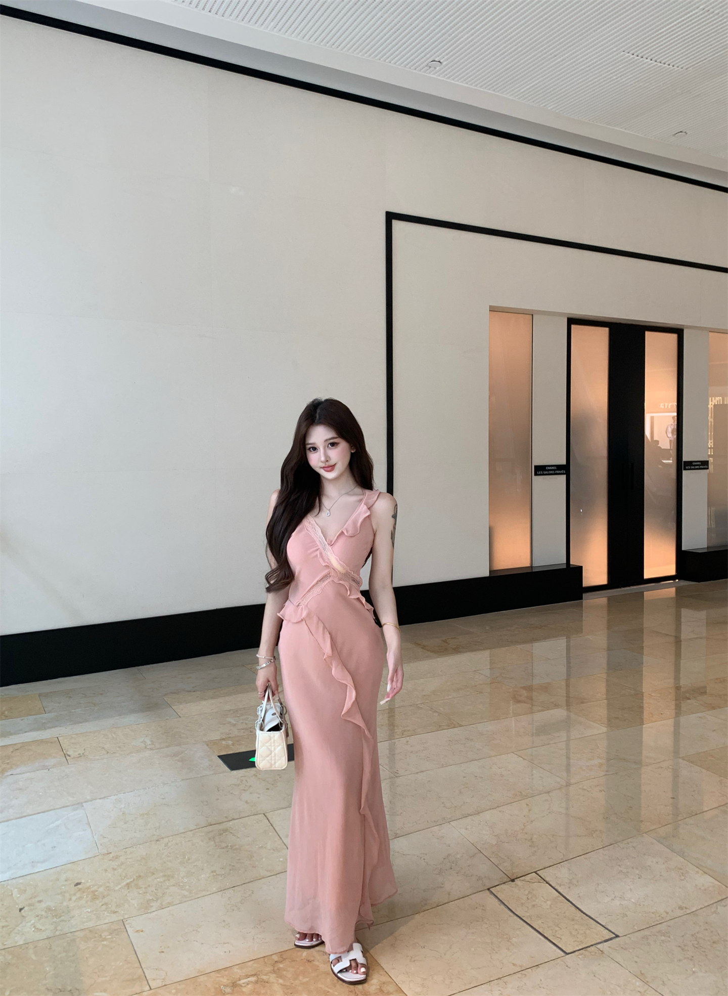 실사 청각 장애인 아니요 자기 인식 프랑스식 우아함 프릴 쉬폰 레이스 슬립 점프 슈트 롱 스커트 여성