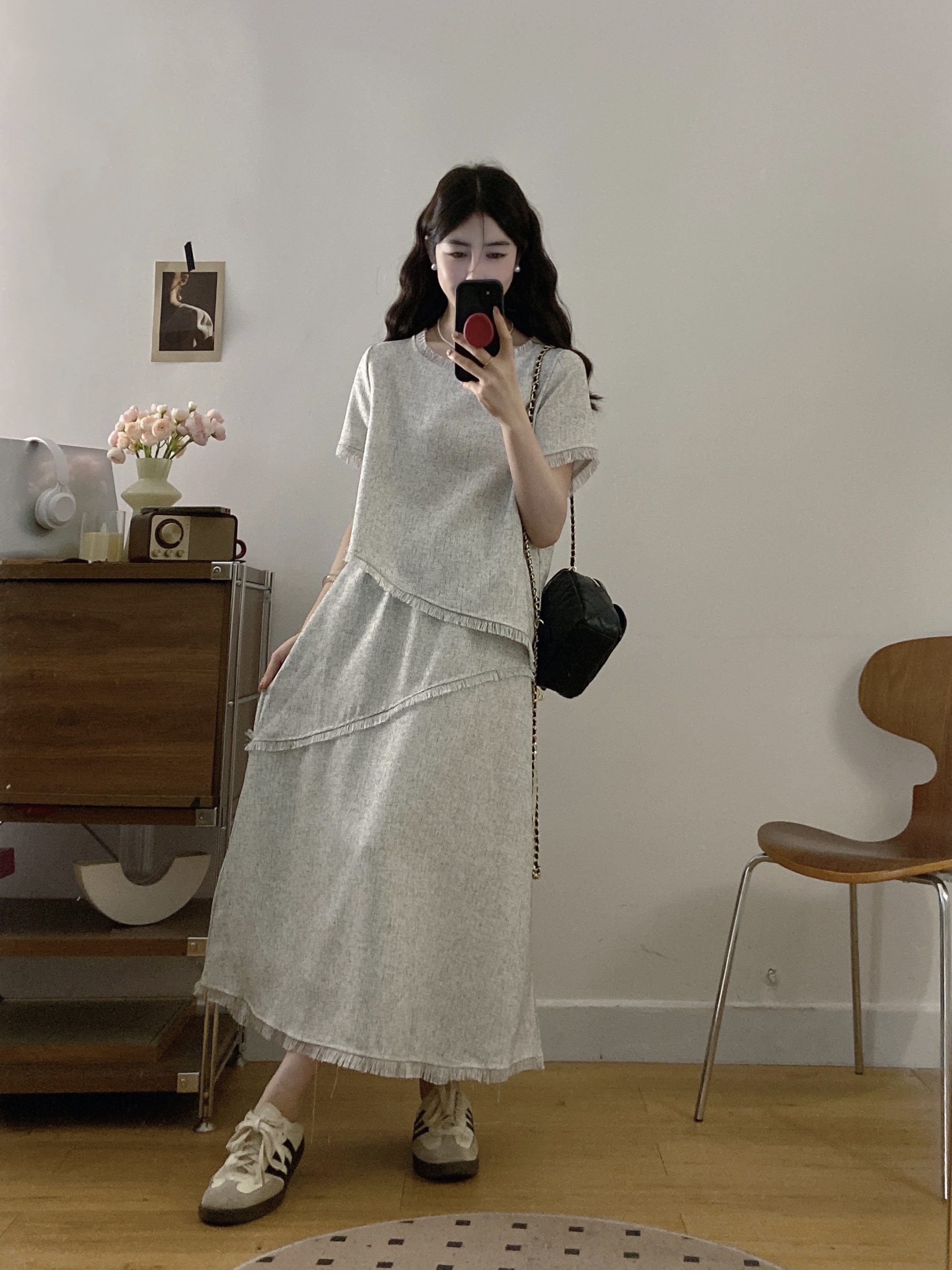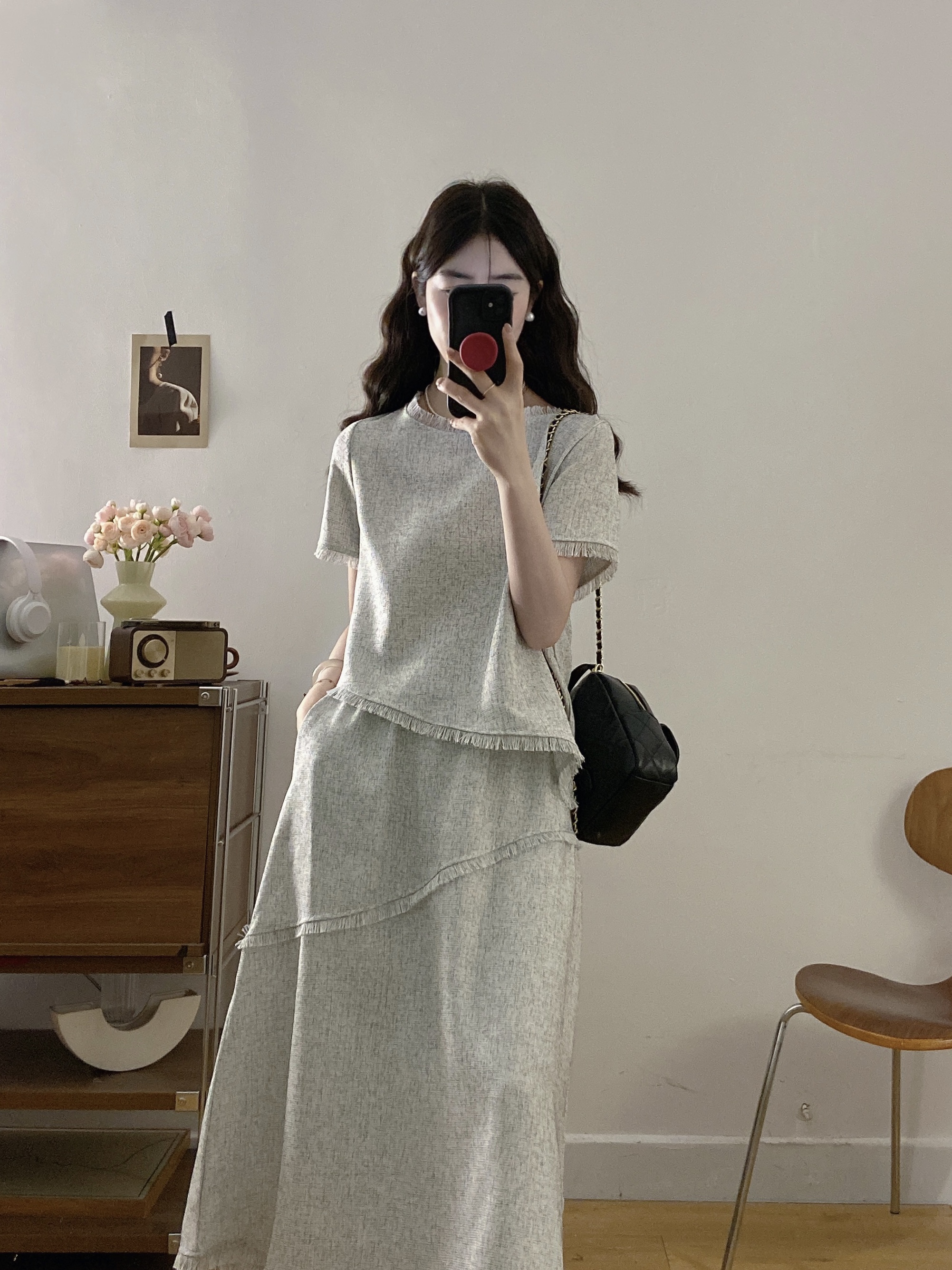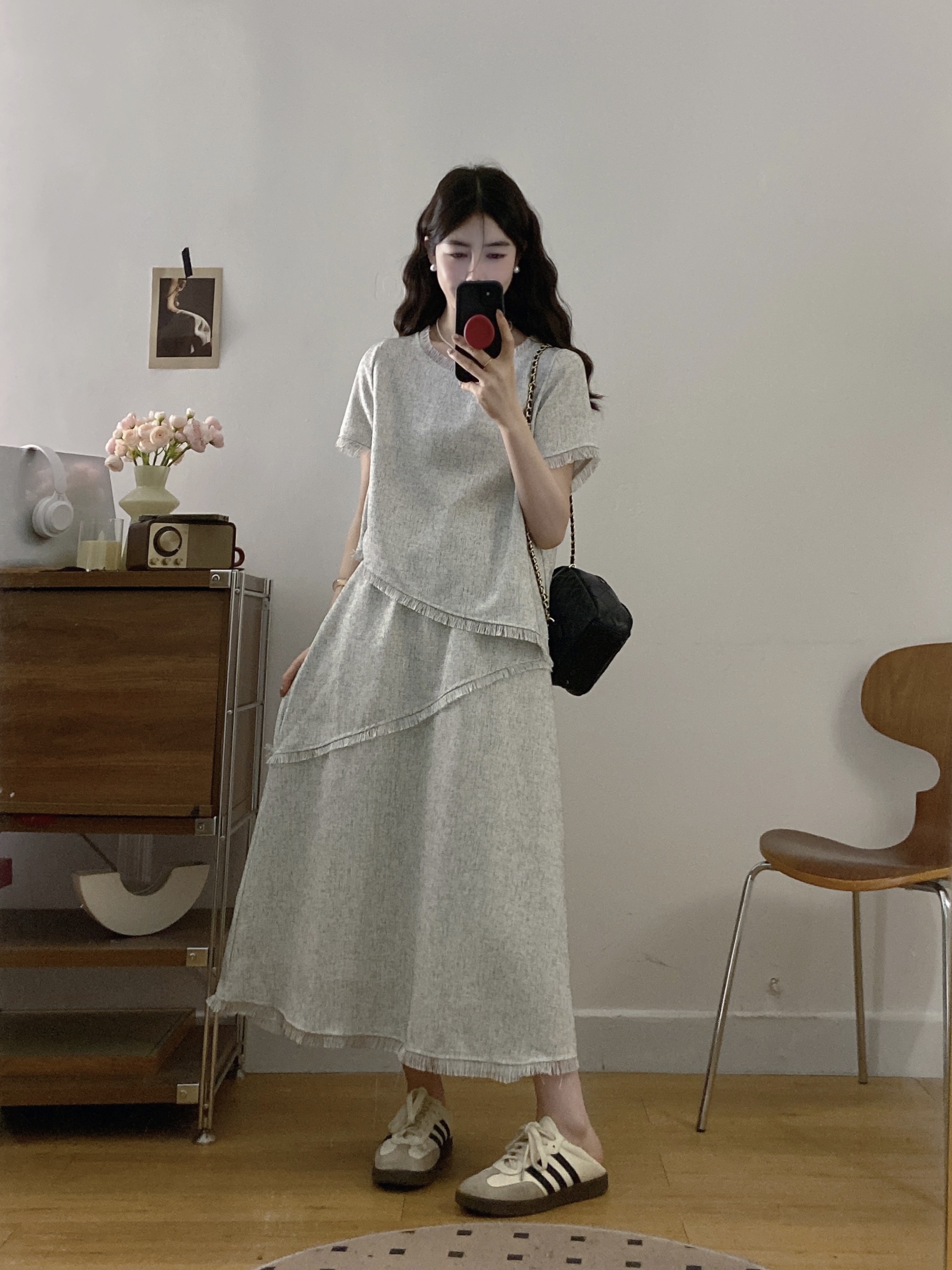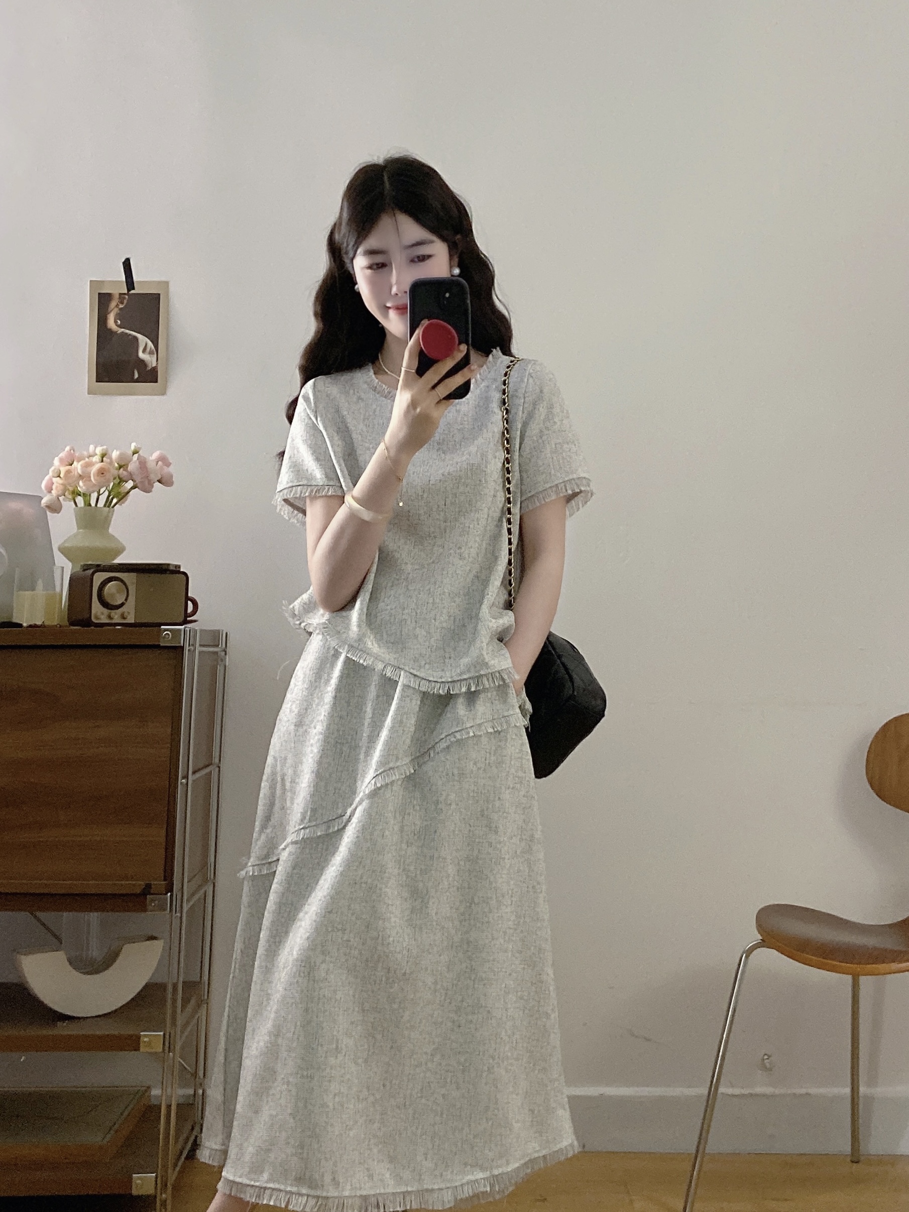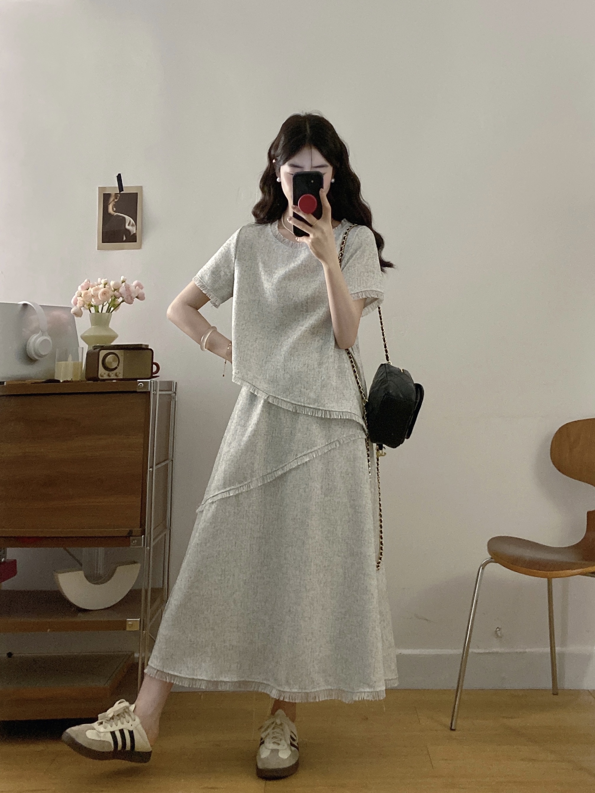실사 빅 사이즈 여성 의류 2026 여름 새로운 고급 센스 라운드 넥 밝은 회색 색상 반팔 품격 술 치마 세트