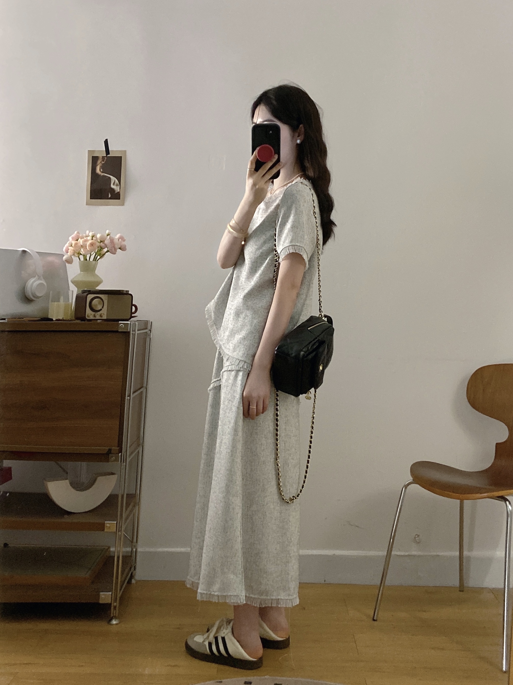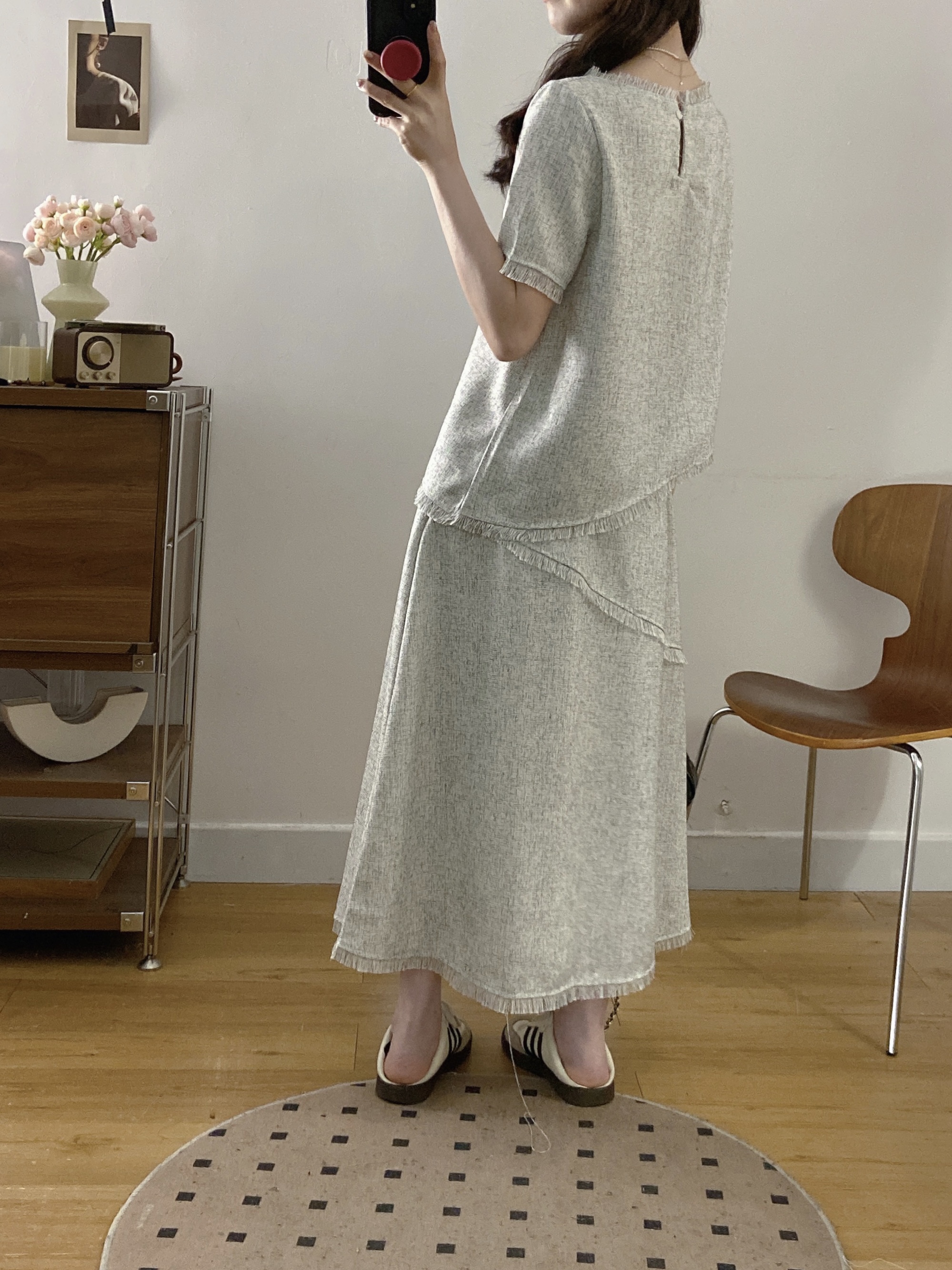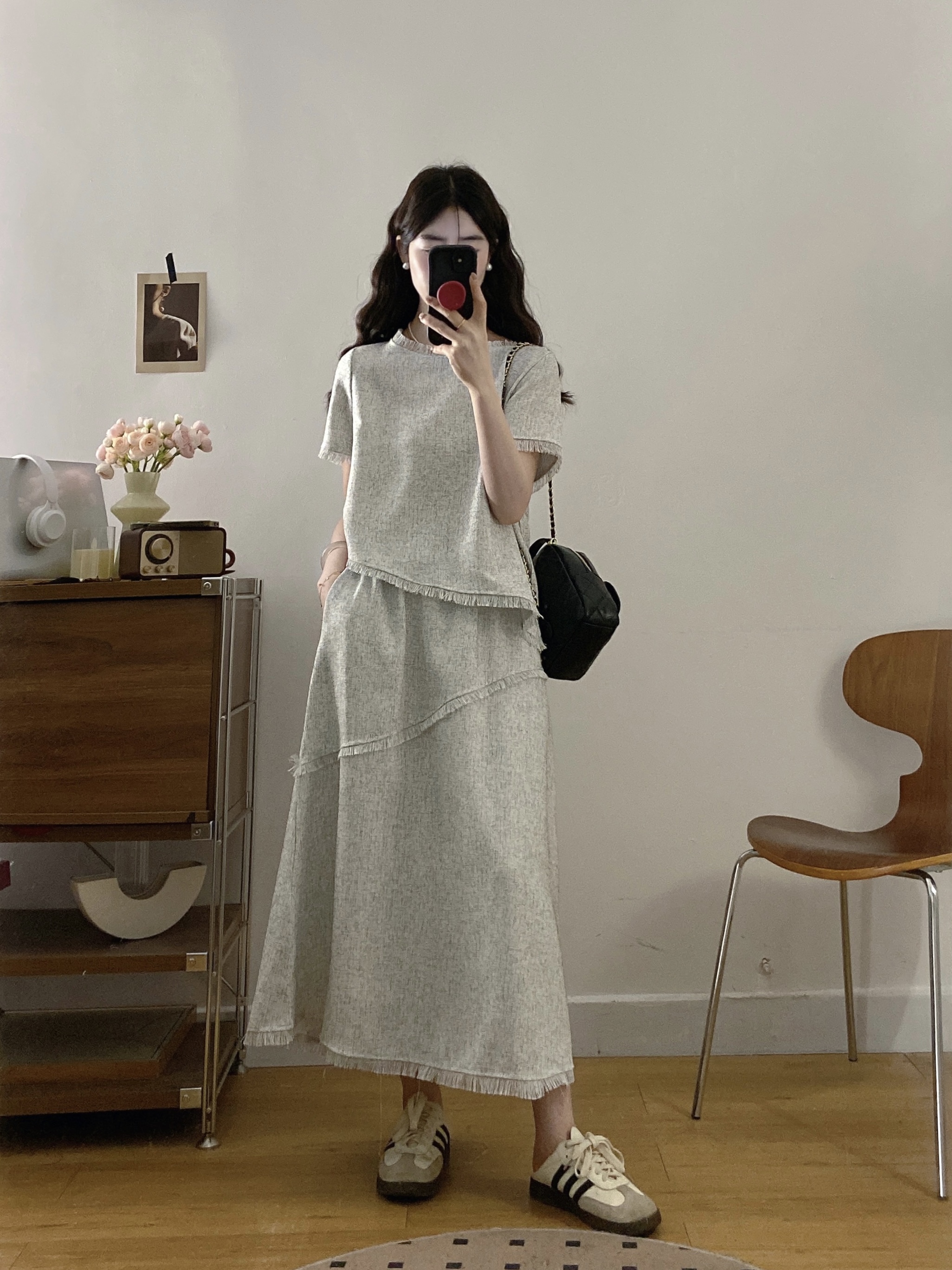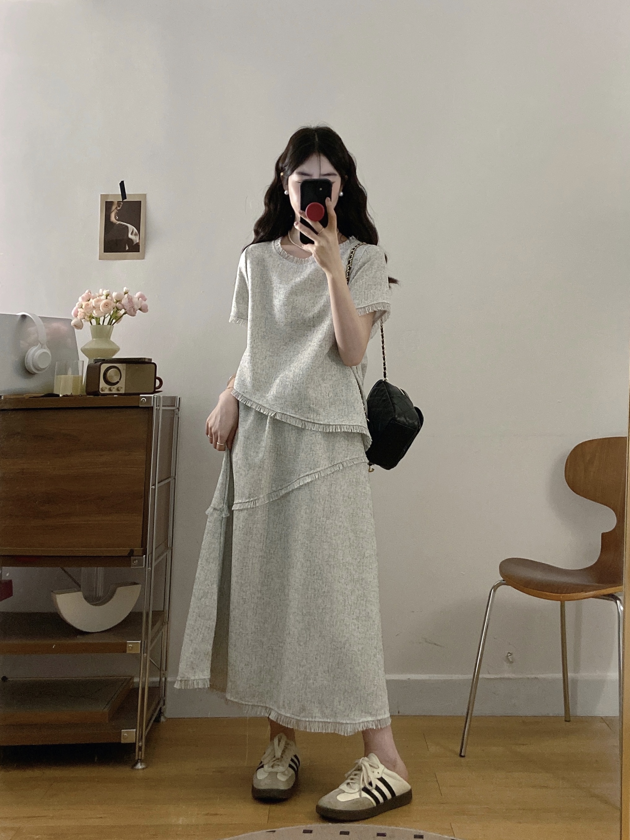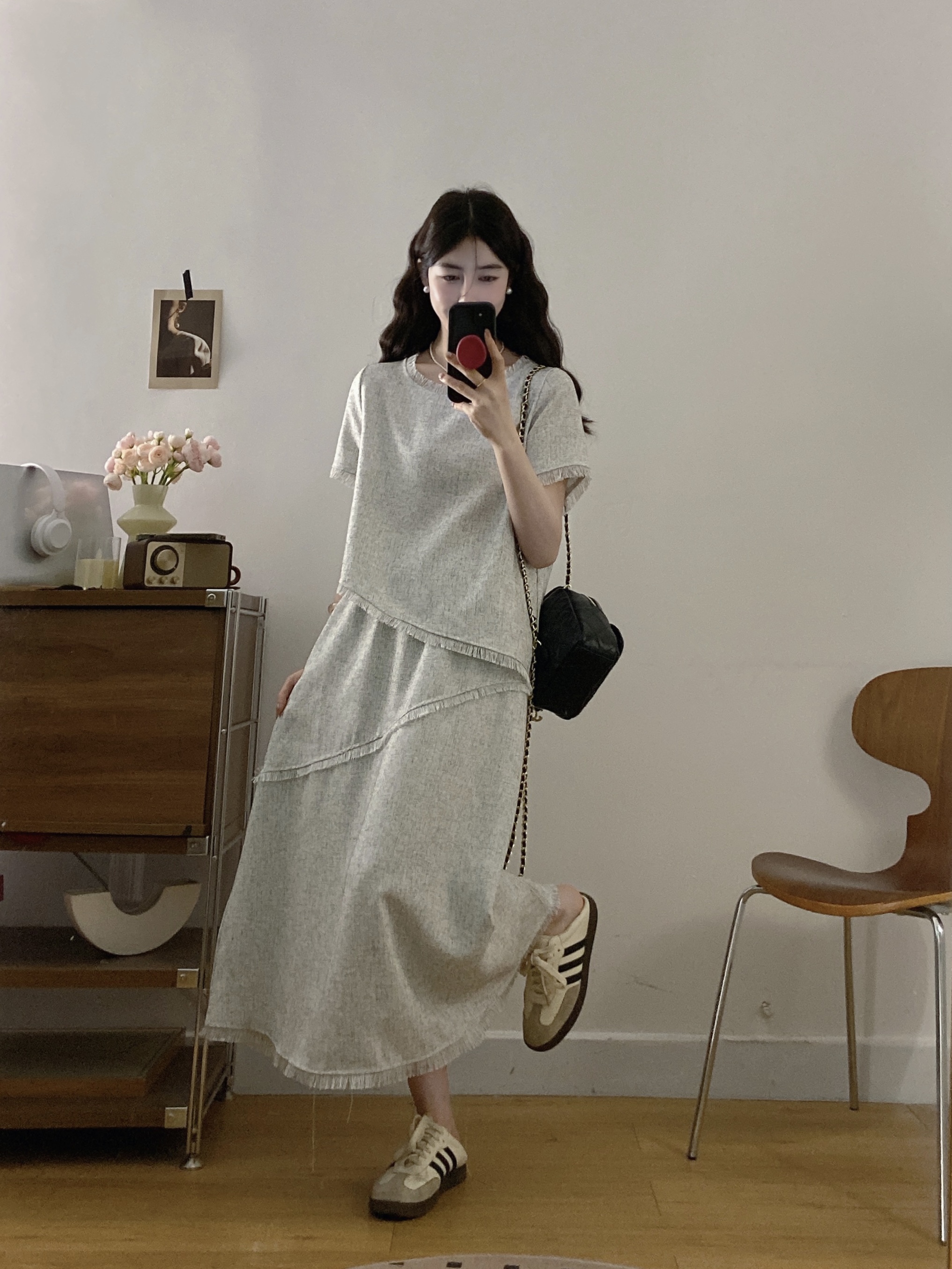 실사 빅 사이즈 여성 의류 2026 여름 새로운 고급 센스 라운드 넥 밝은 회색 색상 반팔 품격 술 치마 세트