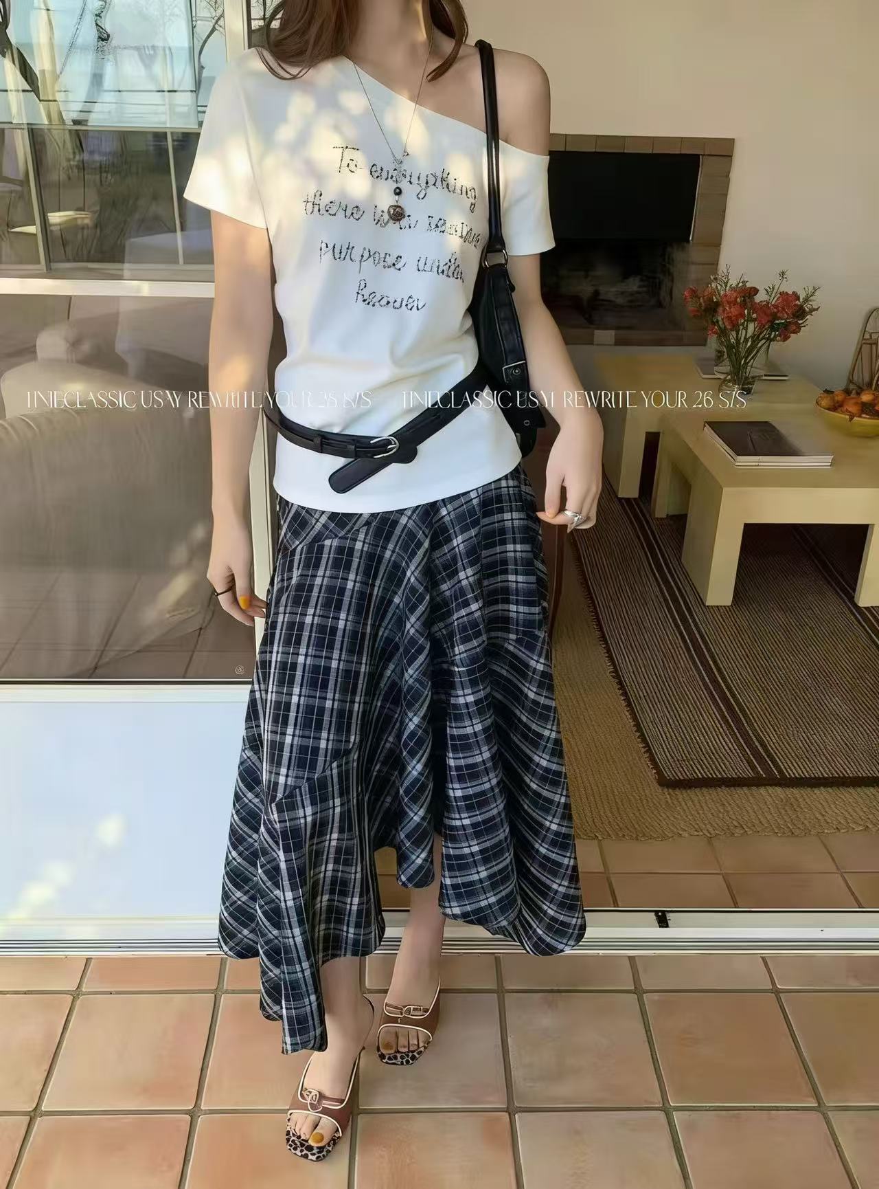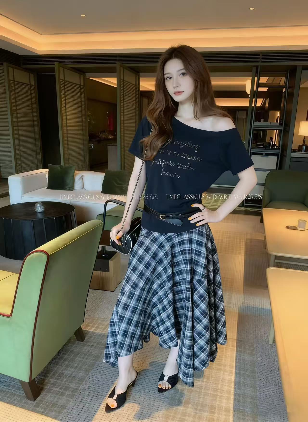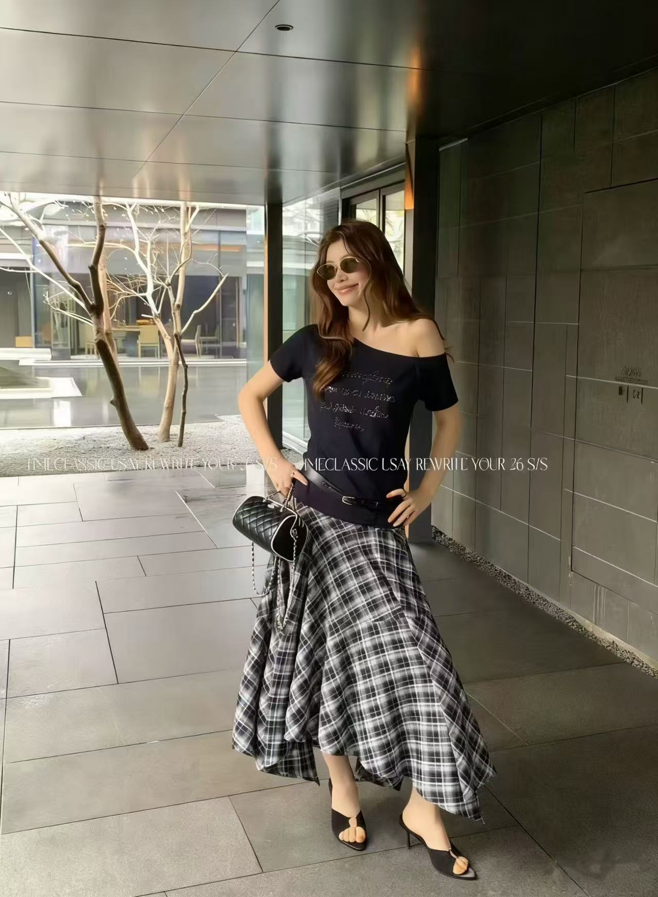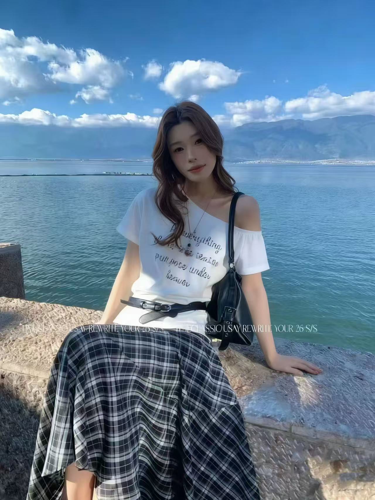 새로운 한국 스타일 패션 캐주얼 스트랩 반팔 맨위 허리밴드 슬림해 보이는 반신 롱 스커트 투피스 세트