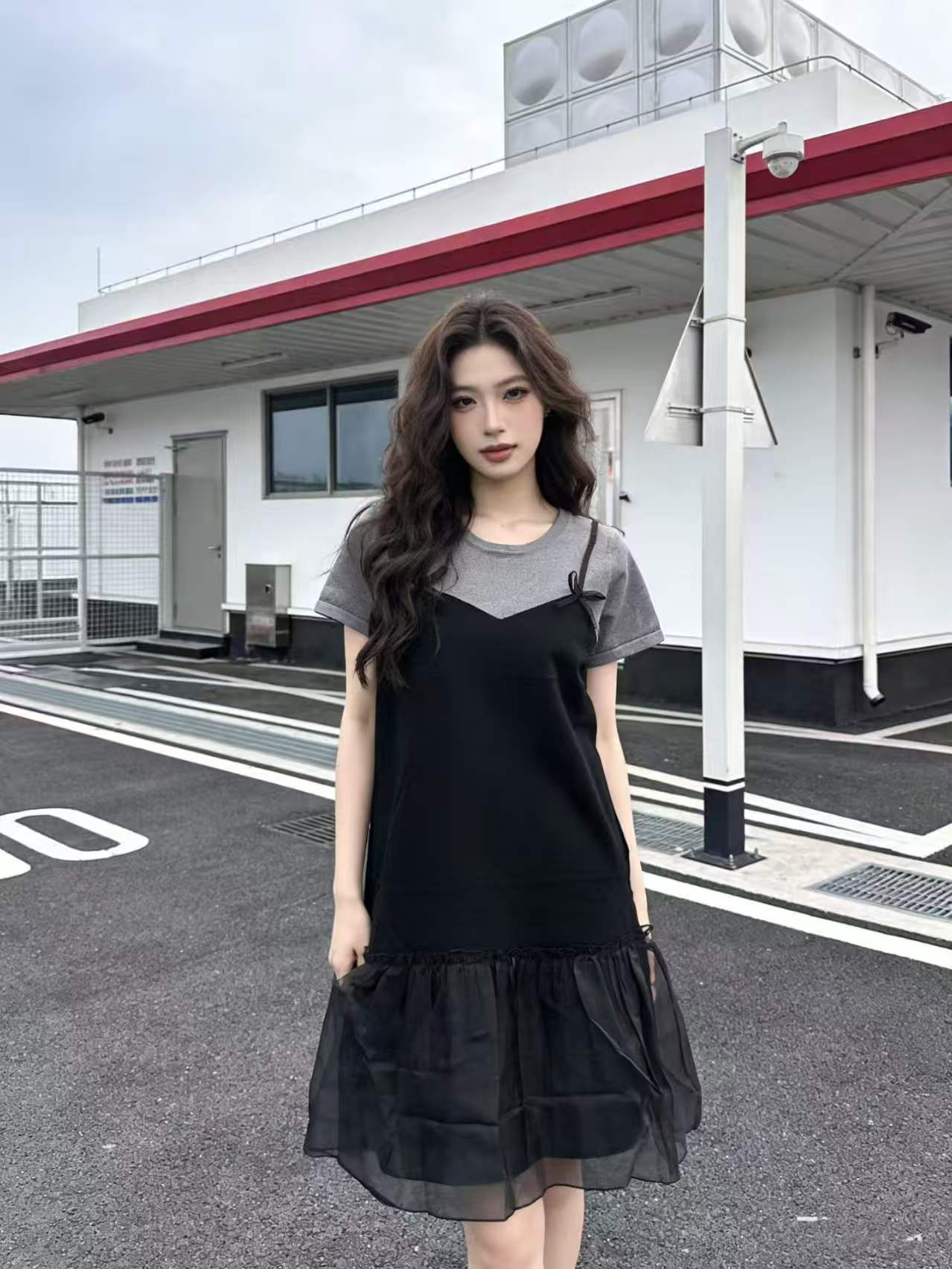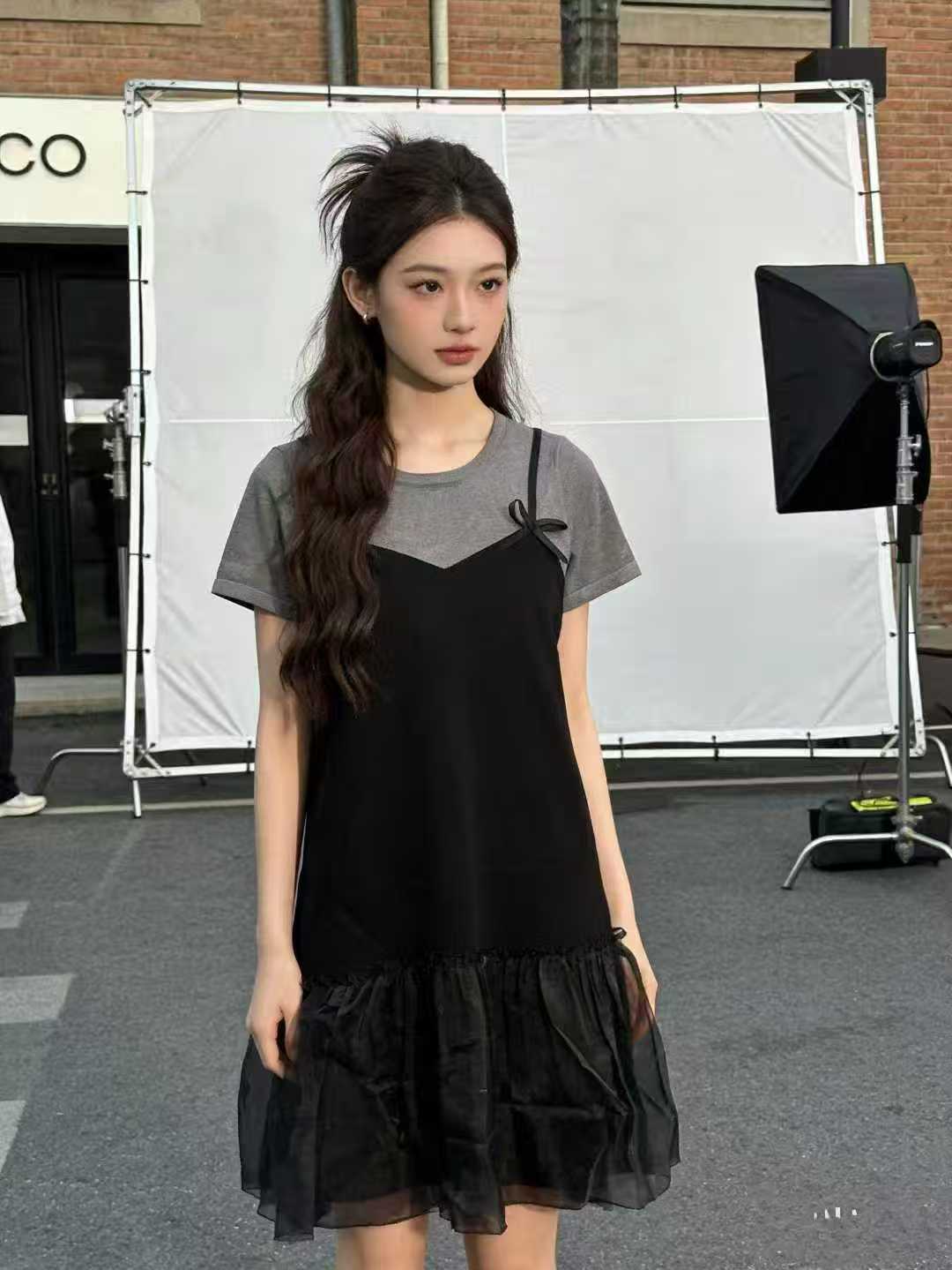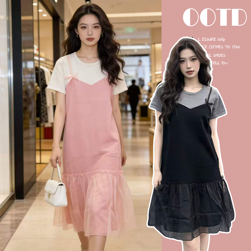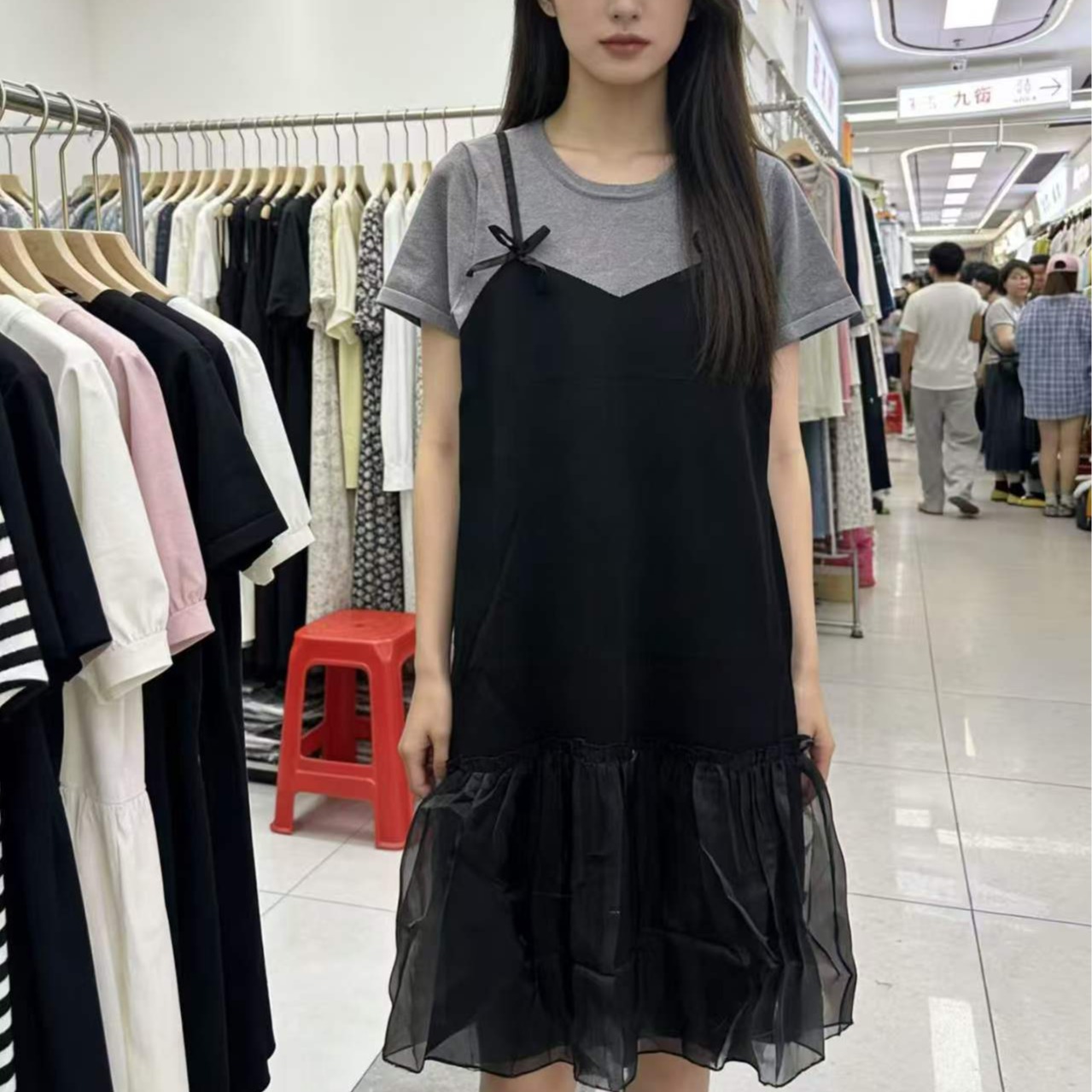 임산부 드레스 2026 여름 새로운 니트 망사 패치워크 루즈핏 페이크 레이어드 임산부 드레스