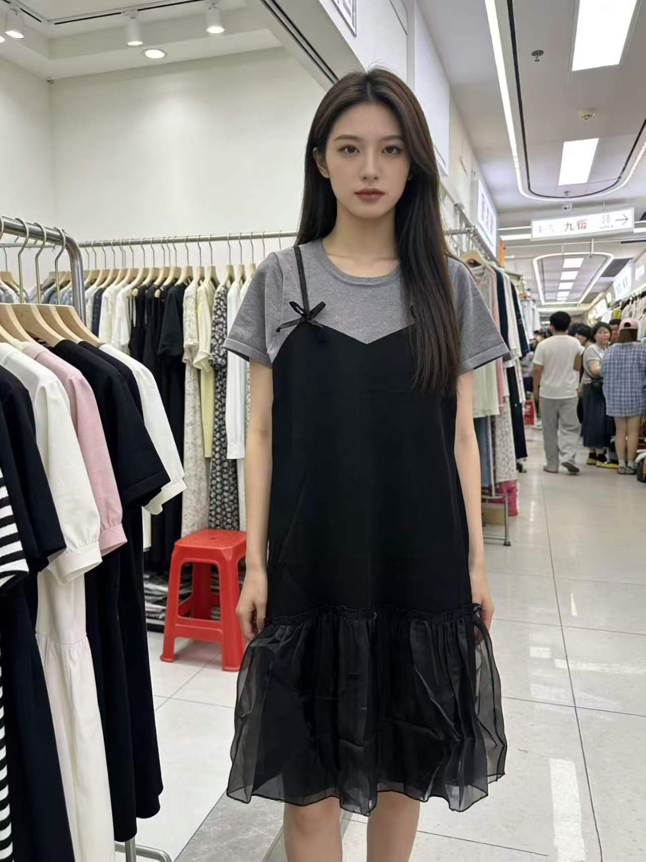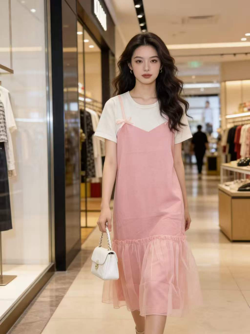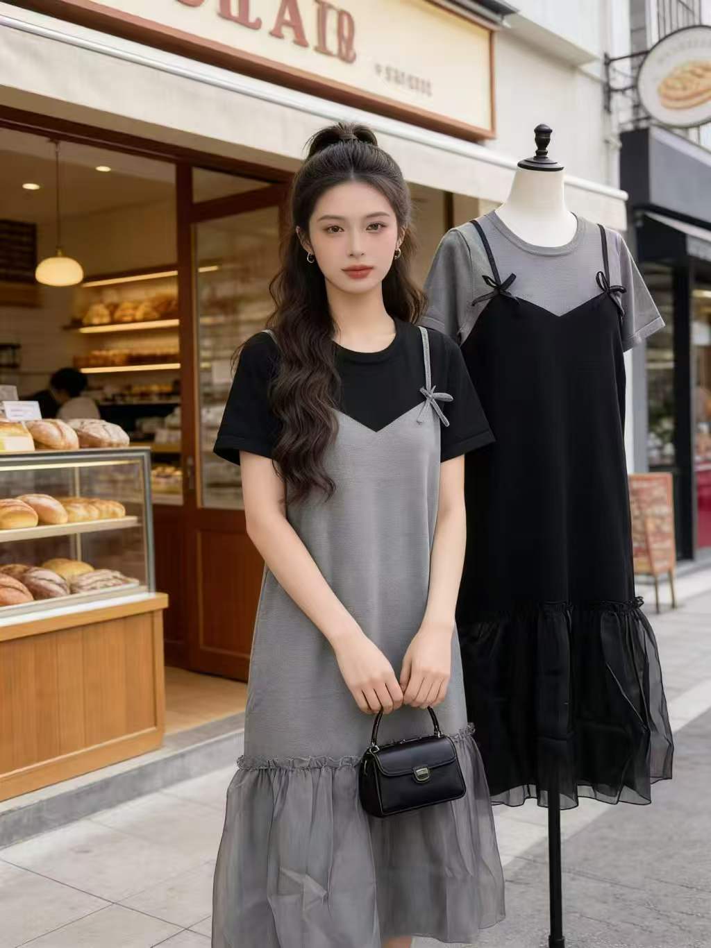 임산부 드레스 2026 여름 새로운 니트 망사 패치워크 루즈핏 페이크 레이어드 임산부 드레스
