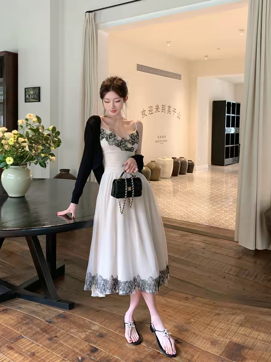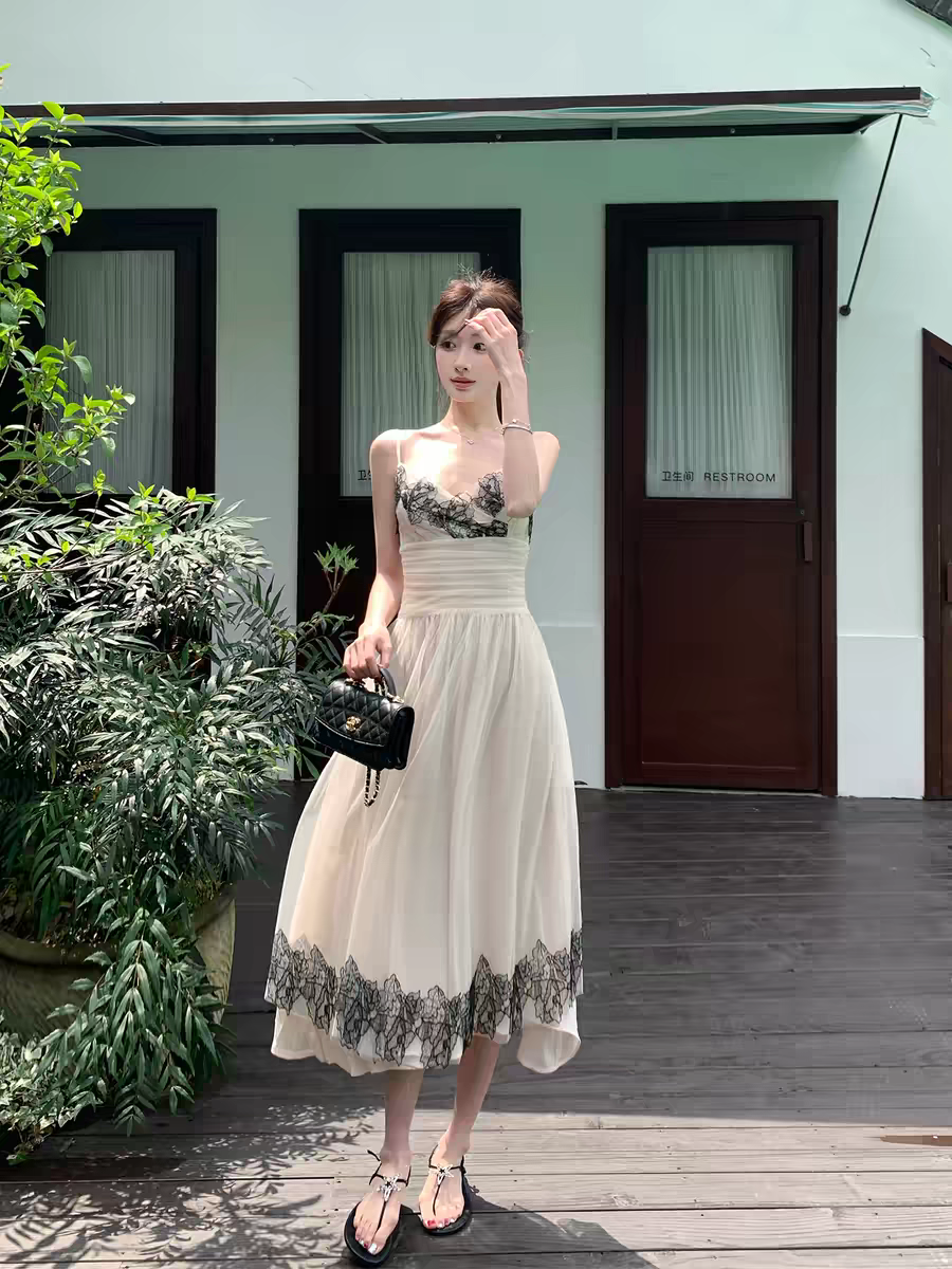 레이스 비밀 상황 섹시함 레이스 슬립 드레스 프랑스식 레이스 조각 허리 수축 망사 여성 드레스
