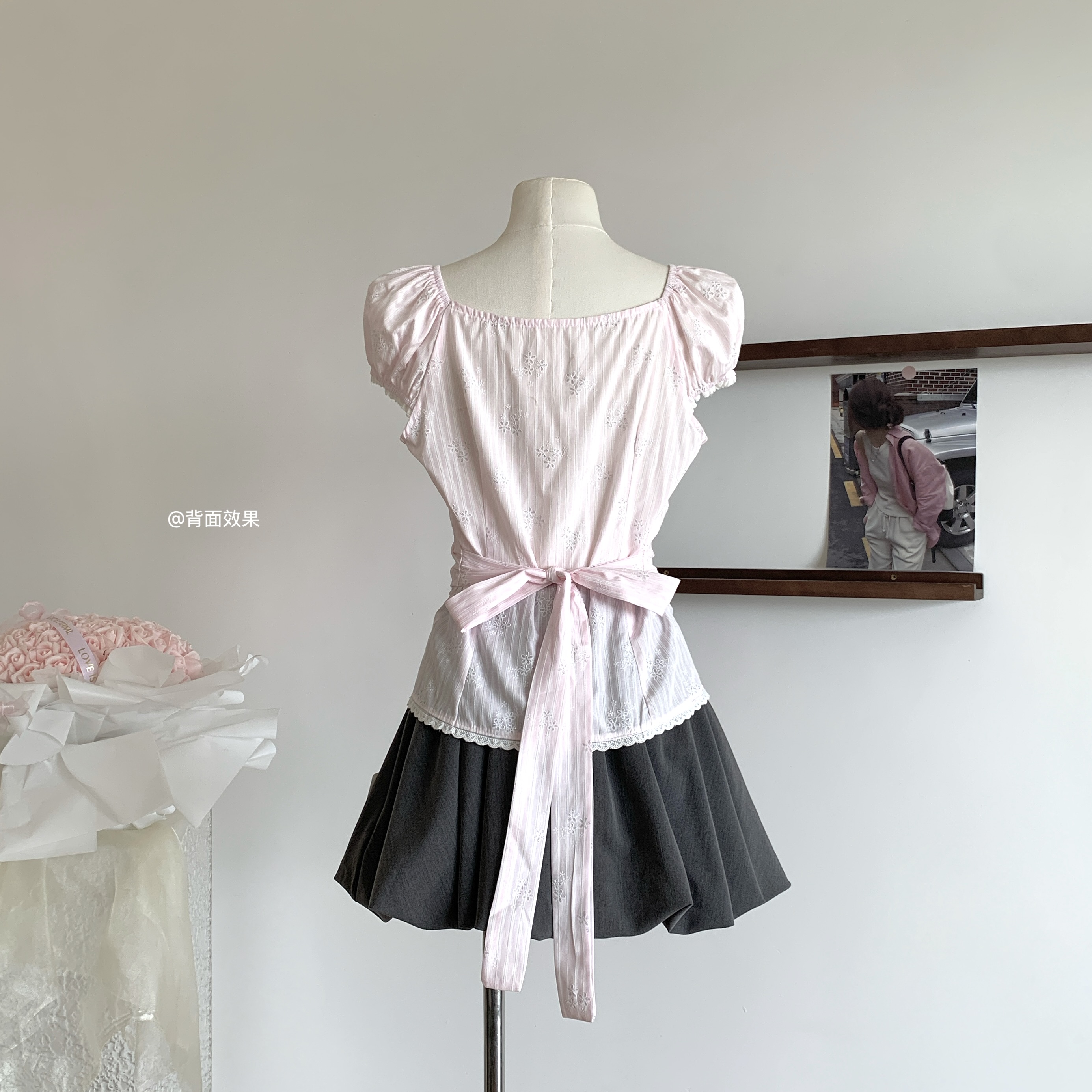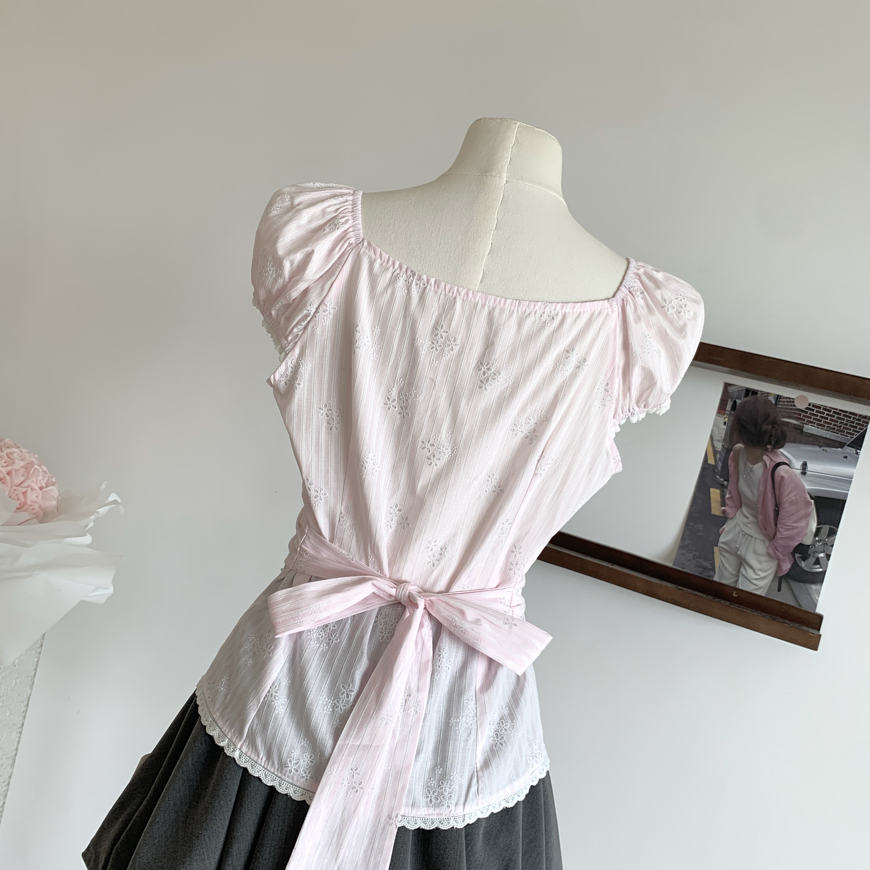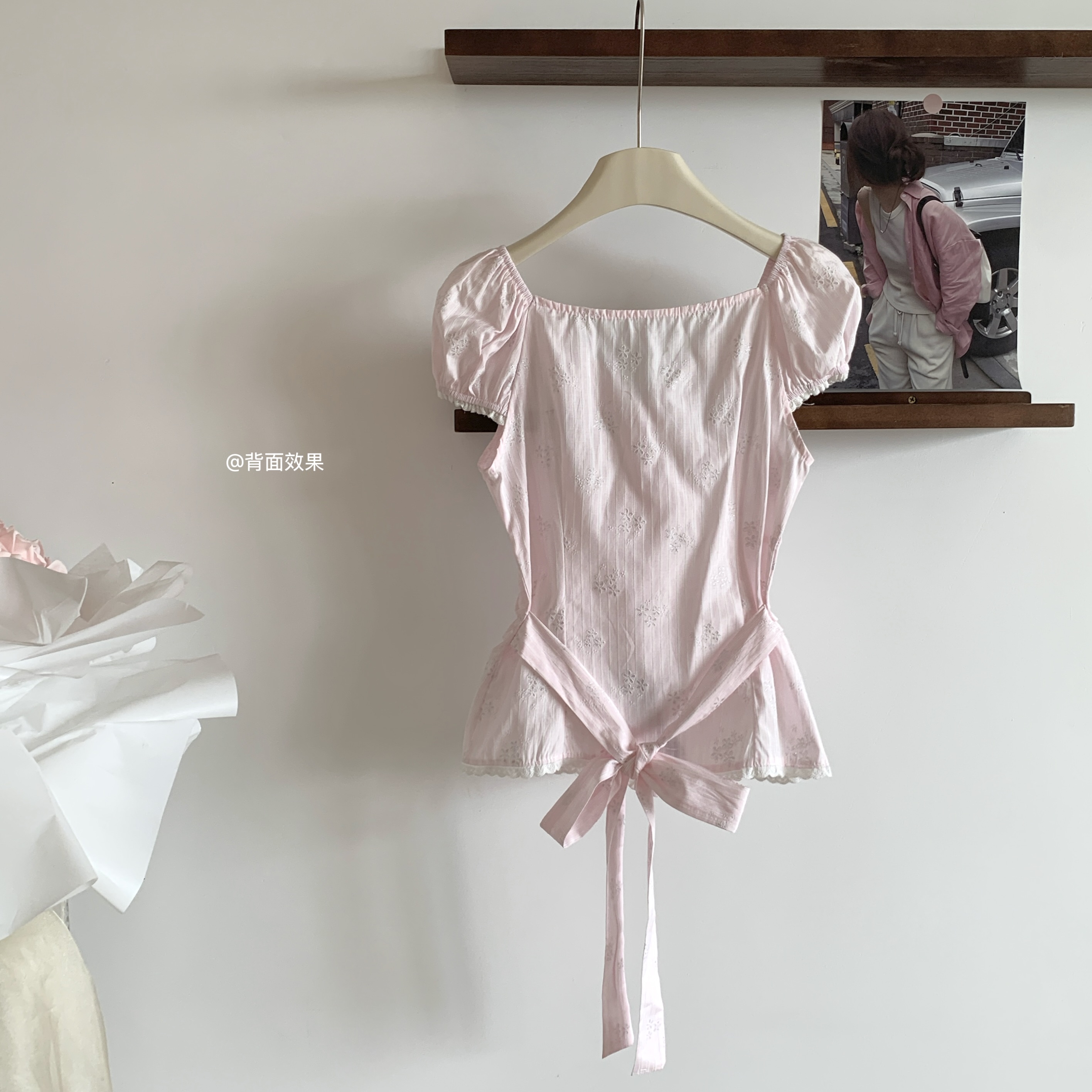 popwest 丨 홀로우 아웃 광장 칼라 오프숄더 거품 소매 작은 셔츠 나비 매듭 레이스 셔츠 여성 셔츠
