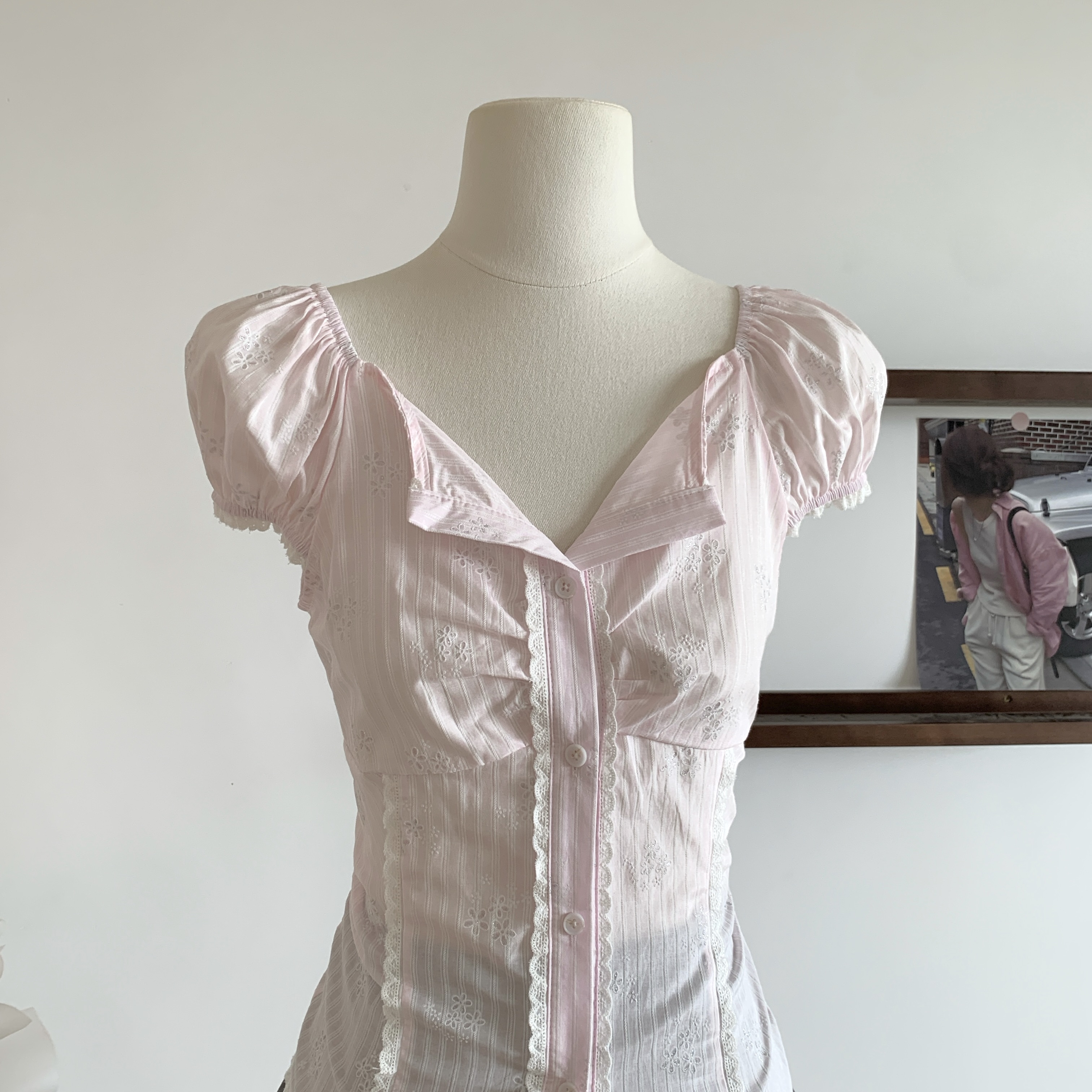실사 새로운 중식 국풍 반팔 셔츠 2026 여름 새로운 여성 몸매 가꾸기 허리 수축 거품 소매 레이스 쉬폰 블라우스