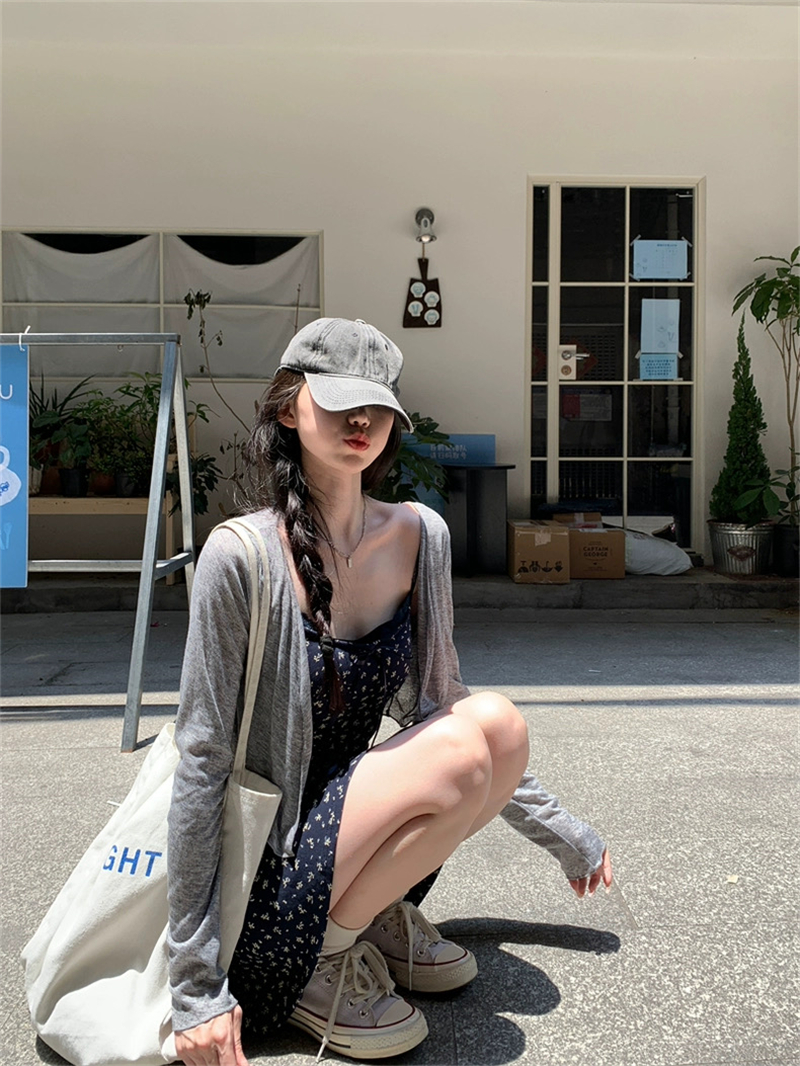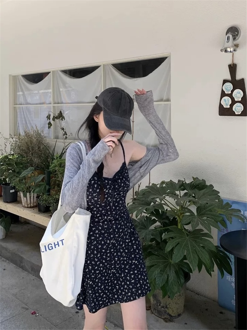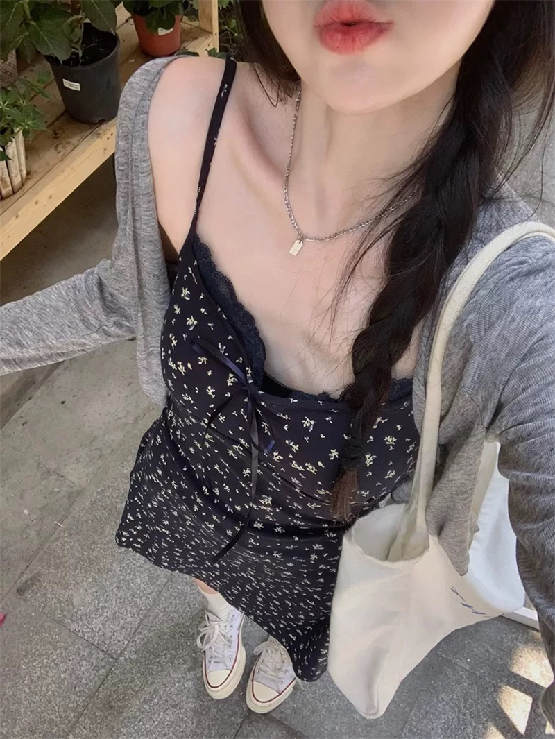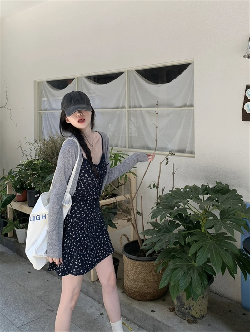 달콤한 핫걸 세트 얇은 스타일 긴팔 회색 카디건 코트 여름 꽃무늬 슬립 드레스 미니 스커트 투피스 세트