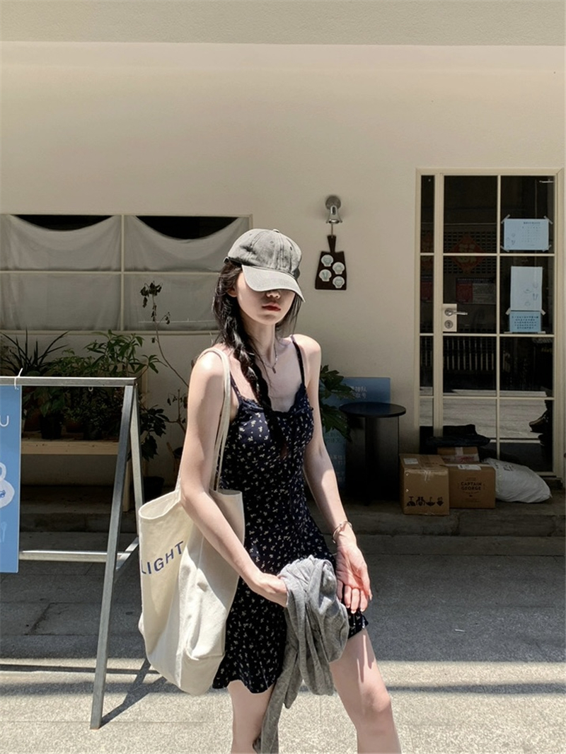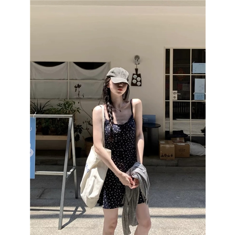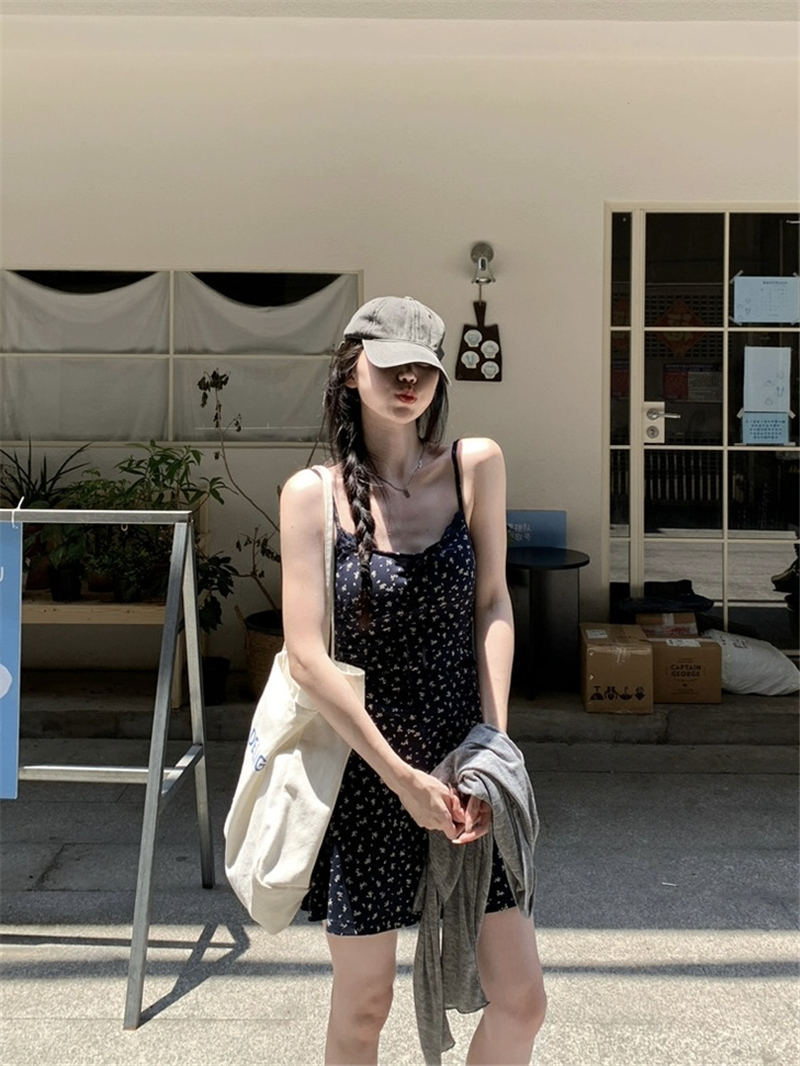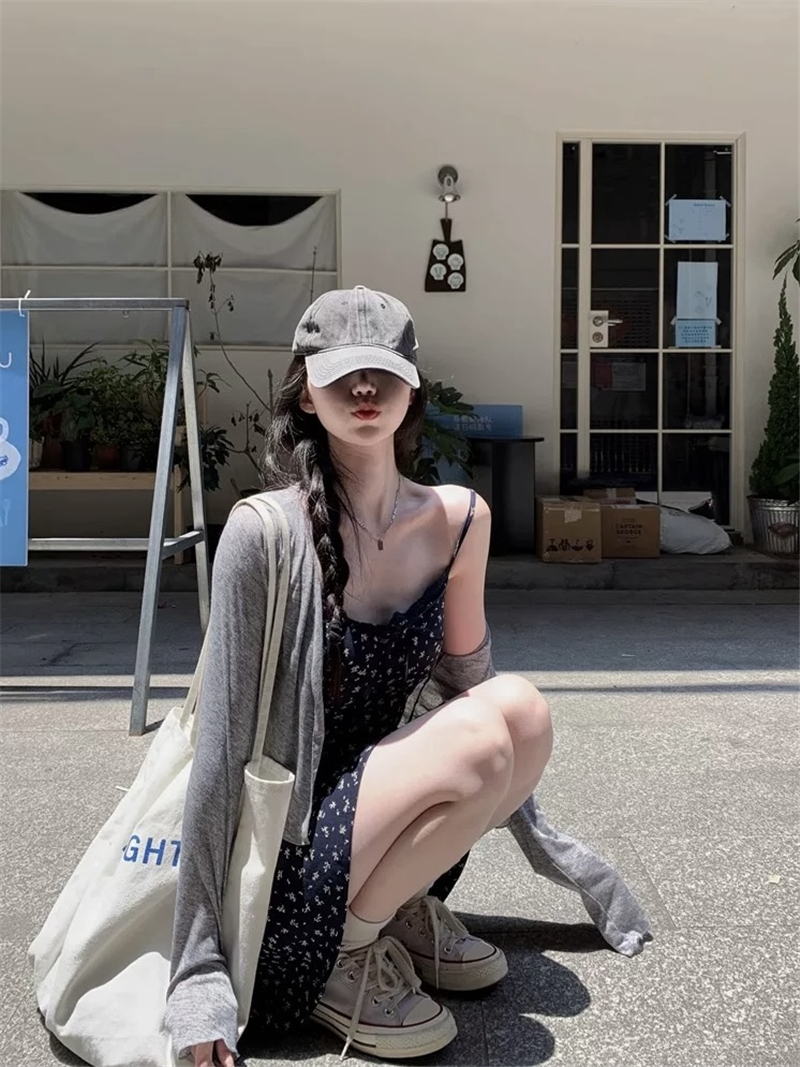 달콤한 핫걸 세트 얇은 스타일 긴팔 회색 카디건 코트 여름 꽃무늬 슬립 드레스 미니 스커트 투피스 세트