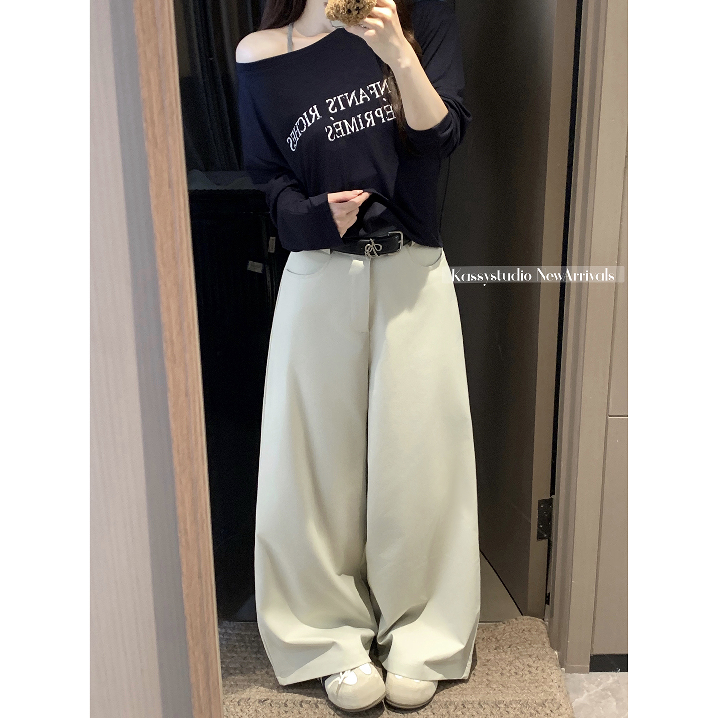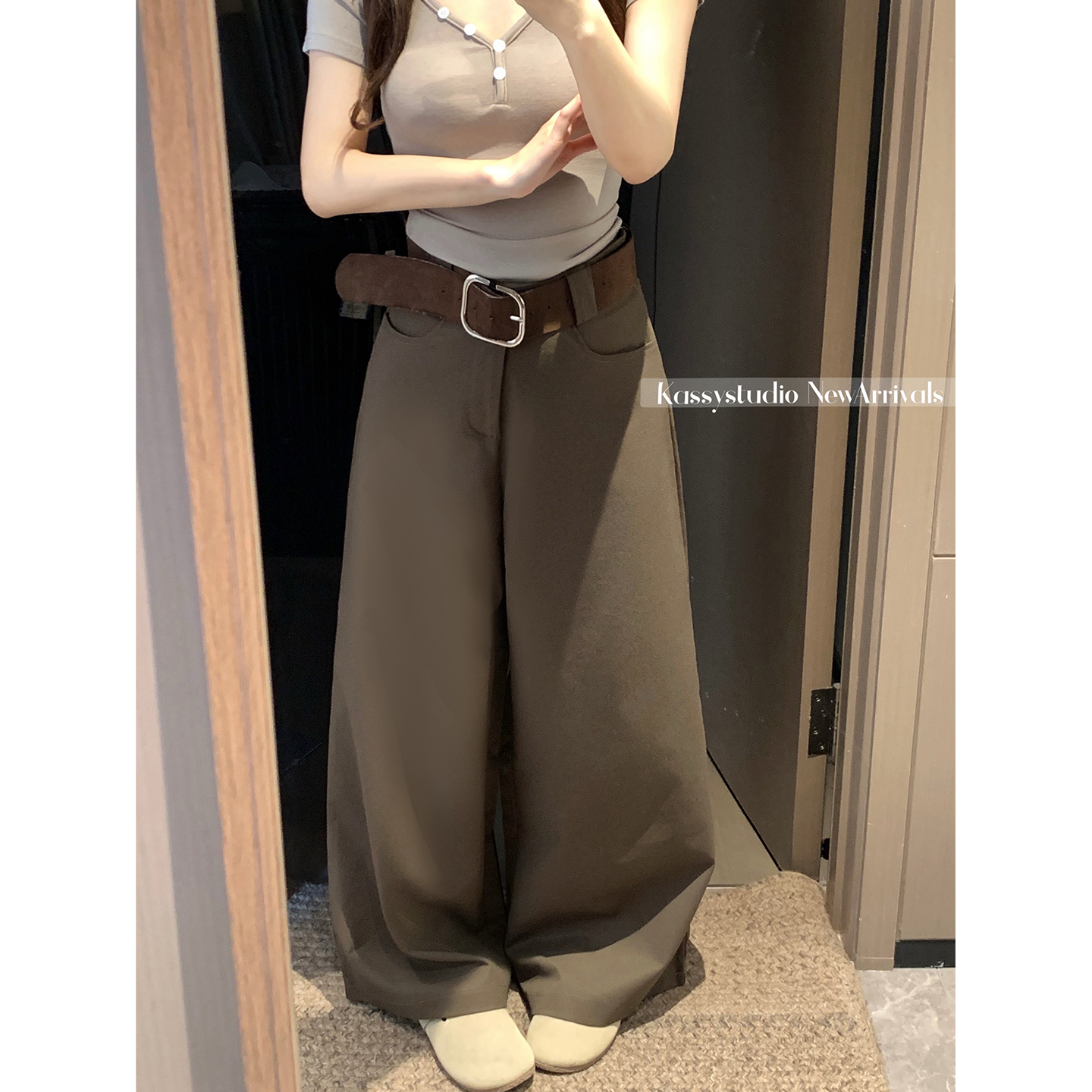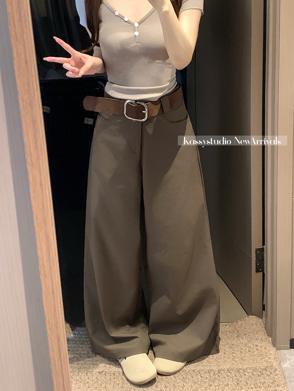 실사 2026 루즈핏 개성 정장 바지 캐주얼 바지 여성 와이드 레그 팬츠 하이웨이스트 도루 센스 바닥 청소 바지