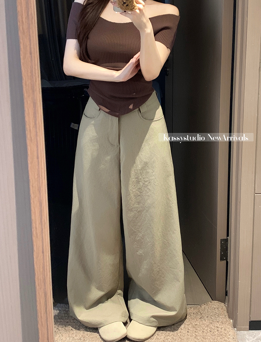 실사 새로운 허리밴드 슬림해 보이는 캐주얼 바지 여성 루즈핏 와이드 레그 팬츠