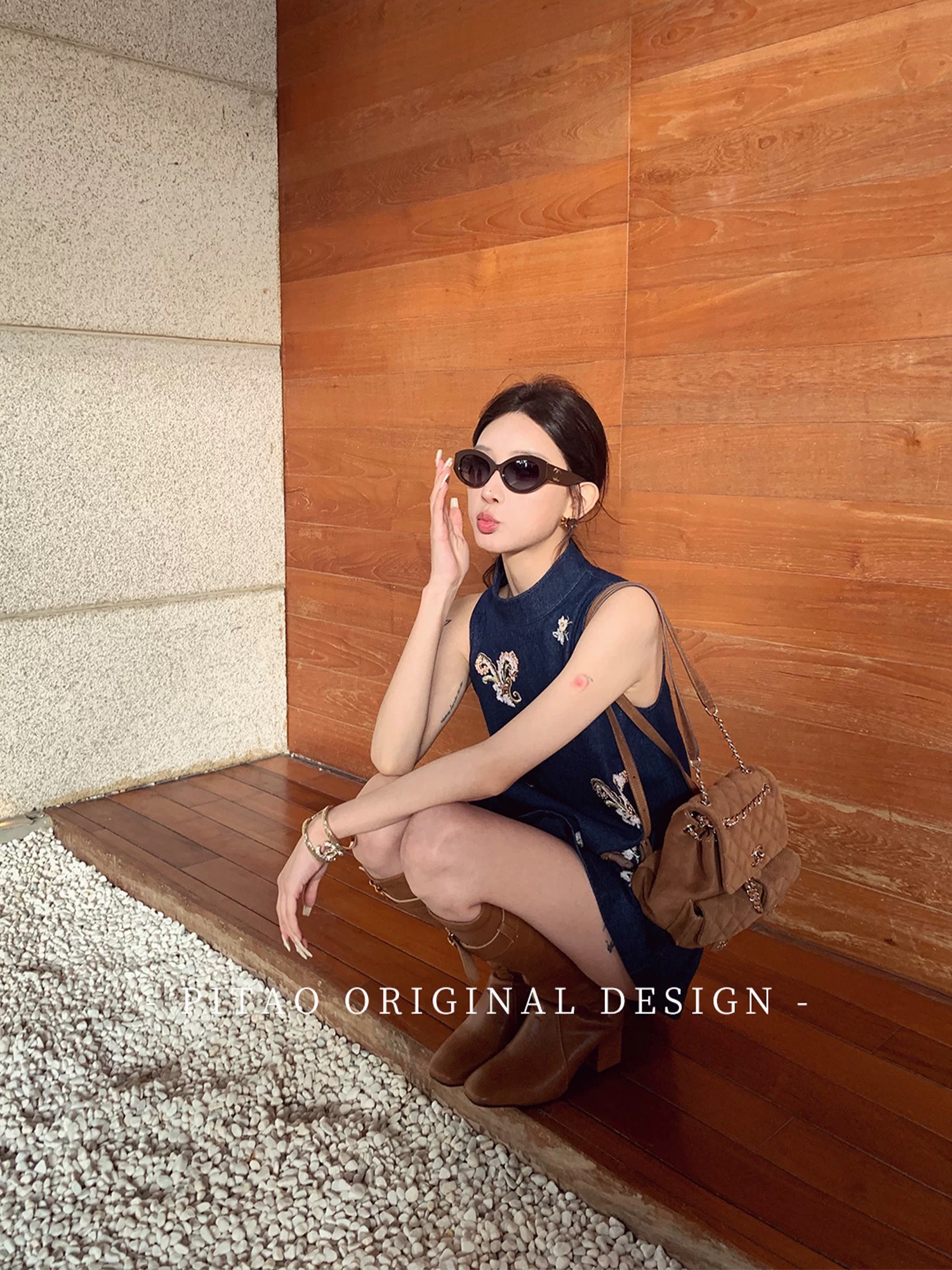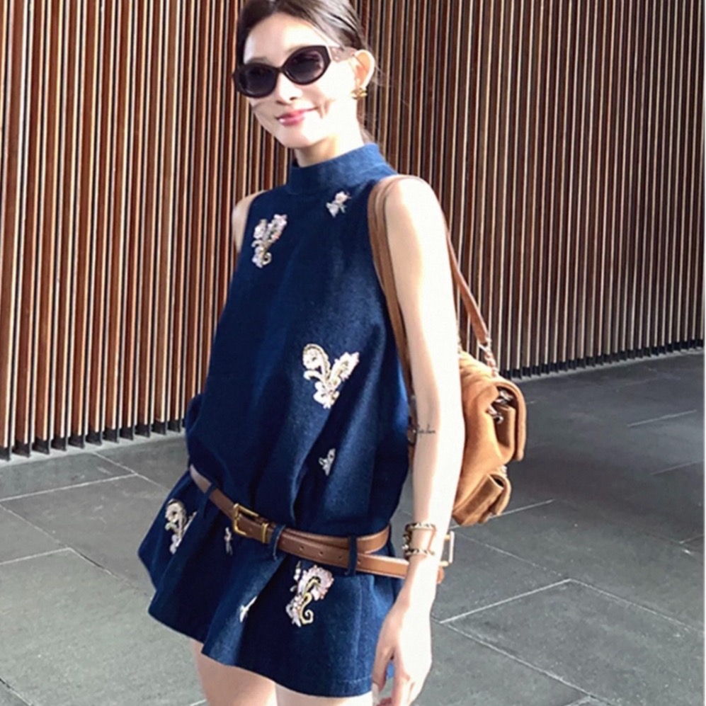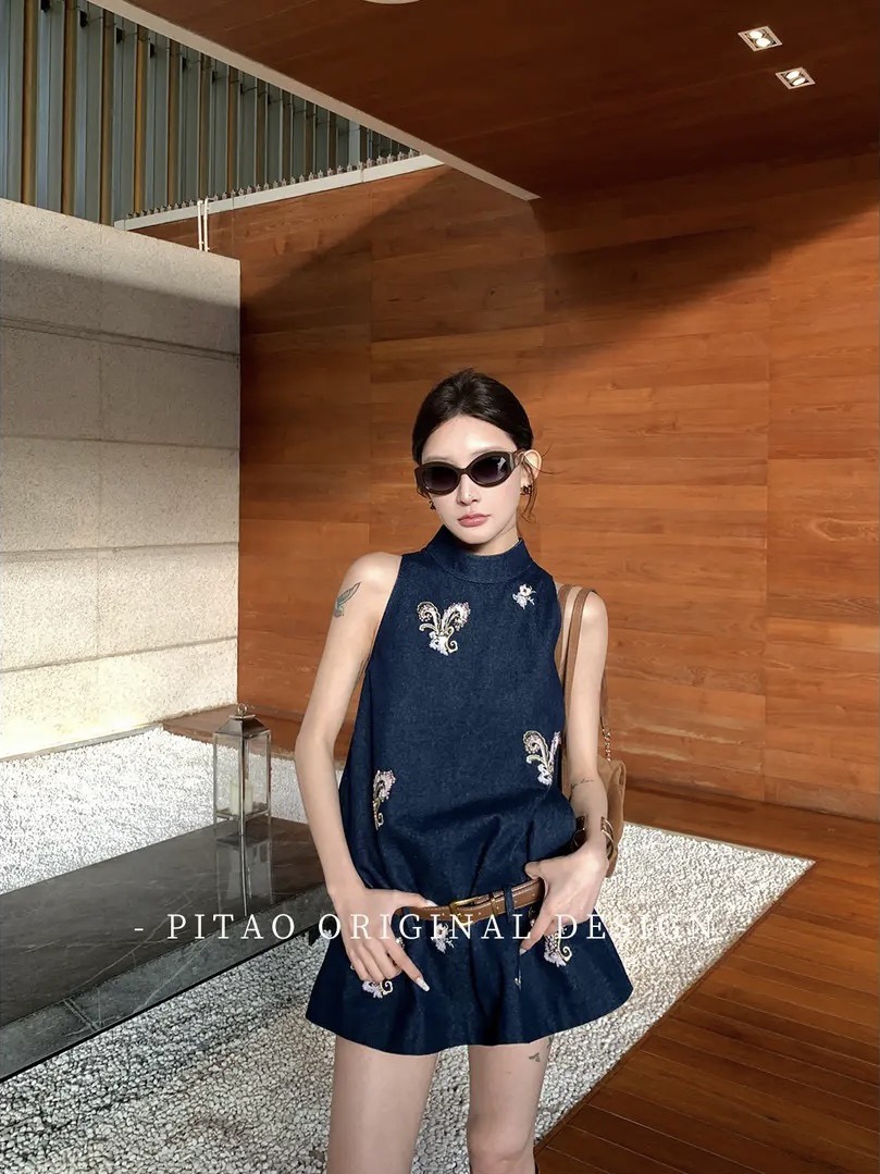 Du 엉덩이 복숭아 오리지널 휴일 마드리드 봄 아모이 중식 국풍 자수 면 소재 데님 민소매 맨위 반바지