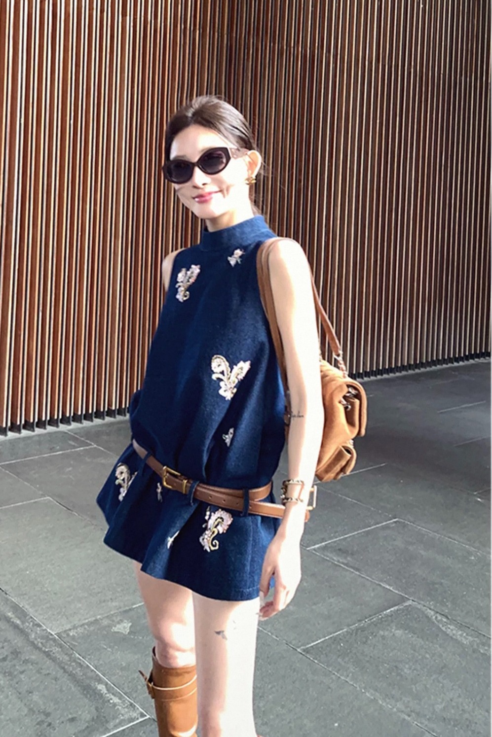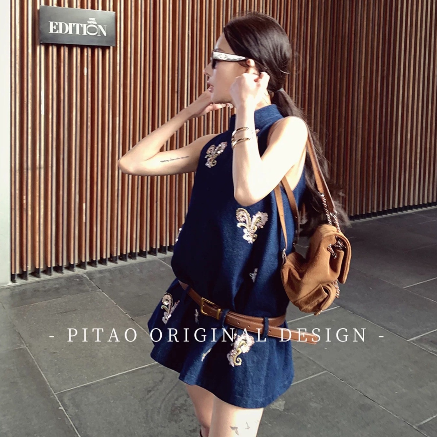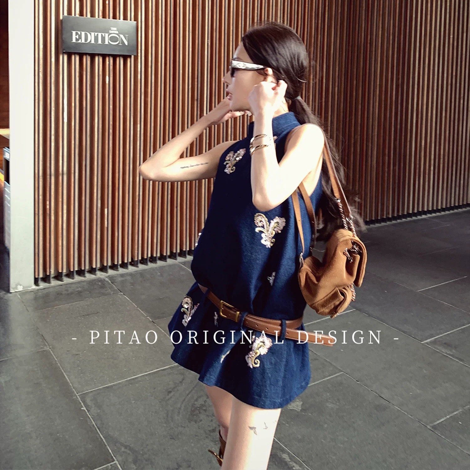 Du 엉덩이 복숭아 오리지널 휴일 마드리드 봄 아모이 중식 국풍 자수 면 소재 데님 민소매 맨위 반바지