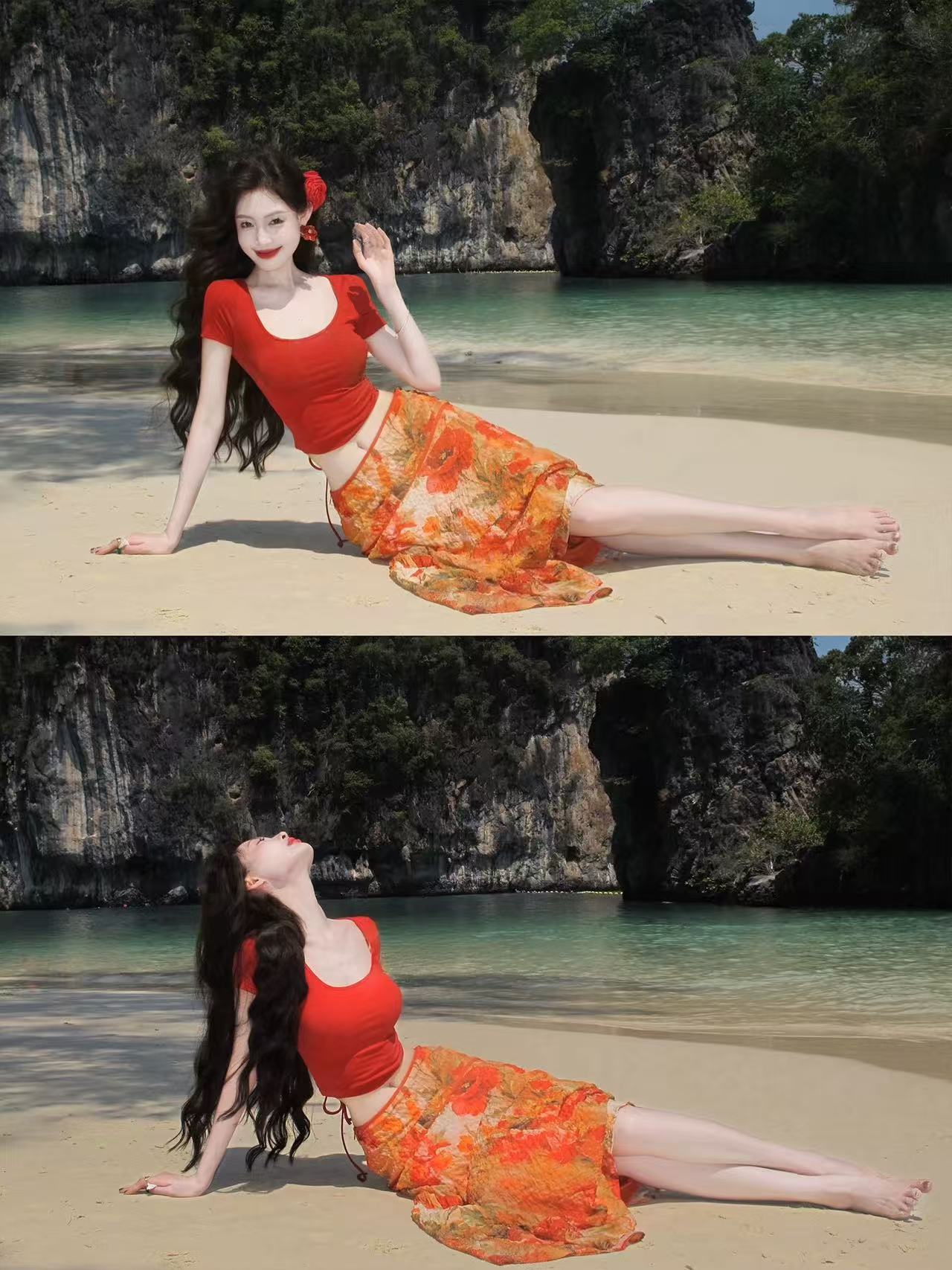 먹는다. 녹색 접시 화상 여름 레트로 Mingyan 분위기 빨간색 티셔츠 맨위 유화 대 꽃 반신 치마 세트