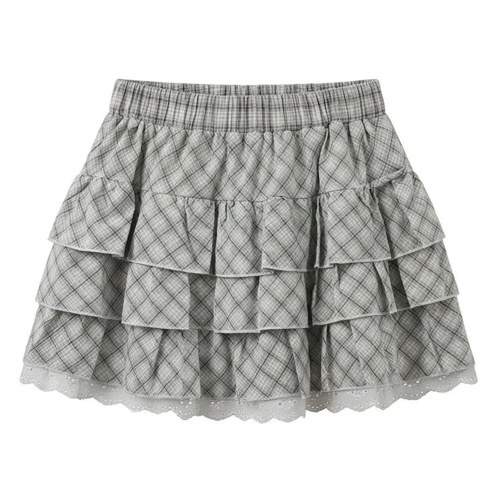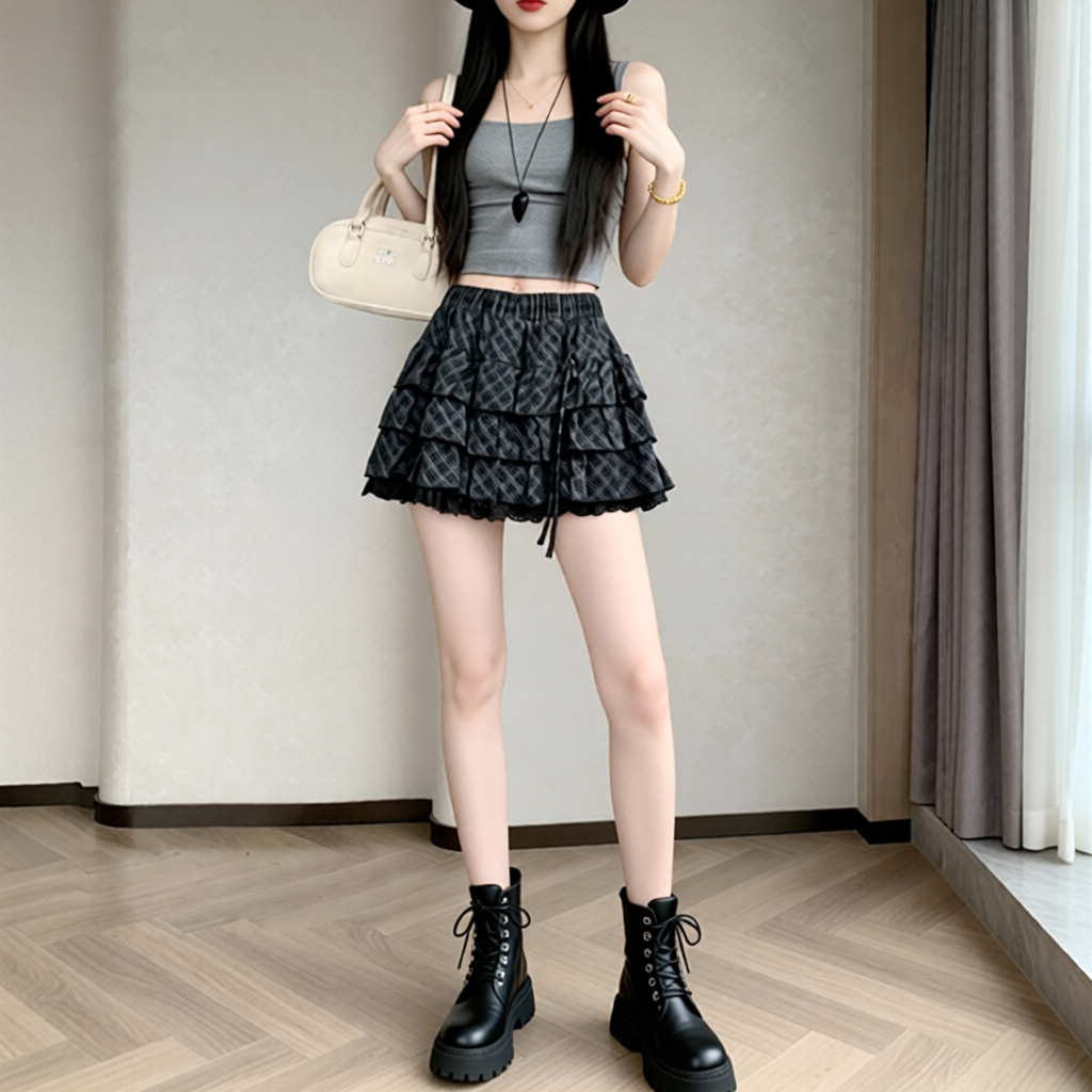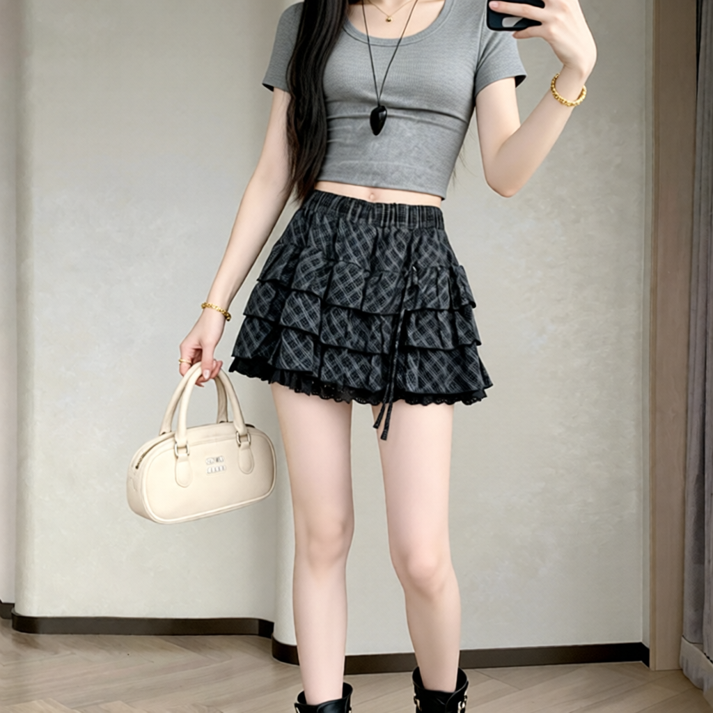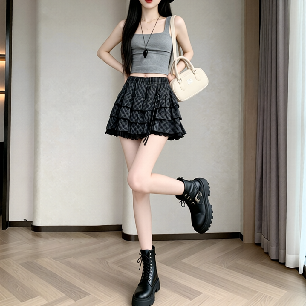 실사 2026 새로운 체크무늬 케이크 드레스 반신 스커트 패션 몸매 가꾸기 한국 스타일 신선함 퍼프 스커트