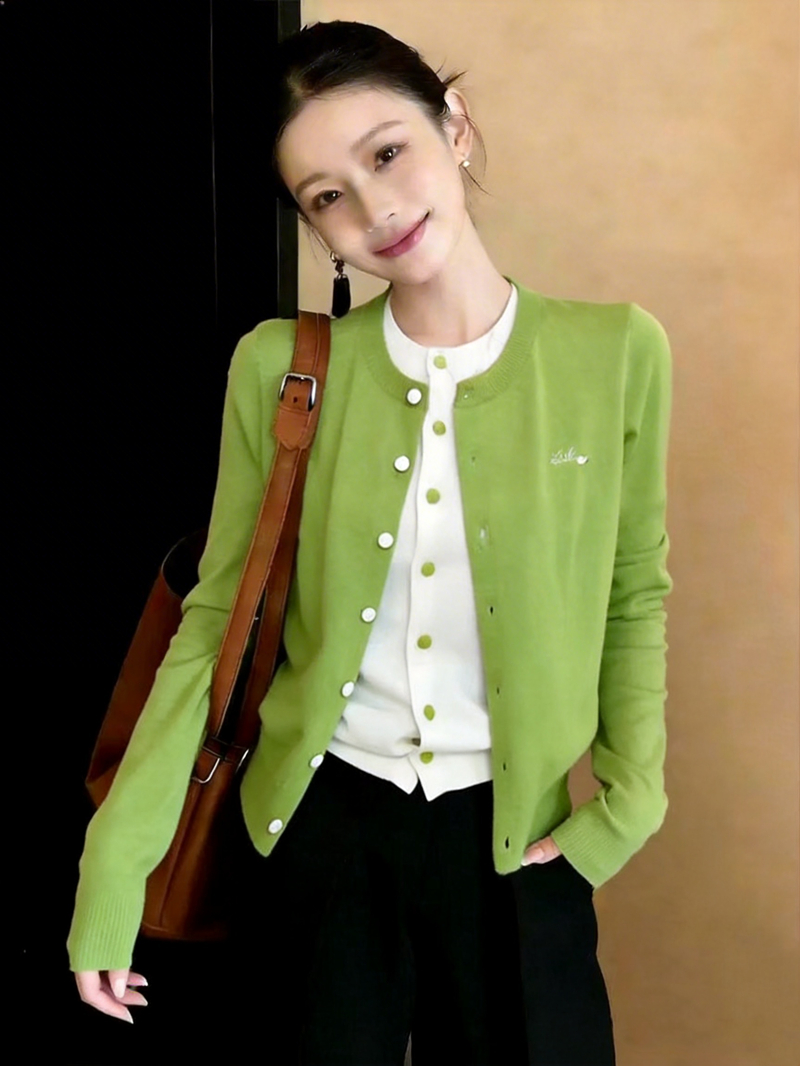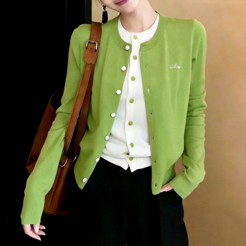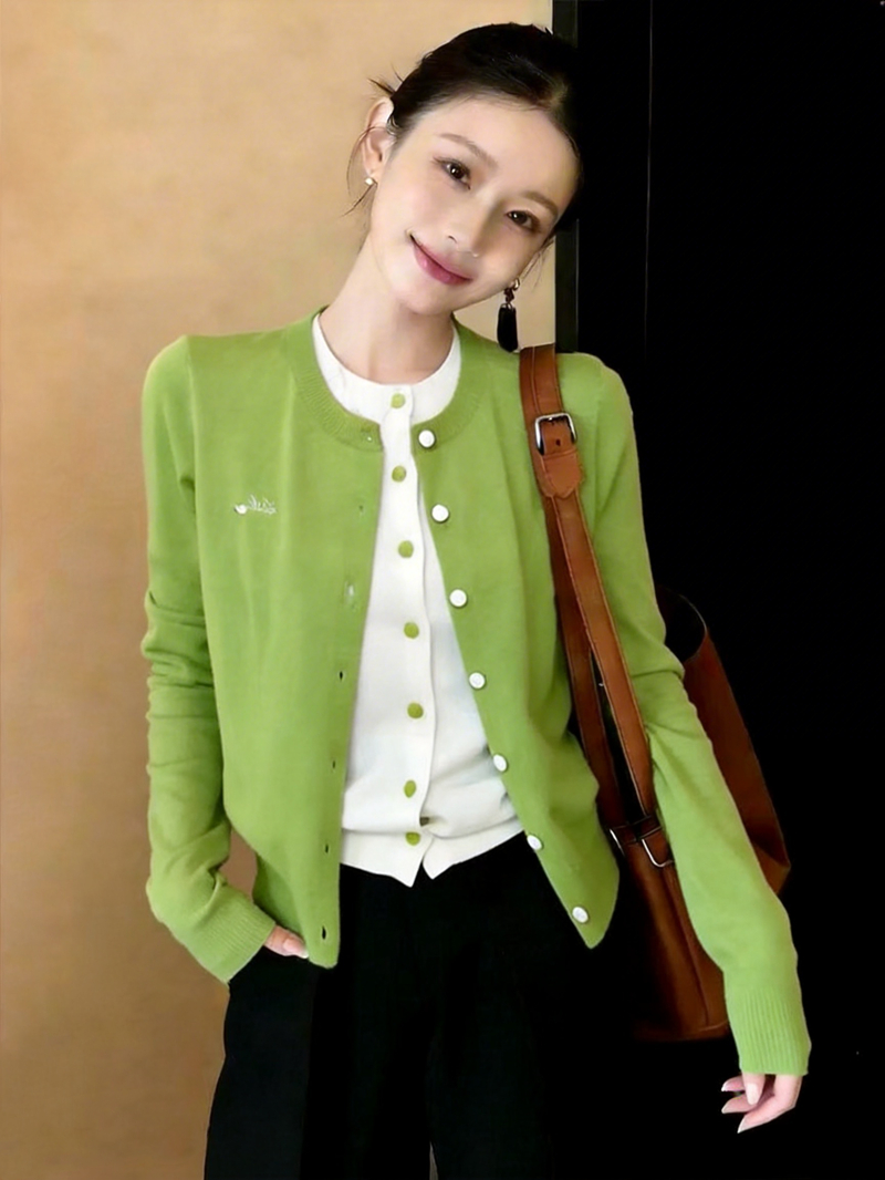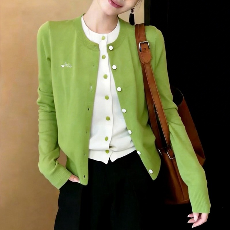 녹색 패치워크 페이크 레이어드 니트 오픈 가디건 여성 2026 년 봄 여름 새로운 한 부서 품격 캐주얼 연령 감소 맨위