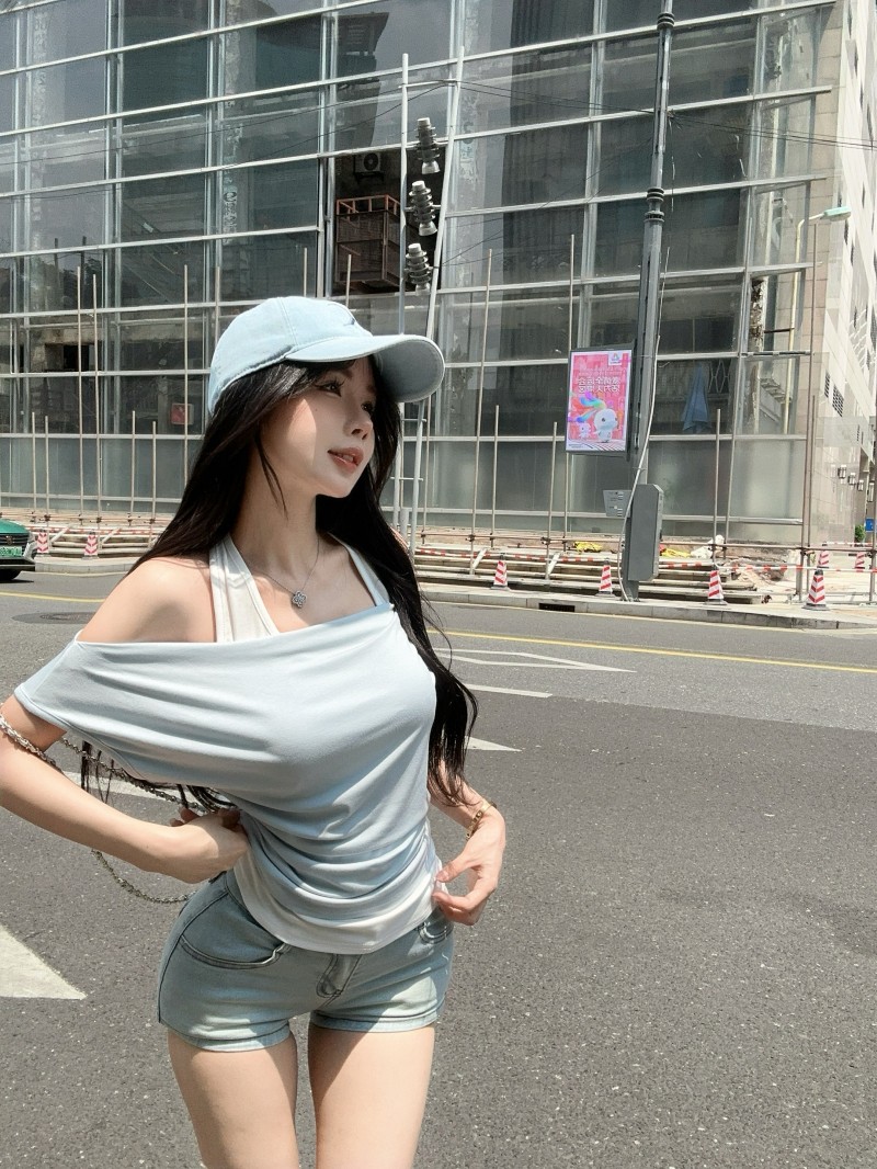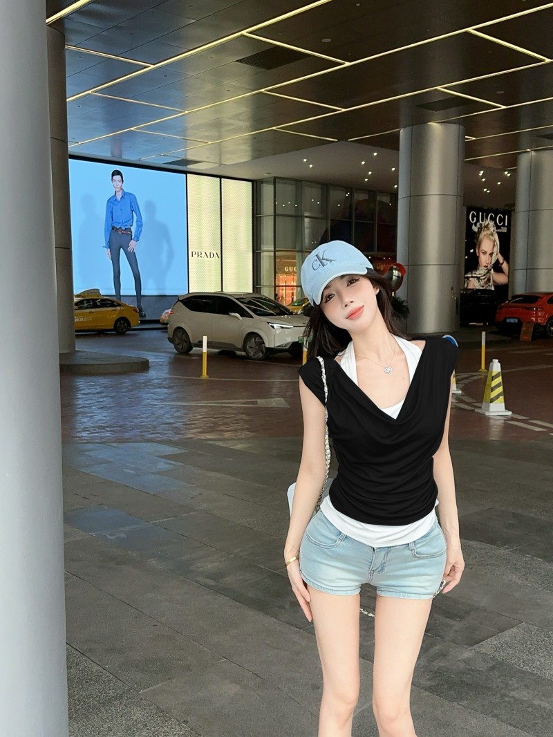 실사 정가 감소되지 않음 티셔츠 여성 의류 디자인 센스 작은 대중 불규칙 광장 칼라 타이트 쇼트 스타일 반팔 맨위