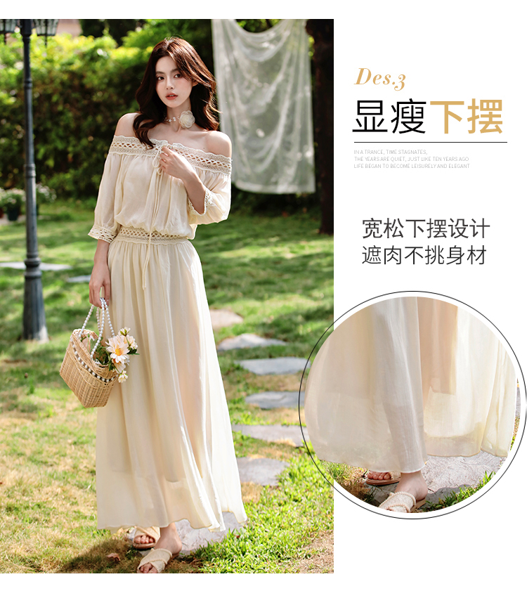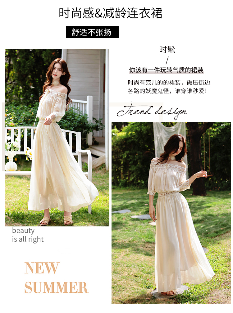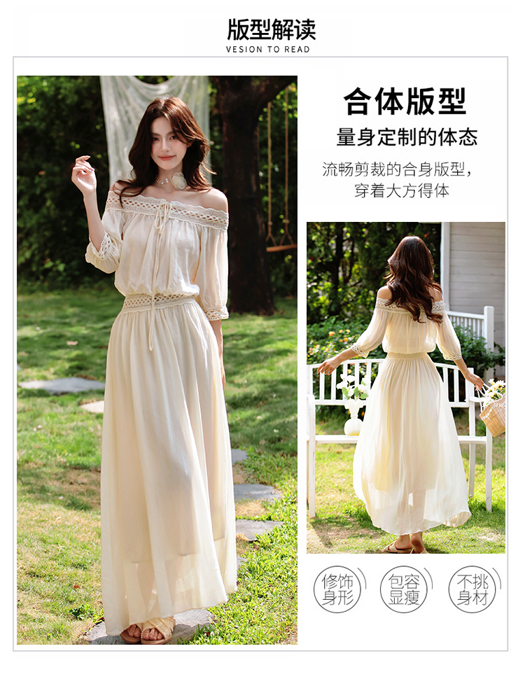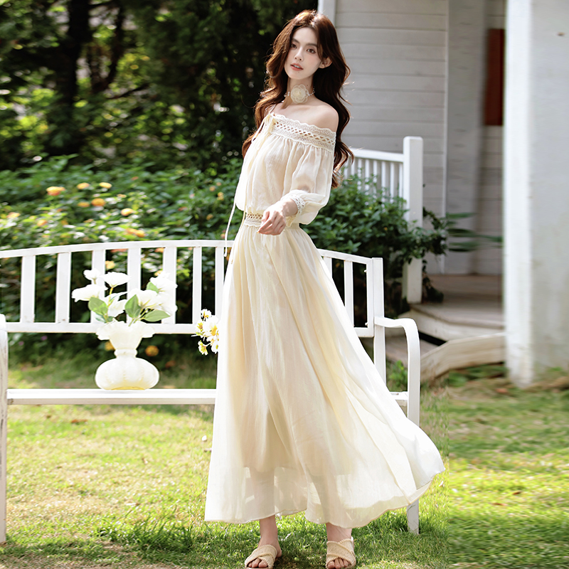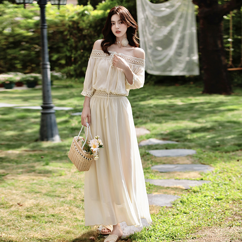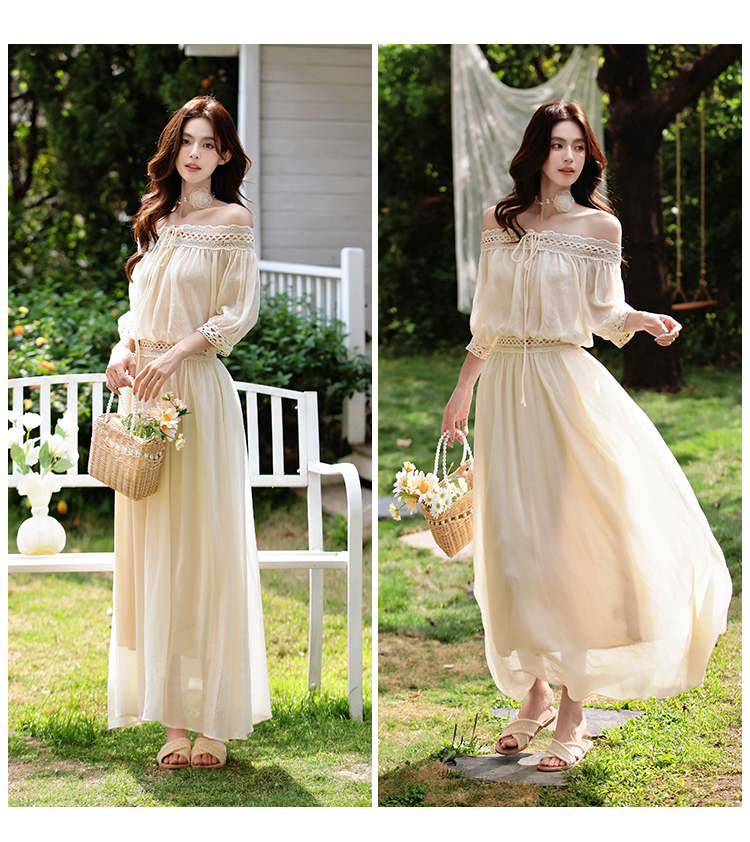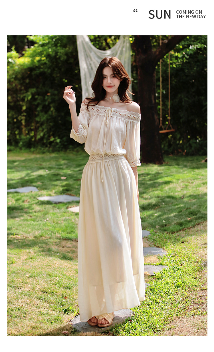 실사 2026 여름 새로운 부드러운 느긋한 오프숄더 디자인 센스 홀로우 아웃 레이스 롱 코트 휴가 바람 투피스 세트