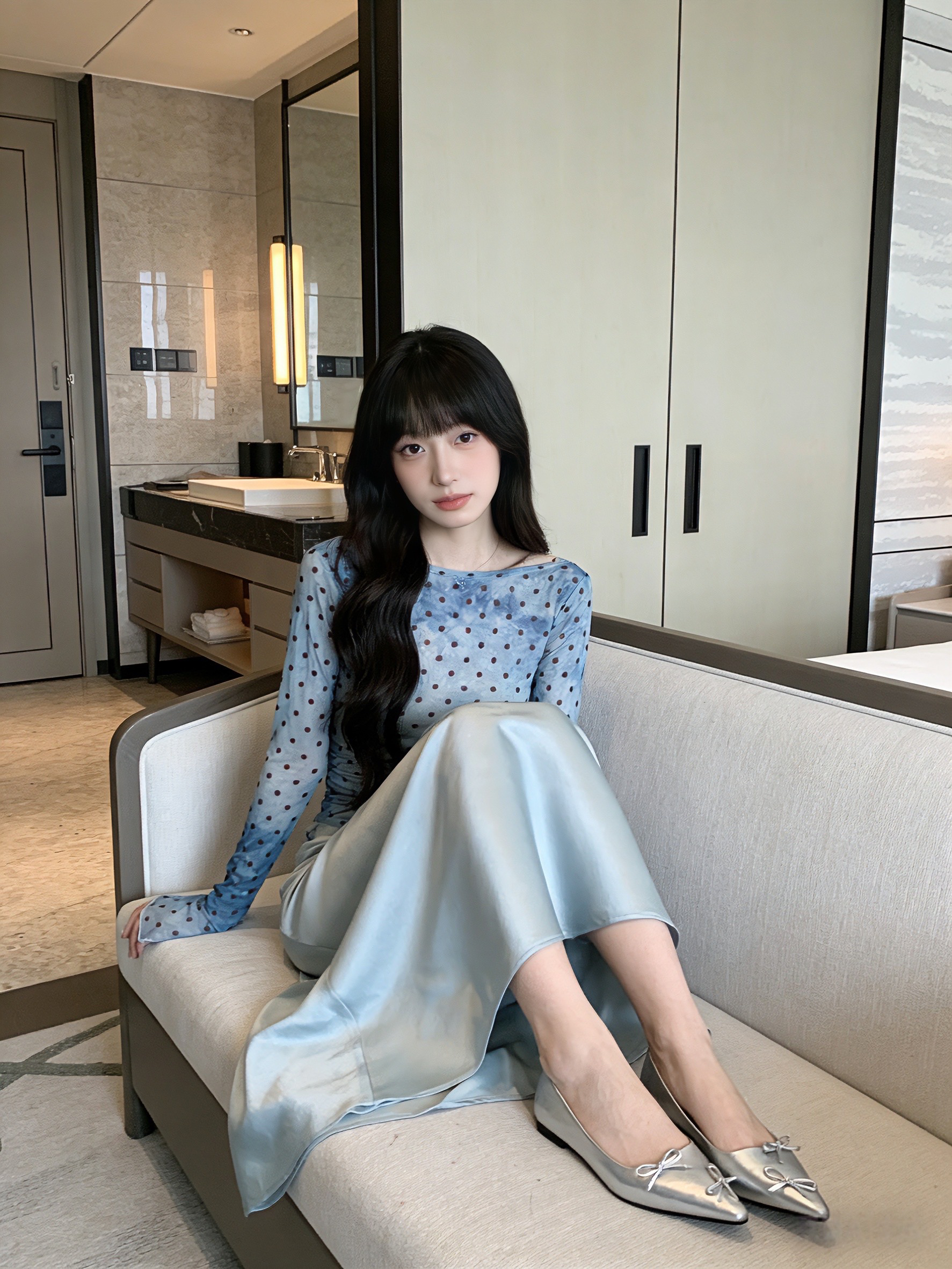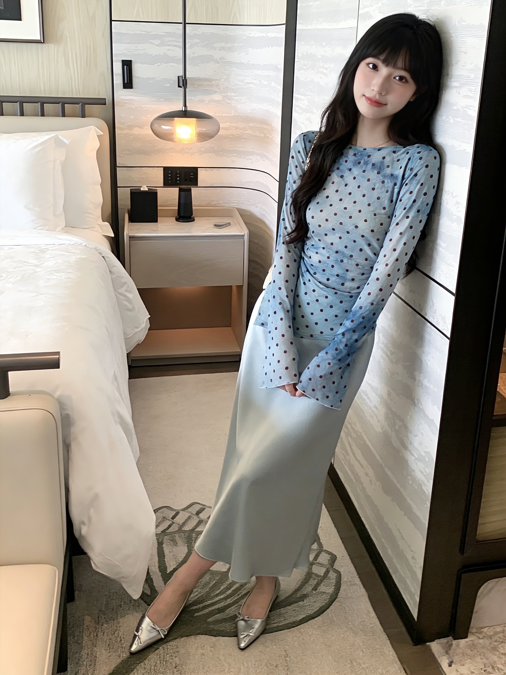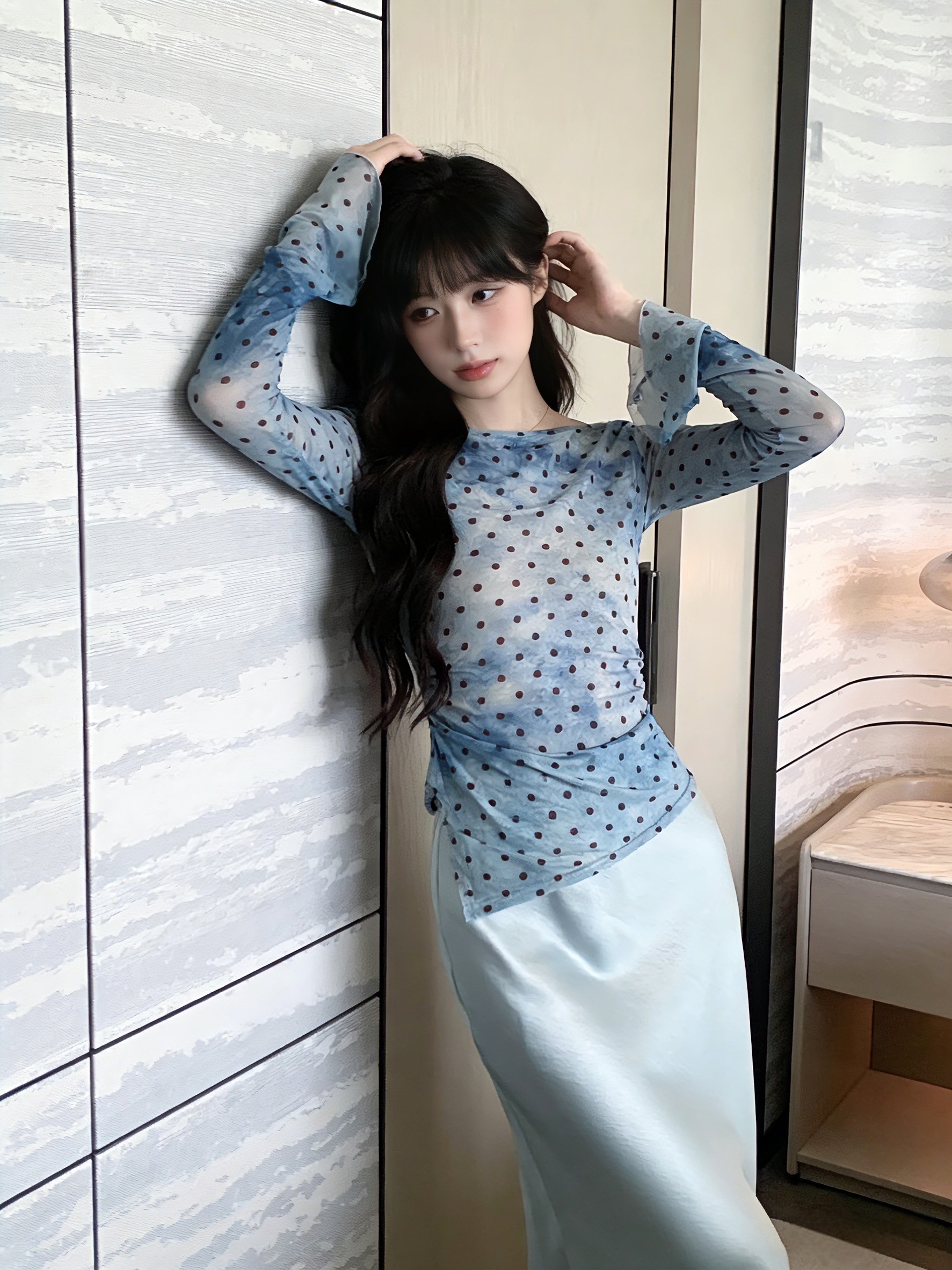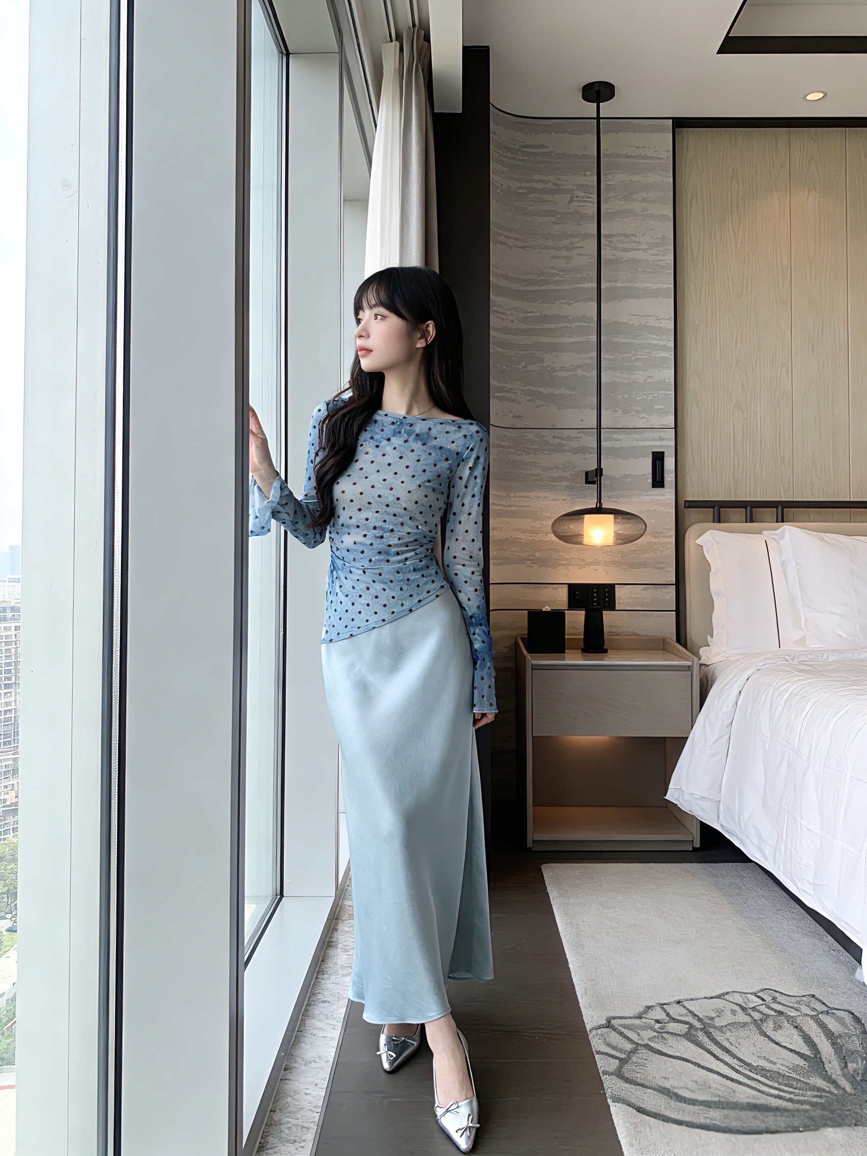 실사 2026 새로운 여성 의류 패션 도트 무늬 망사 자외선 차단 몸매 가꾸기 슬림해 보이는 맨위 새틴 파란색 반신 스커트 한