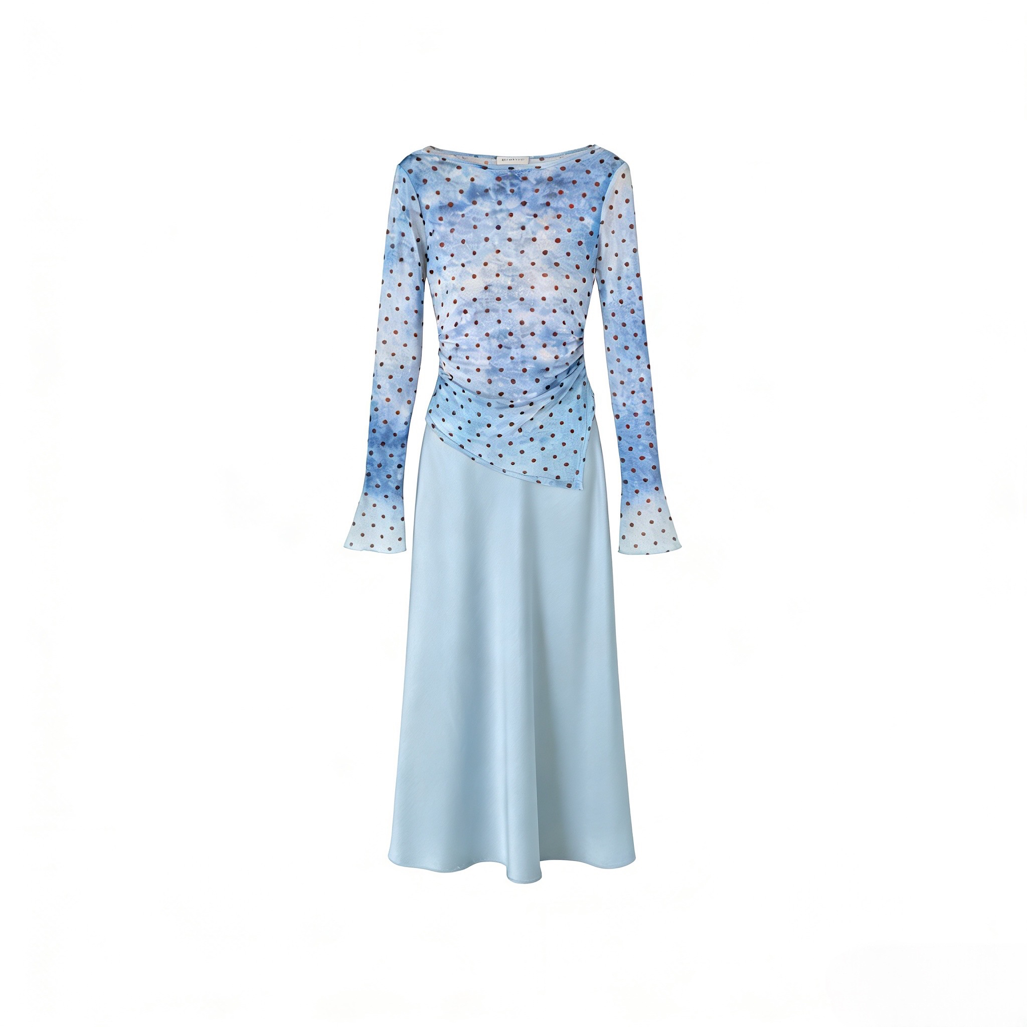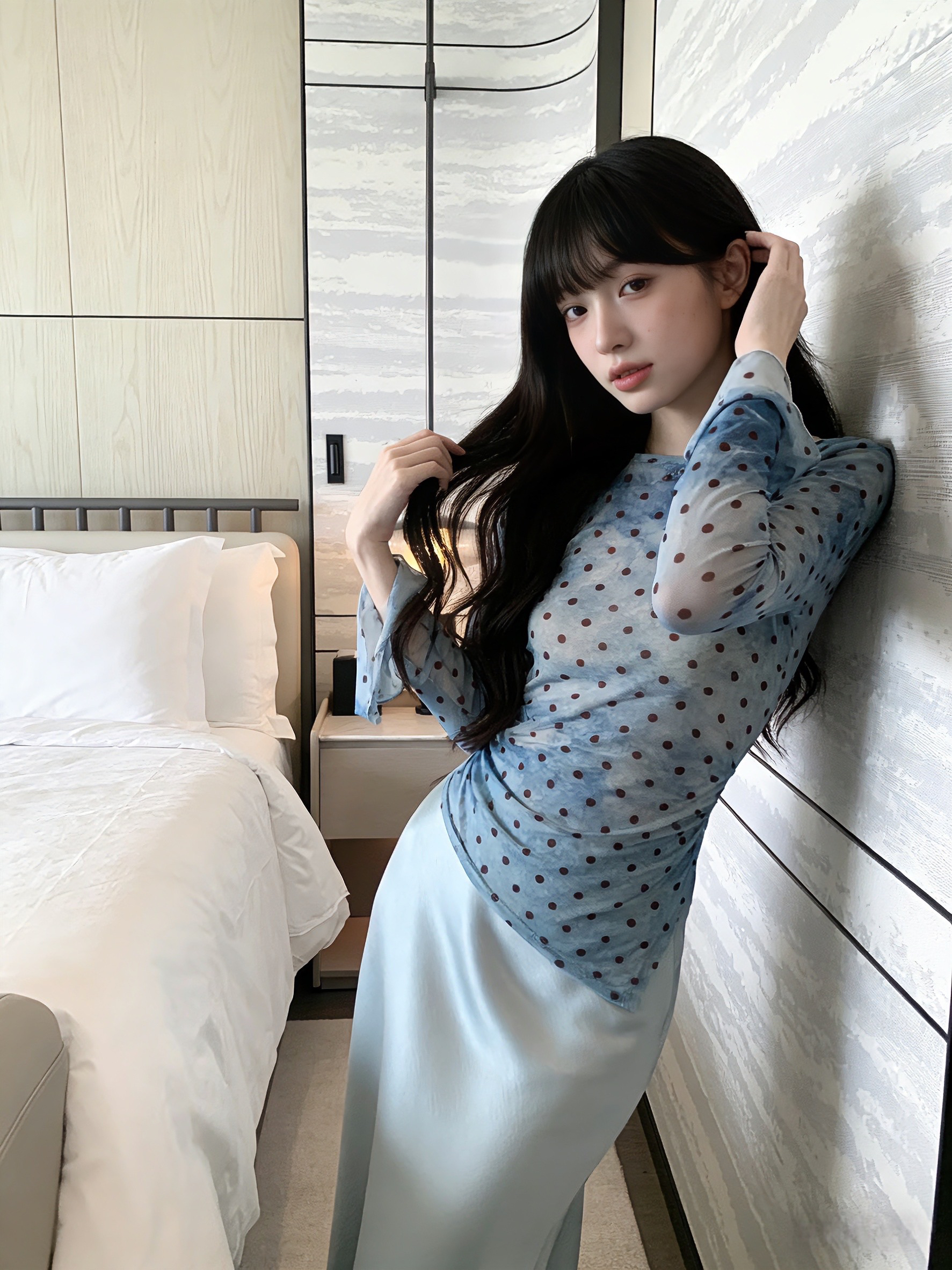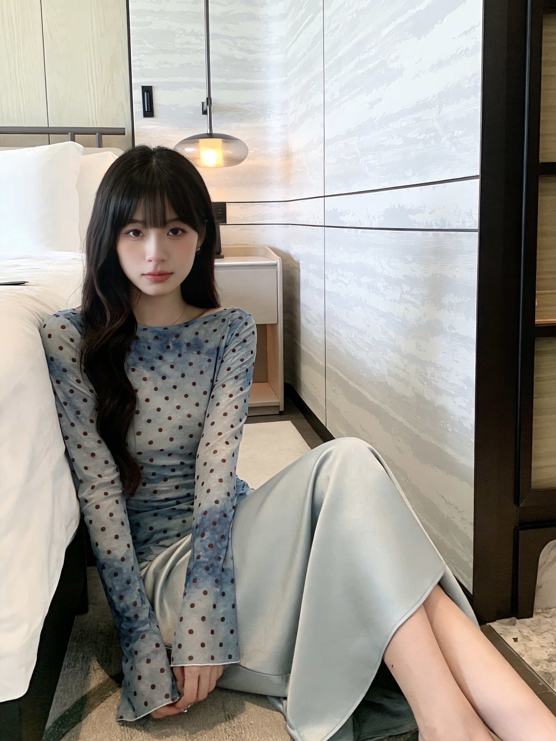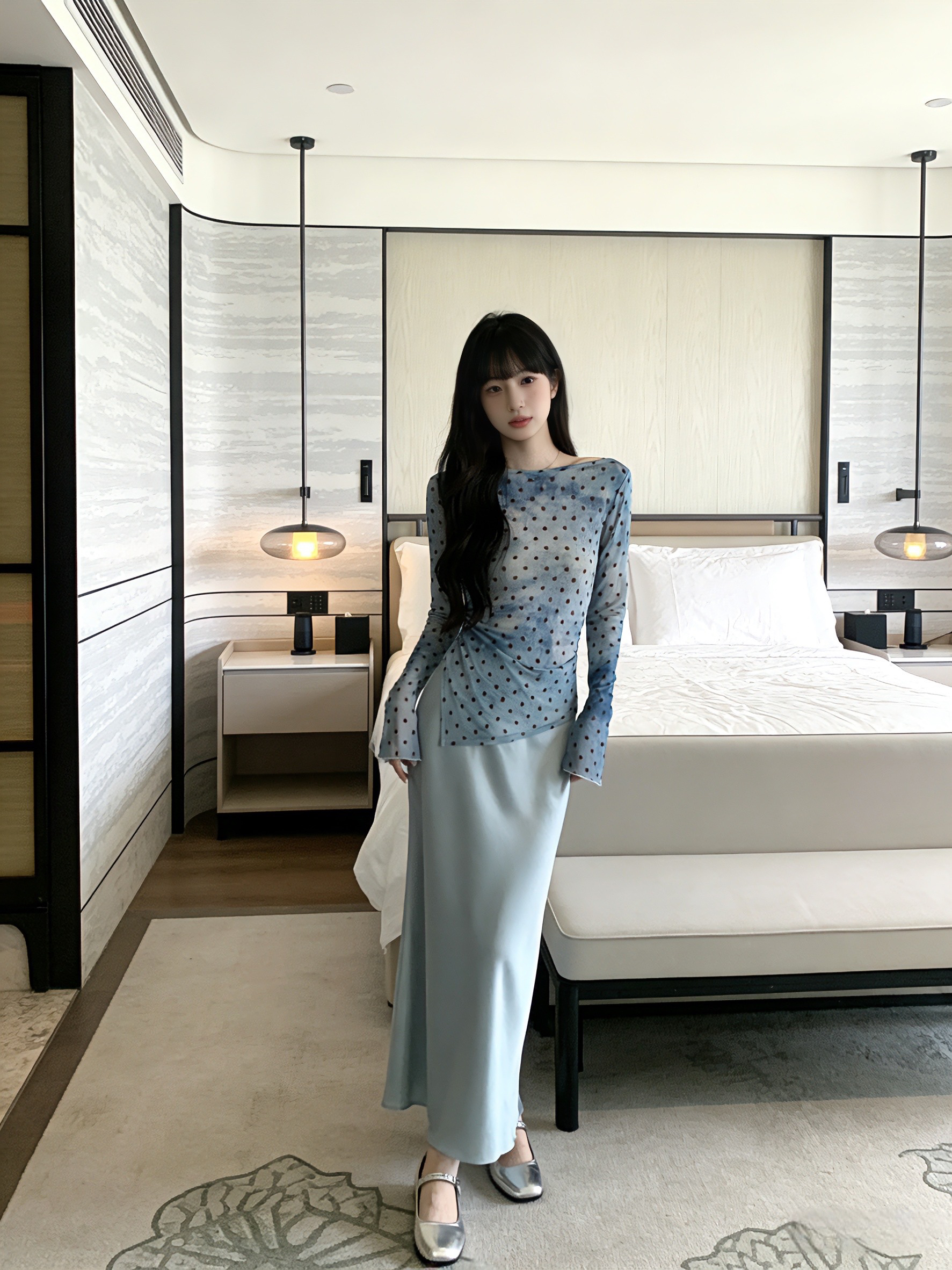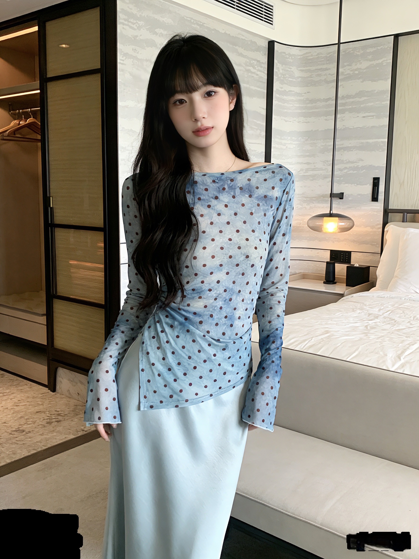 실사 2026 새로운 여성 의류 패션 도트 무늬 망사 자외선 차단 몸매 가꾸기 슬림해 보이는 맨위 새틴 파란색 반신 스커트 한