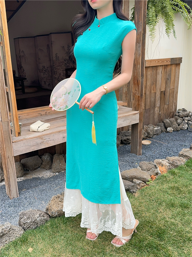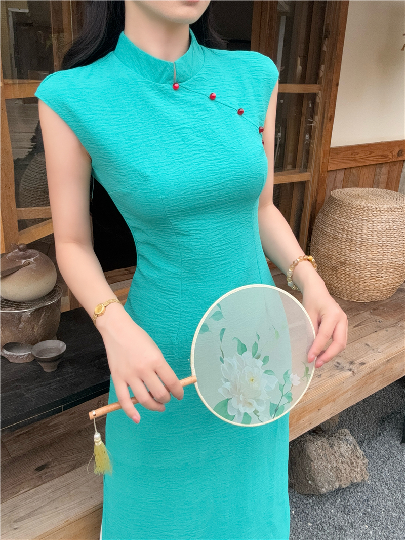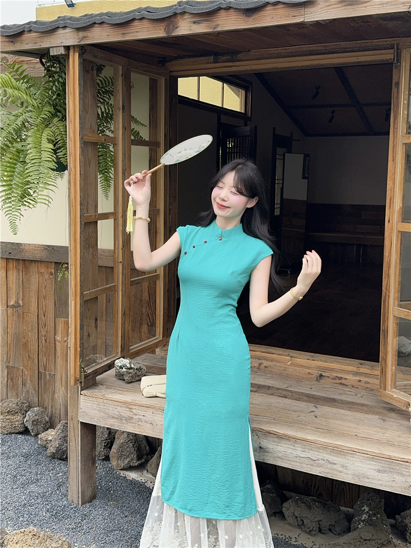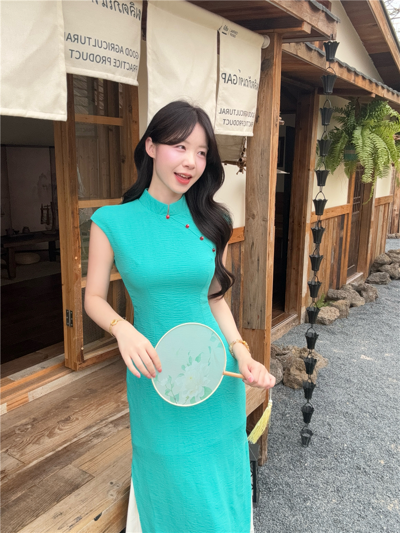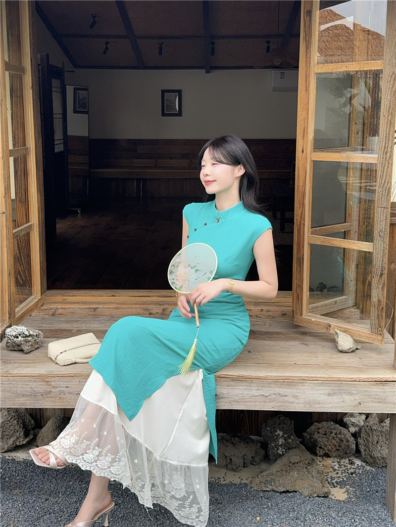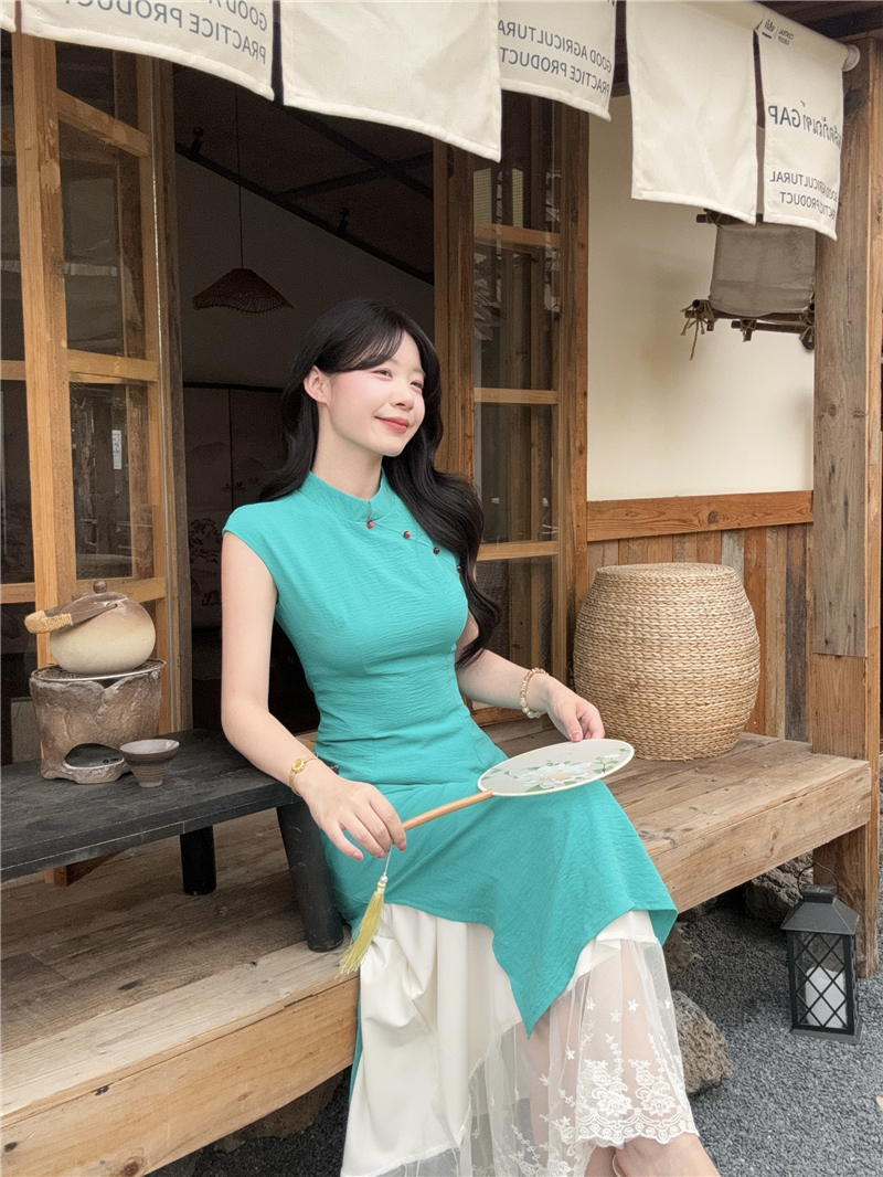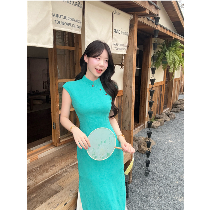 실사 정가 비스 도시 봄 노래 국풍 새로운 중식 비스듬한 襟 스탠드 칼라 민소매 슬림해 보이는 속치마 치파오 치마 세트