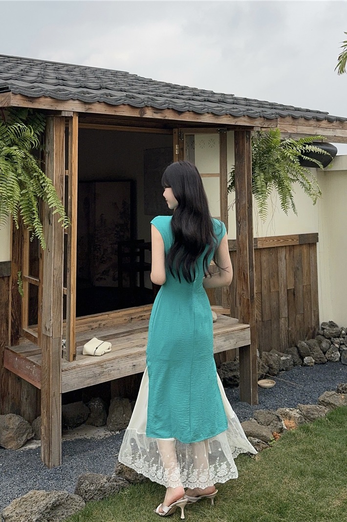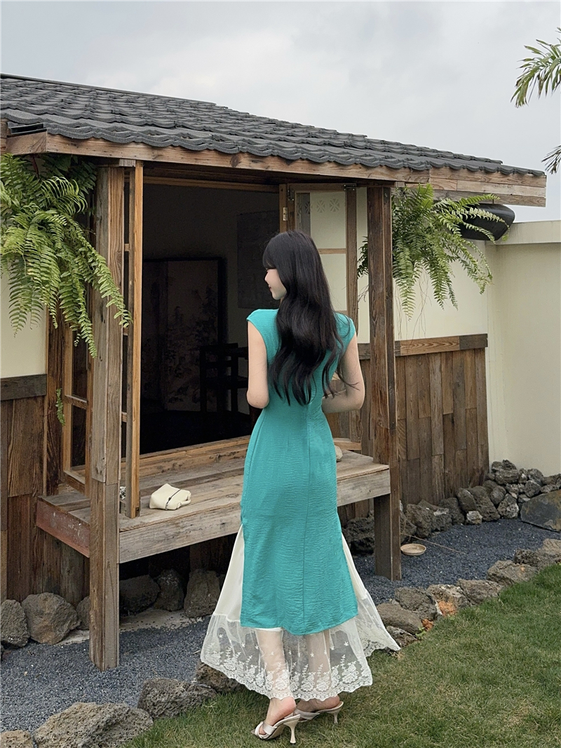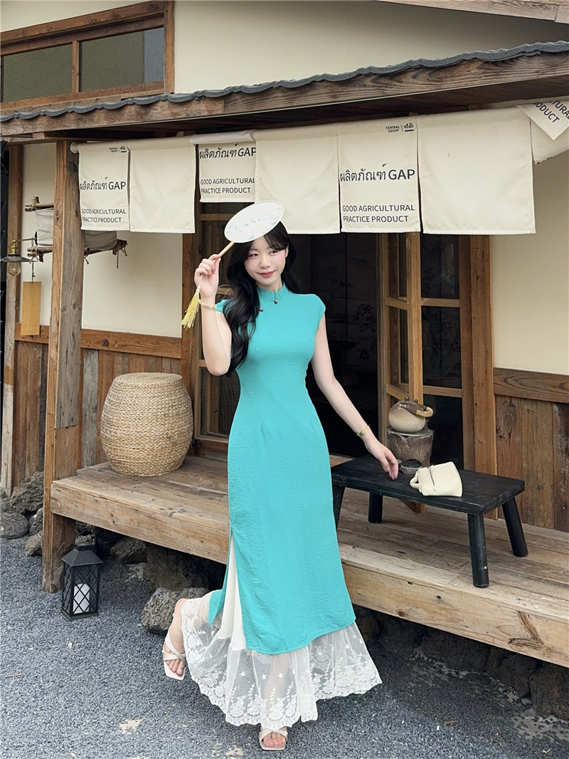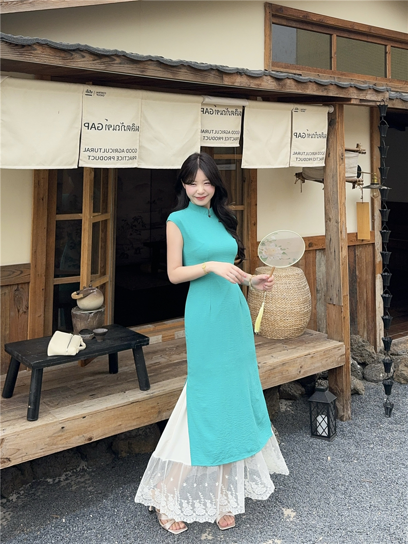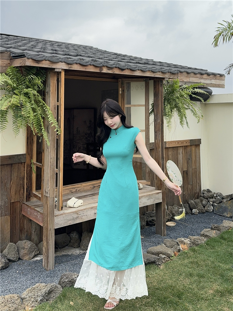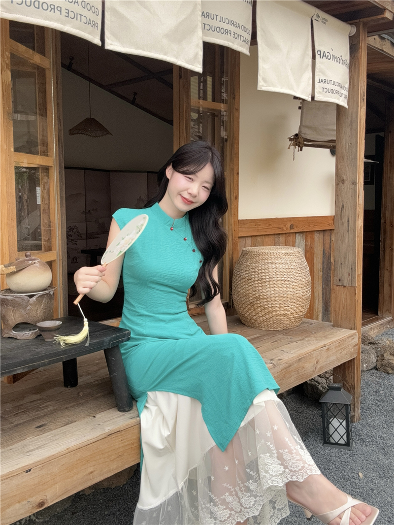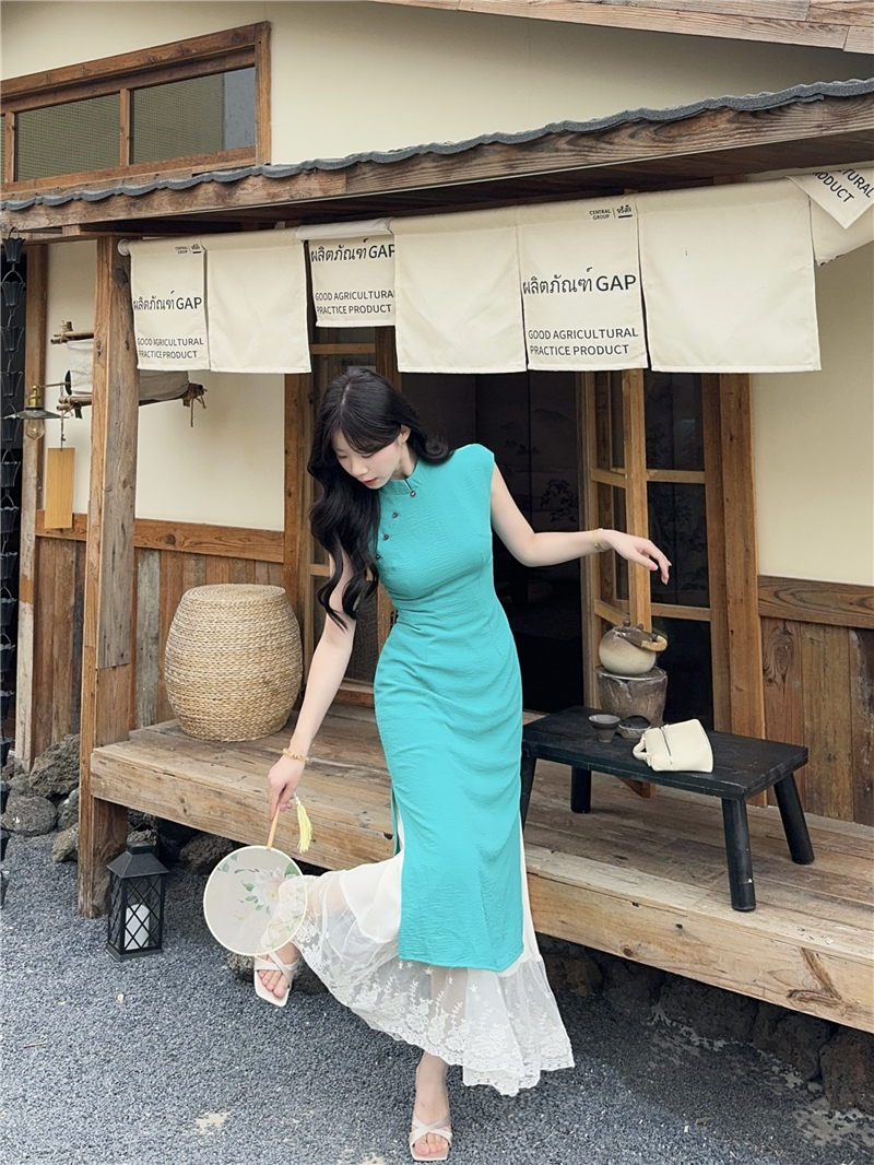 실사 정가 비스 도시 봄 노래 국풍 새로운 중식 비스듬한 襟 스탠드 칼라 민소매 슬림해 보이는 속치마 치파오 치마 세트