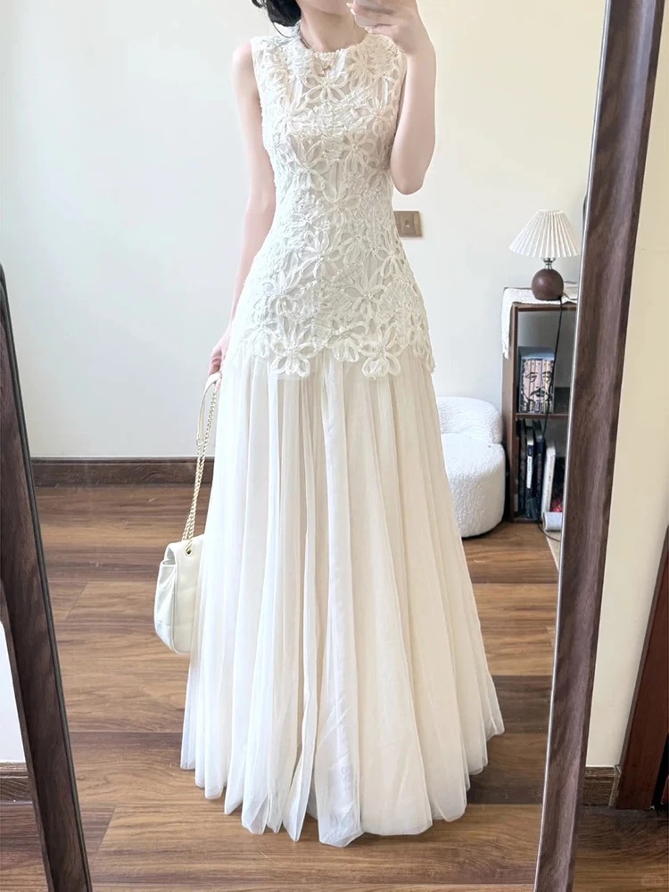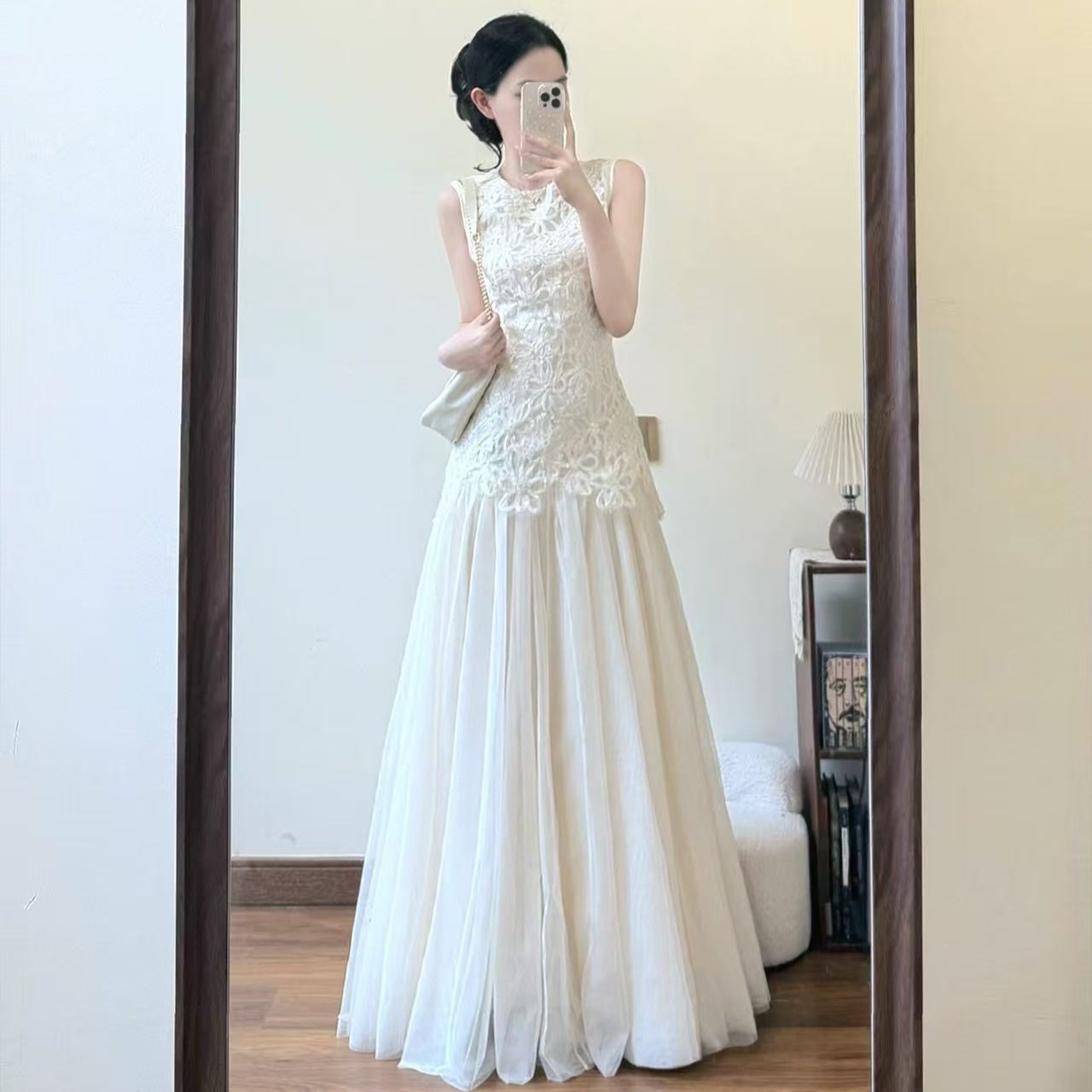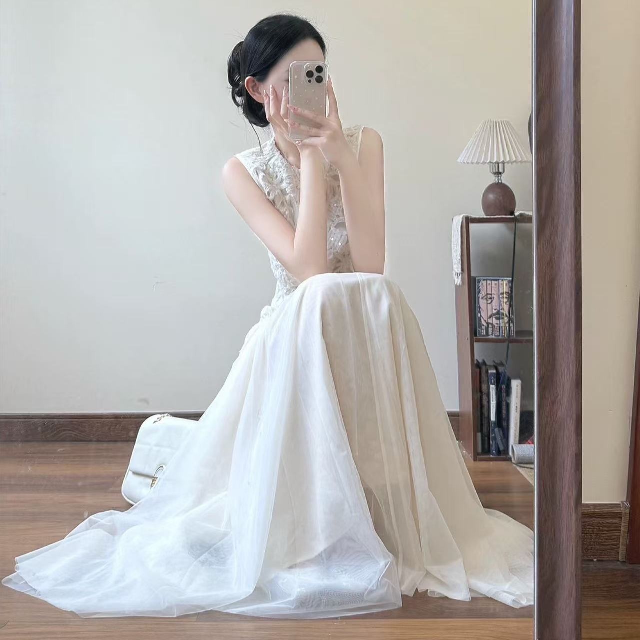 부유 한 가족 천 금빛 바람 스팽글 레이스 조끼 여성 드레스 생일 예복 고급 센스 품격 허리 수축 망사 롱 스커트