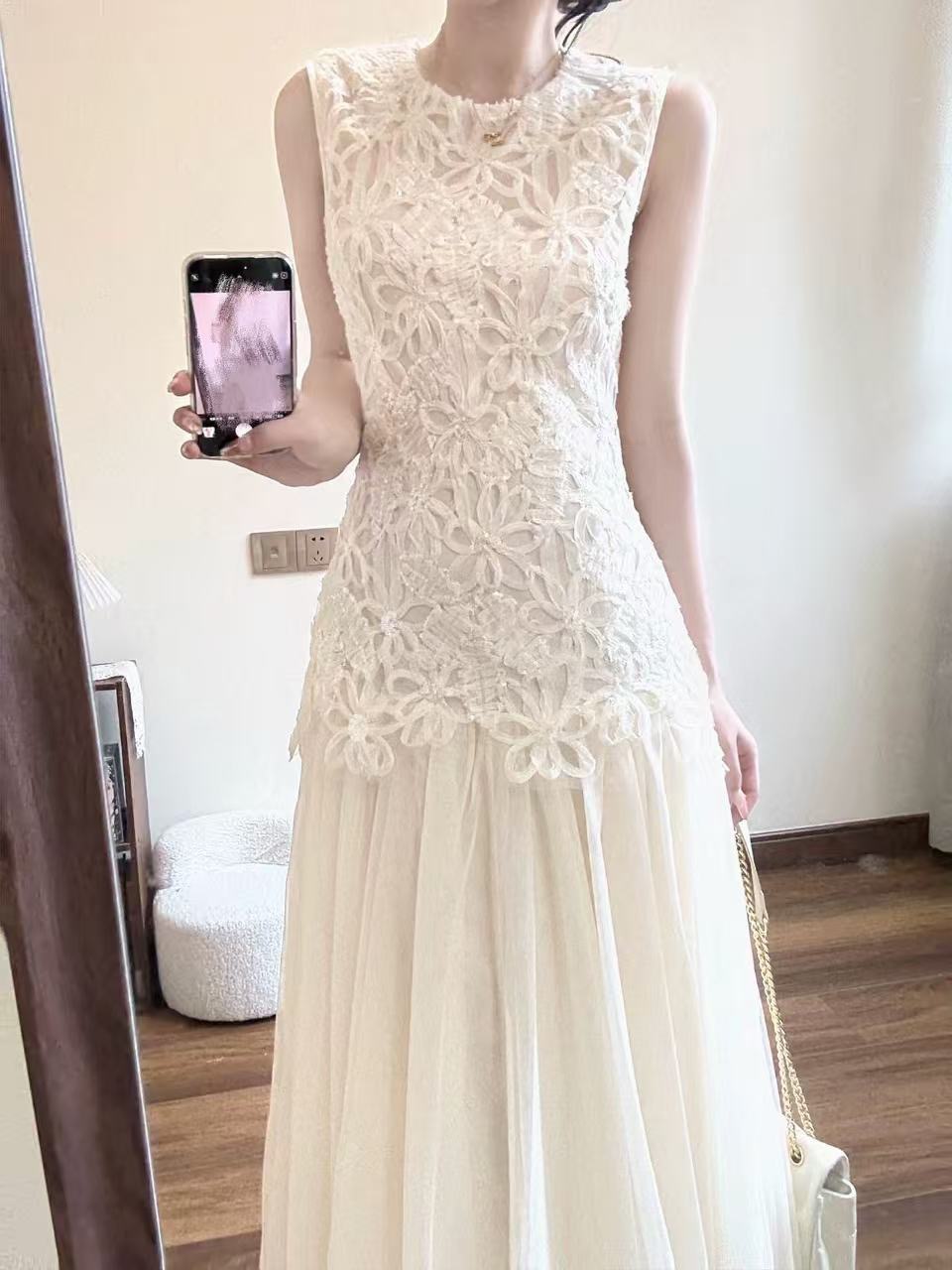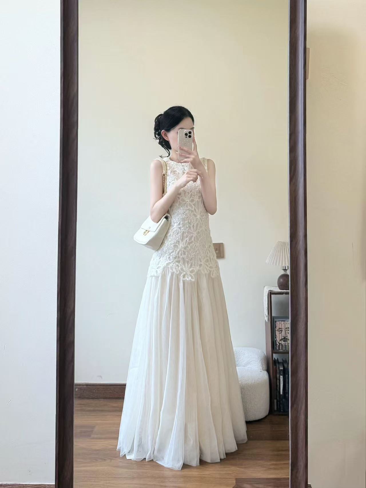 2026 여름 새로운 프랑스식 부드러운 레이스 조각 작은 검은 드레스 유럽 오간자 배색 롱 코트 드레스