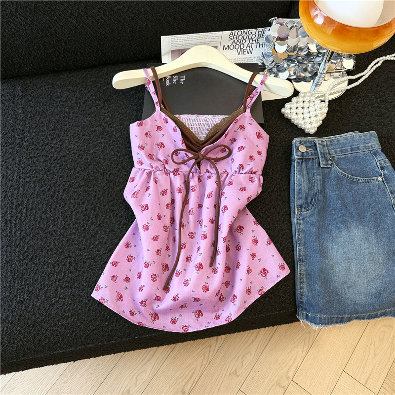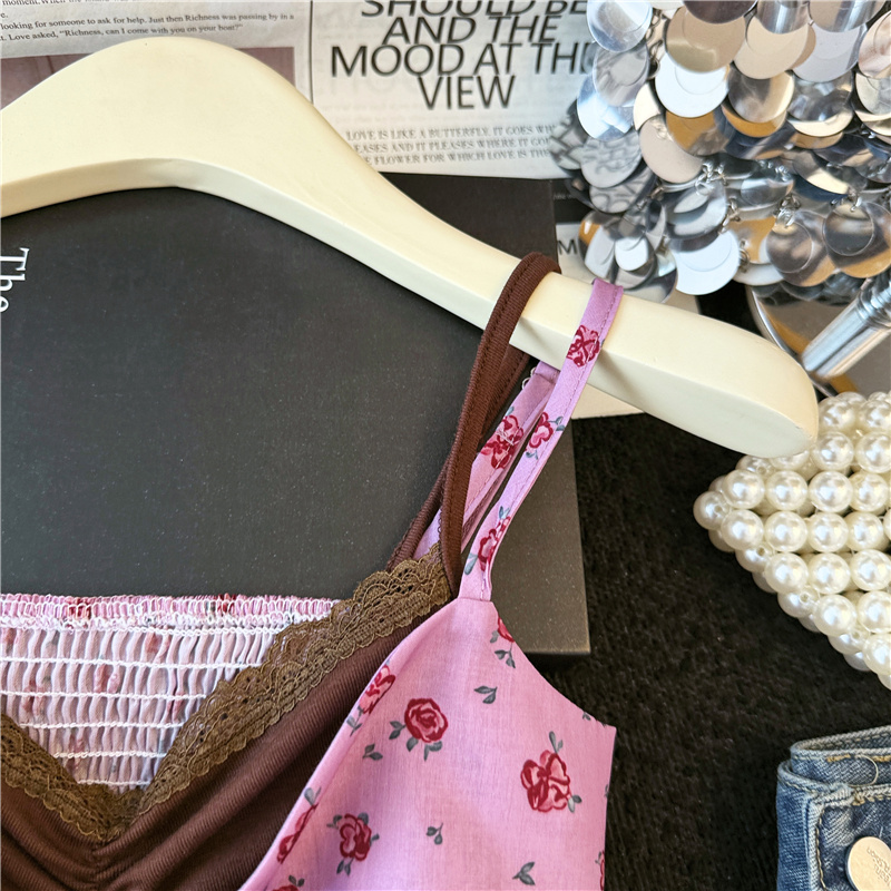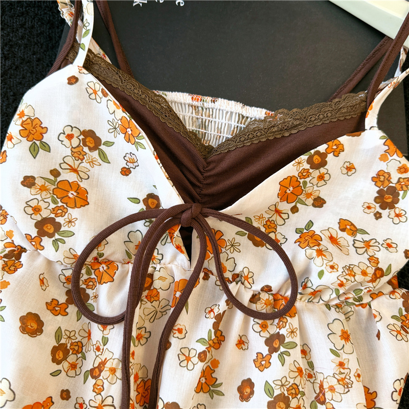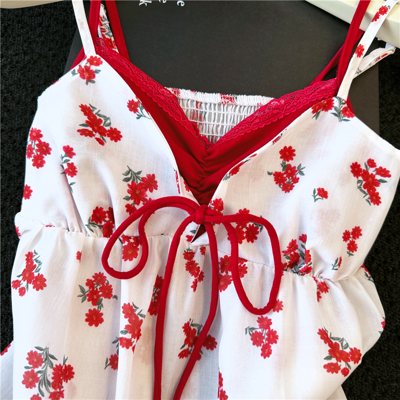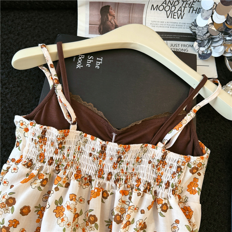 고유 한 아름다운 디자인 센스 V넥 페이크 레이어드 한 부서 ins 달콤함 꽃무늬 쉬폰 슬립 여성 루즈핏 민소매 맨위