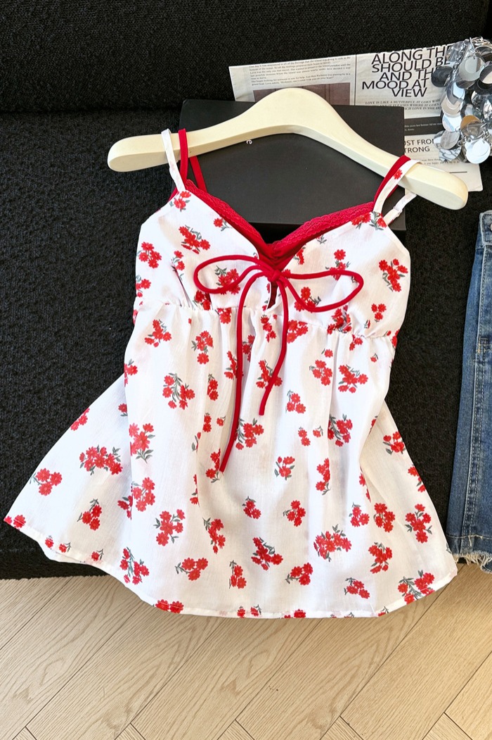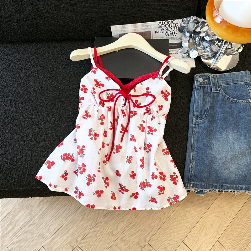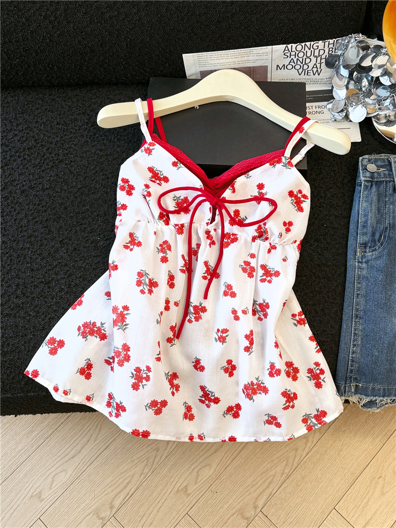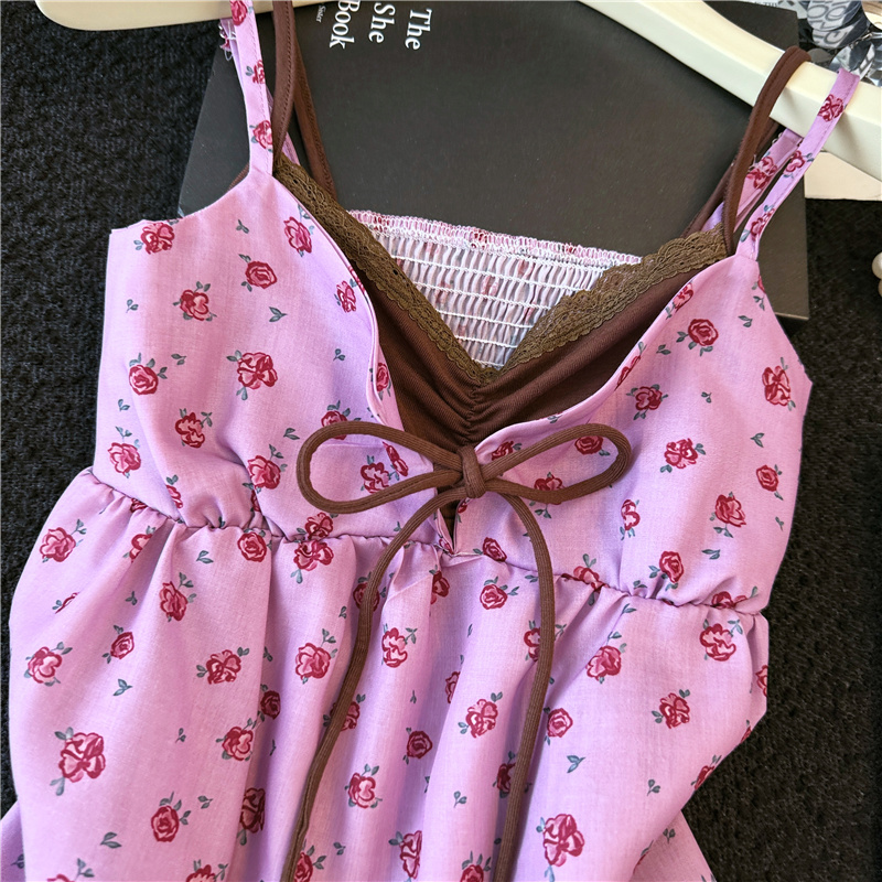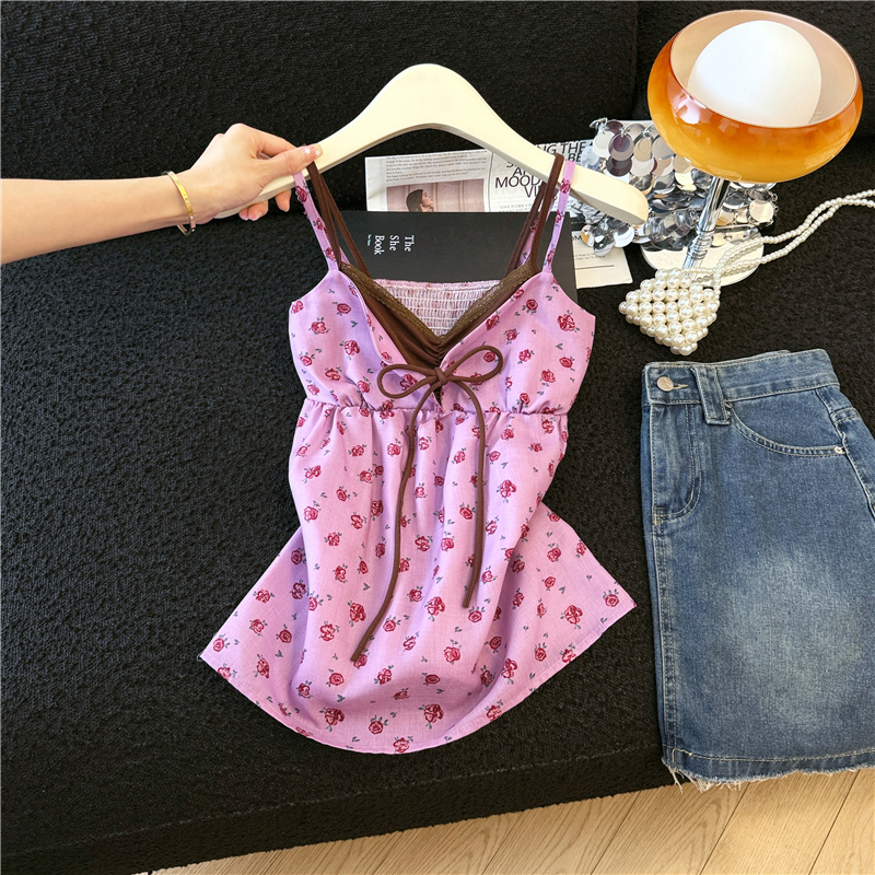 고유 한 아름다운 디자인 센스 V넥 페이크 레이어드 한 부서 ins 달콤함 꽃무늬 쉬폰 슬립 여성 루즈핏 민소매 맨위