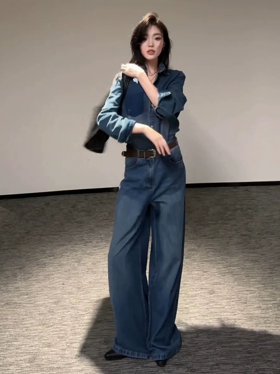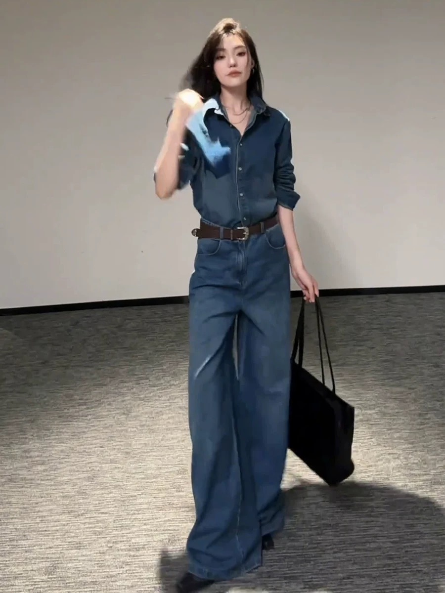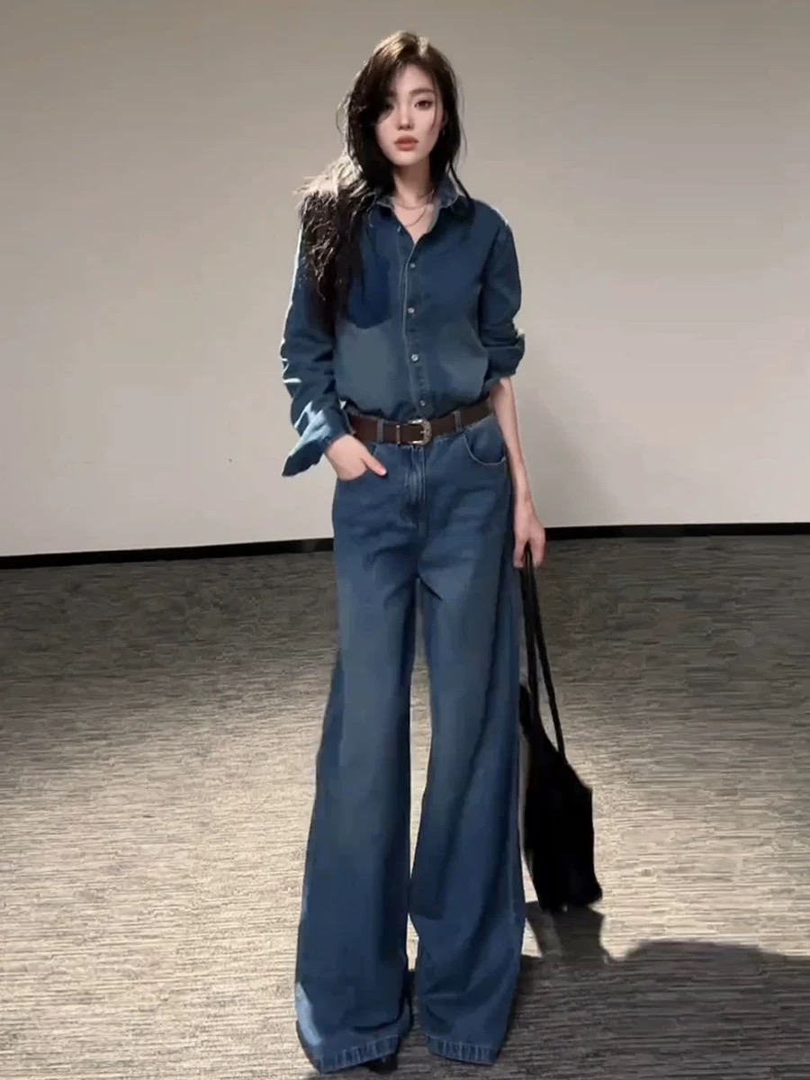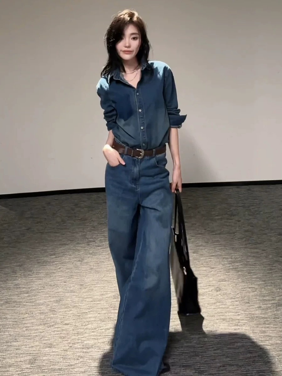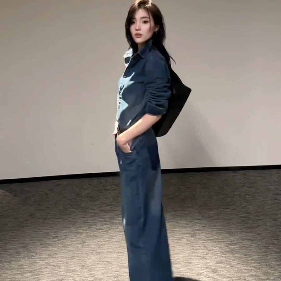 2026 슈퍼 화재 항구 바람 차가운 바람의 소리 워싱 데님 셔츠 와이드 레그 팬츠 세트 여성 봄 가을 외국 가스 캐주얼 투피스 슈트