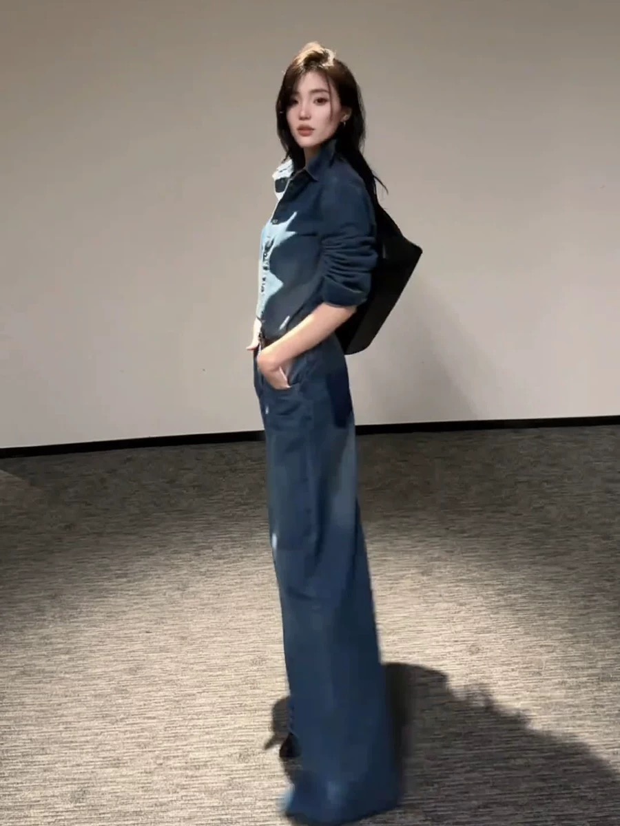 자이언트 잘 생긴 이른 봄 전체 집합 감기 느슨함 센스 miu 부서 착용 가져 가라. 파란색 데님 야구 유니폼 와이드 레그 팬츠 세트