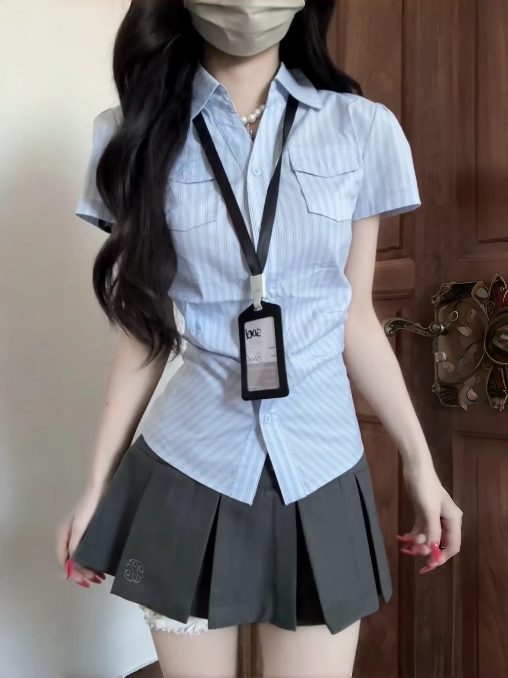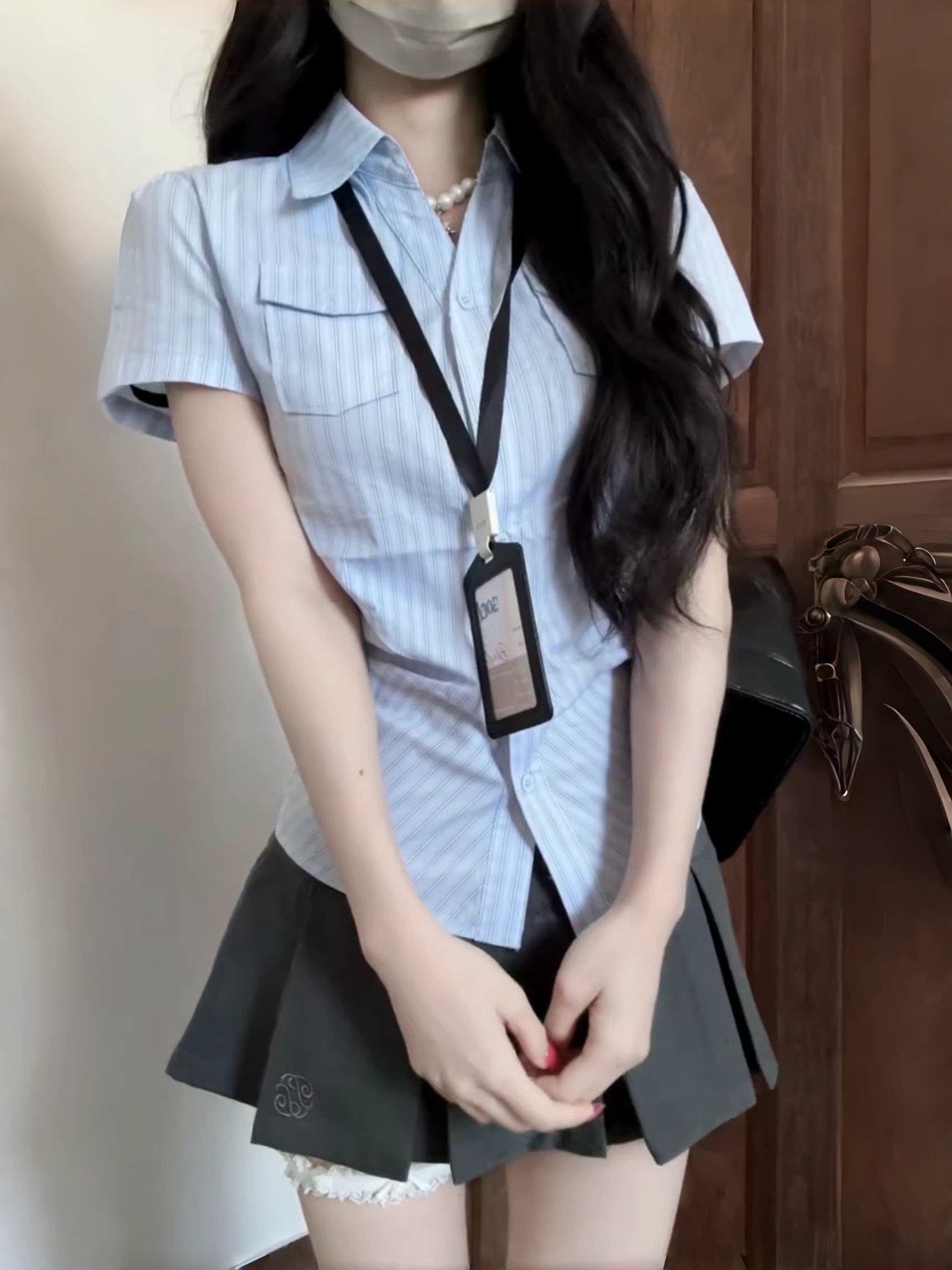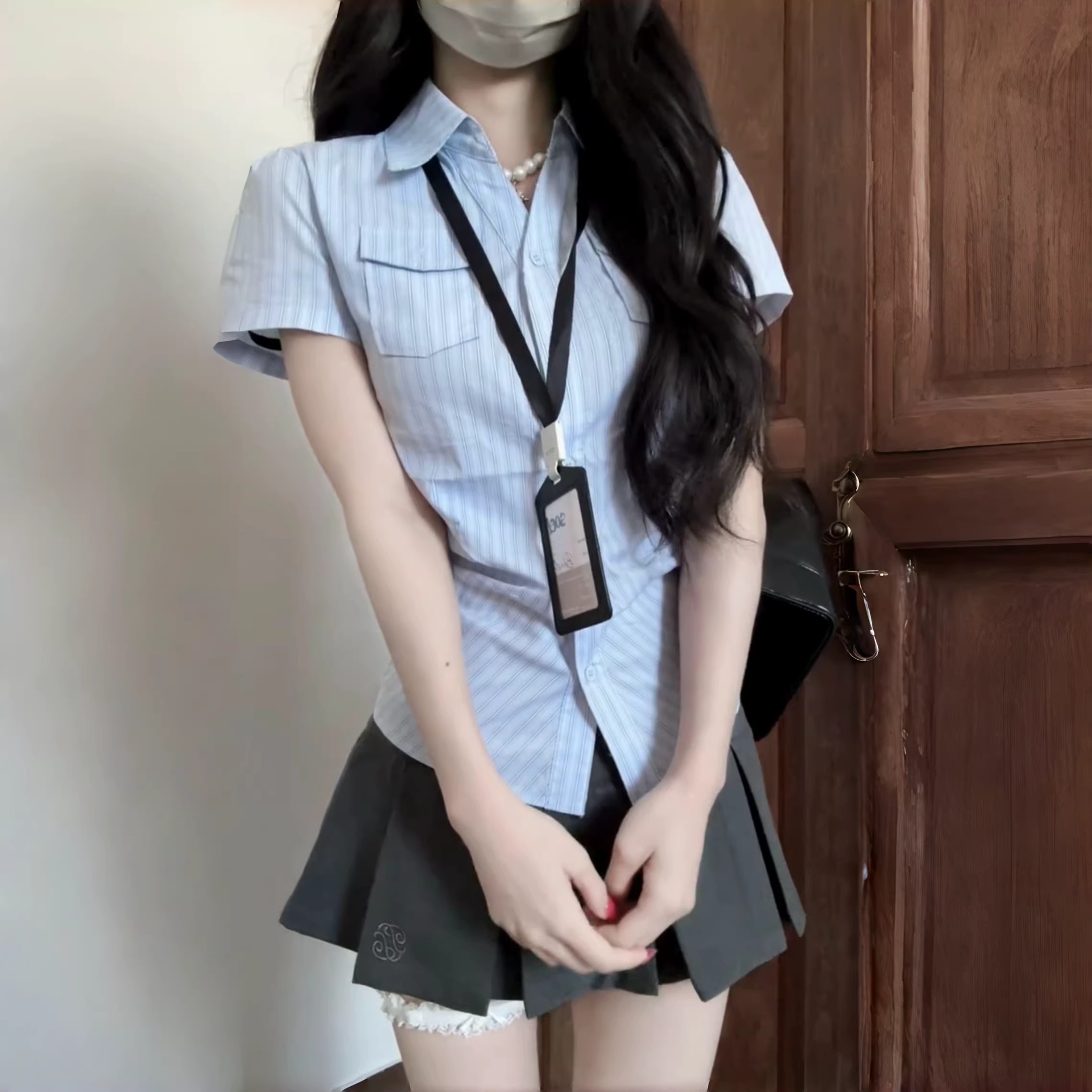 한 부서 순수한 욕망 학원 스타일 비스듬한 어깨 반팔 여성 셔츠 봄 스트라이프 허리 수축 셔츠 몸매 가꾸기 슬림해 보이는 쇼트 스타일 맨위
