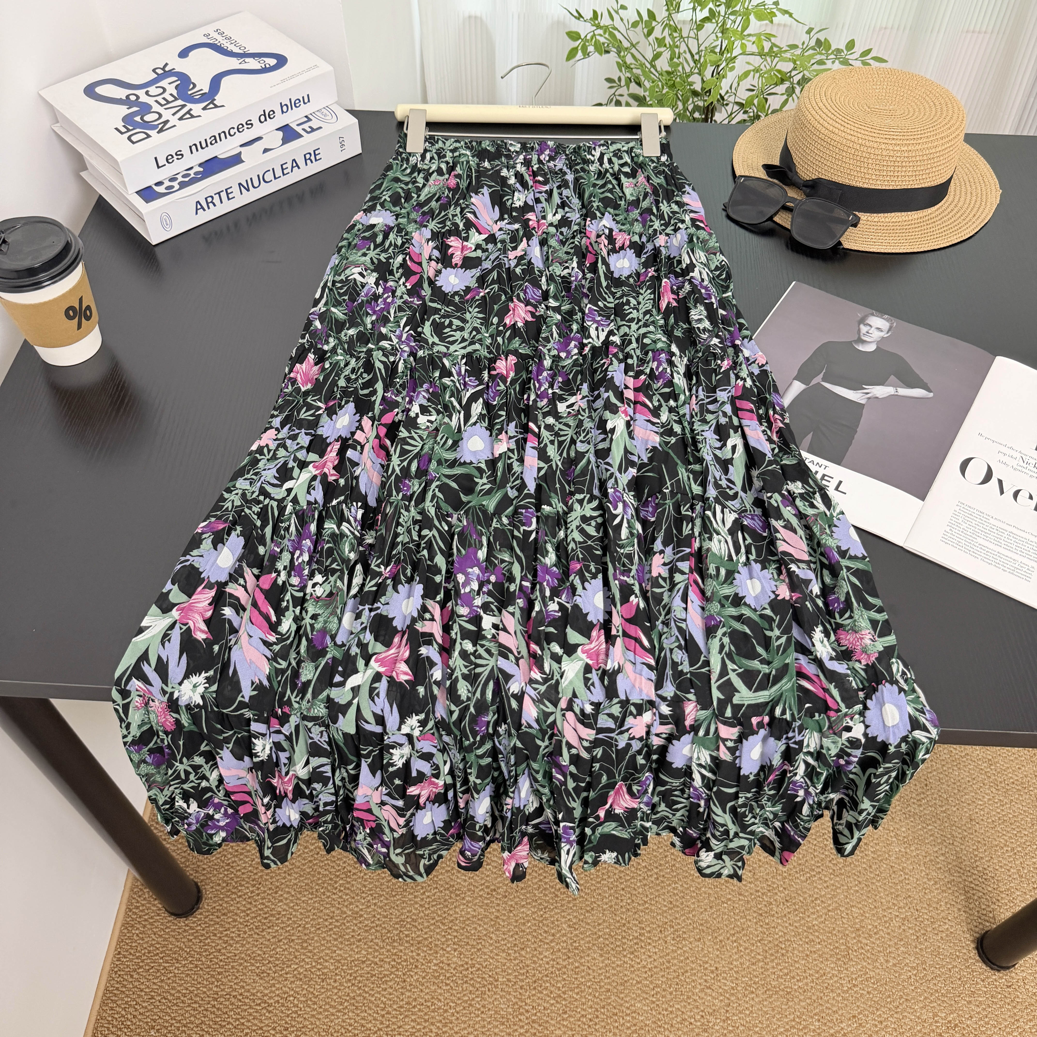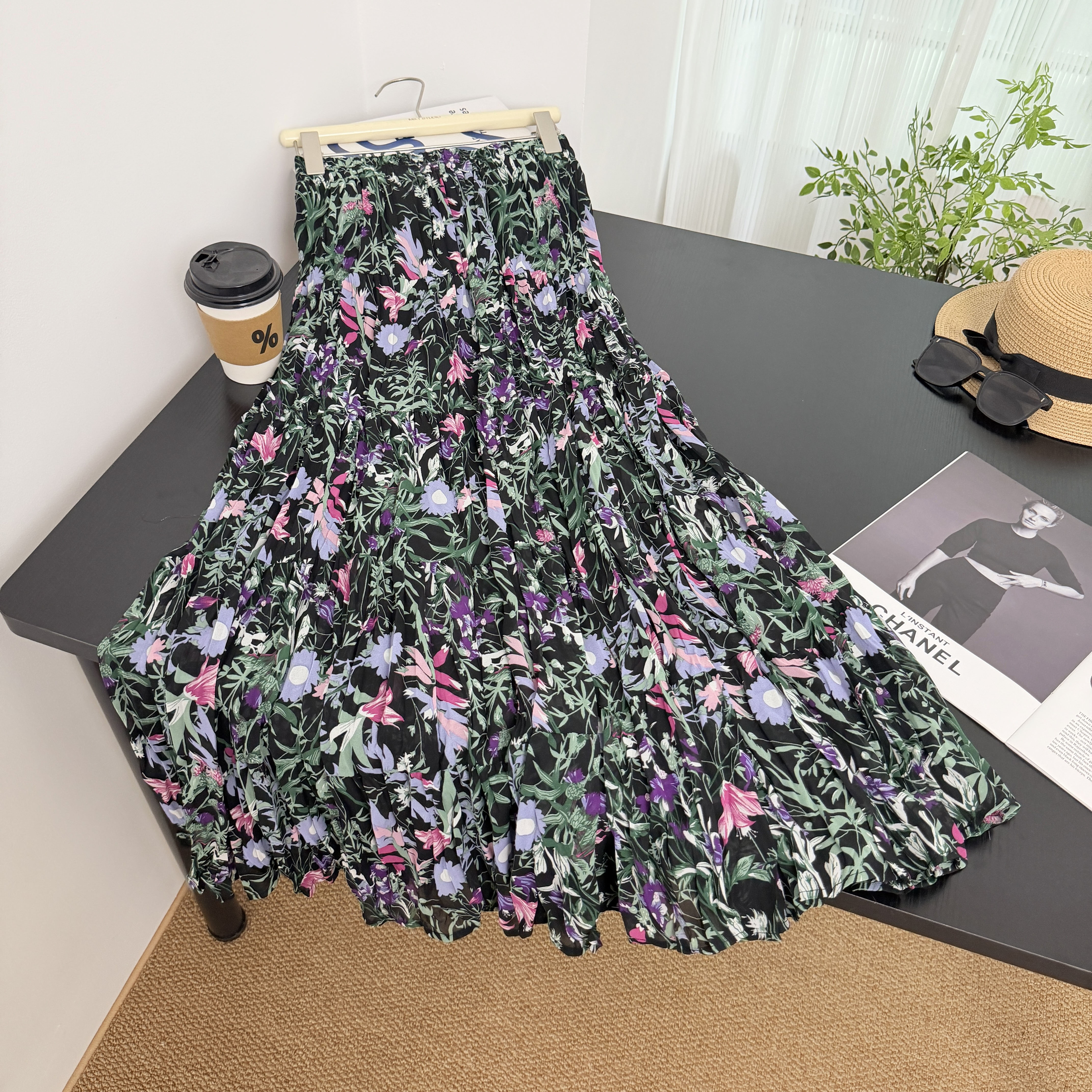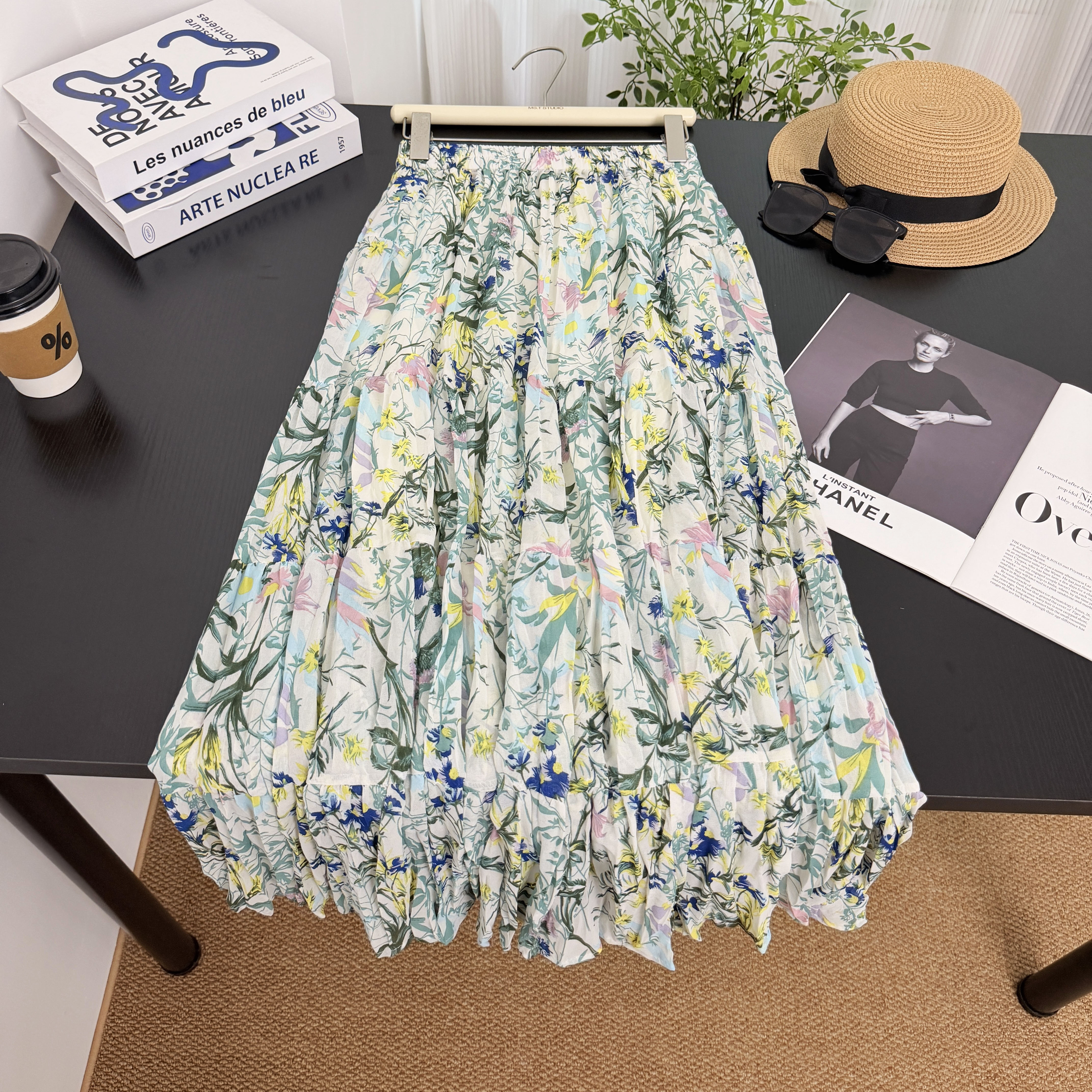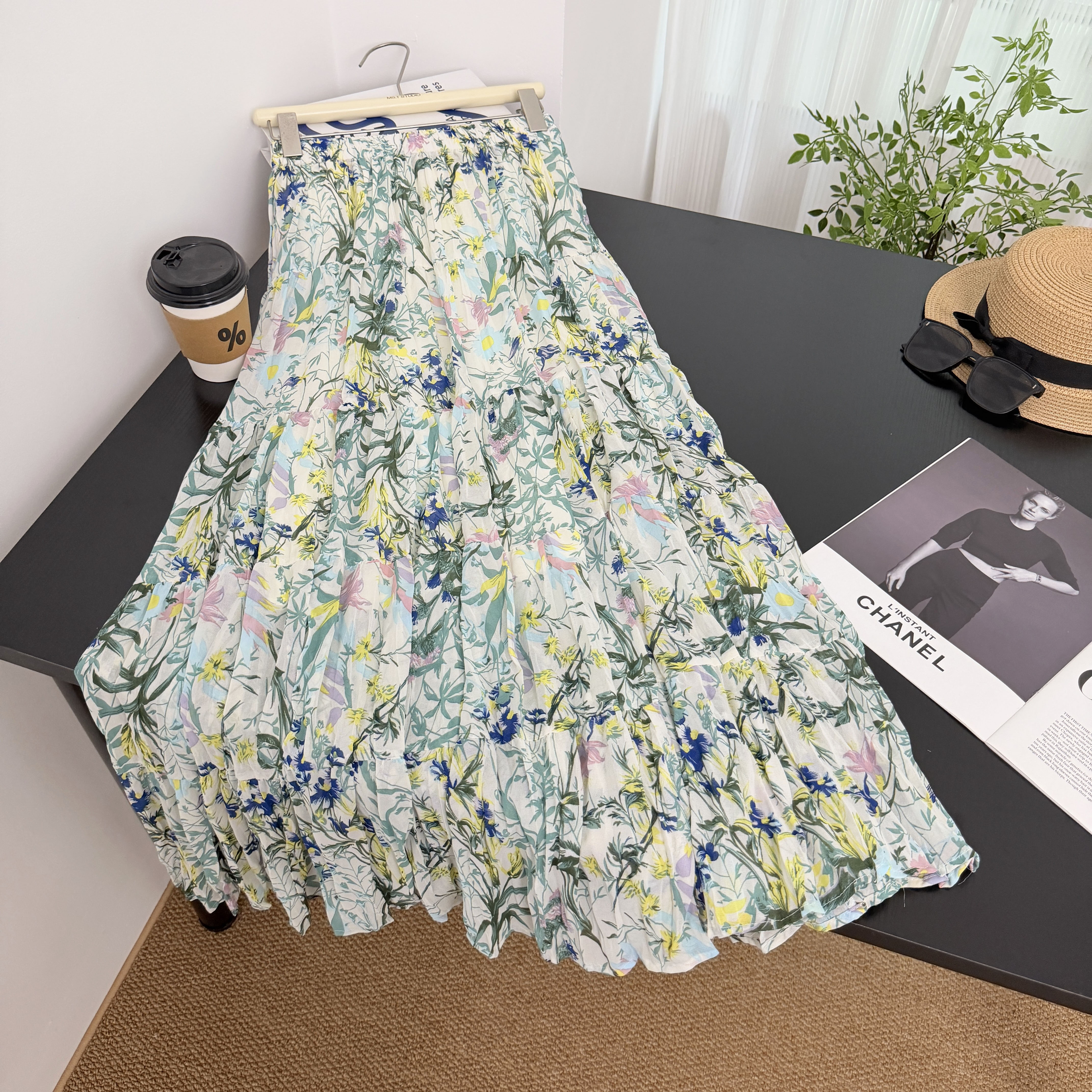 휴가 바람 프린트 쉬폰 주름 반신 스커트 여성 허리밴드 불규칙 빅 플레어 스커트 슬림해 보이는 연령 감소 꽃무늬 롱 스커트
