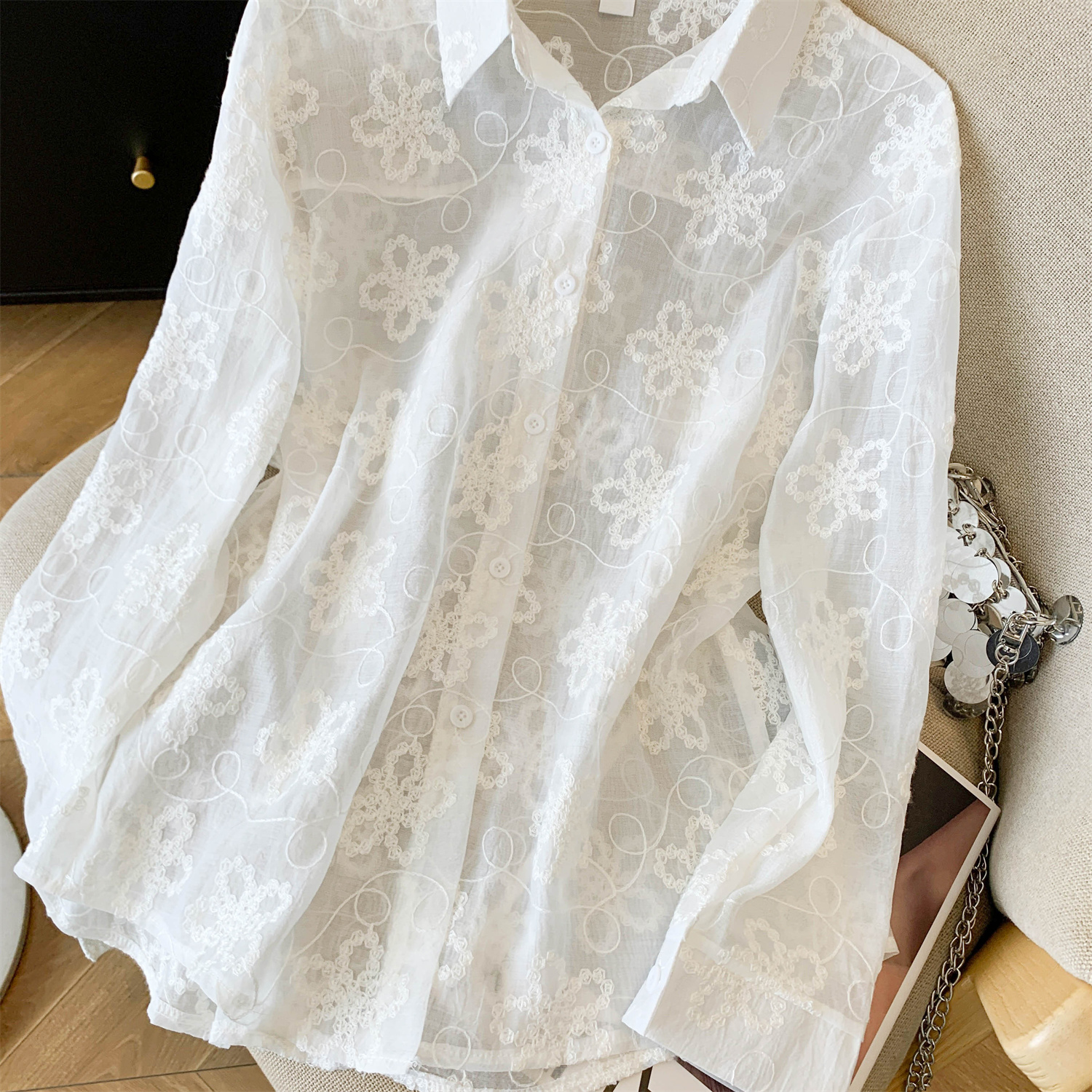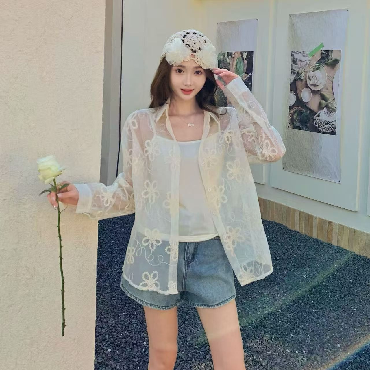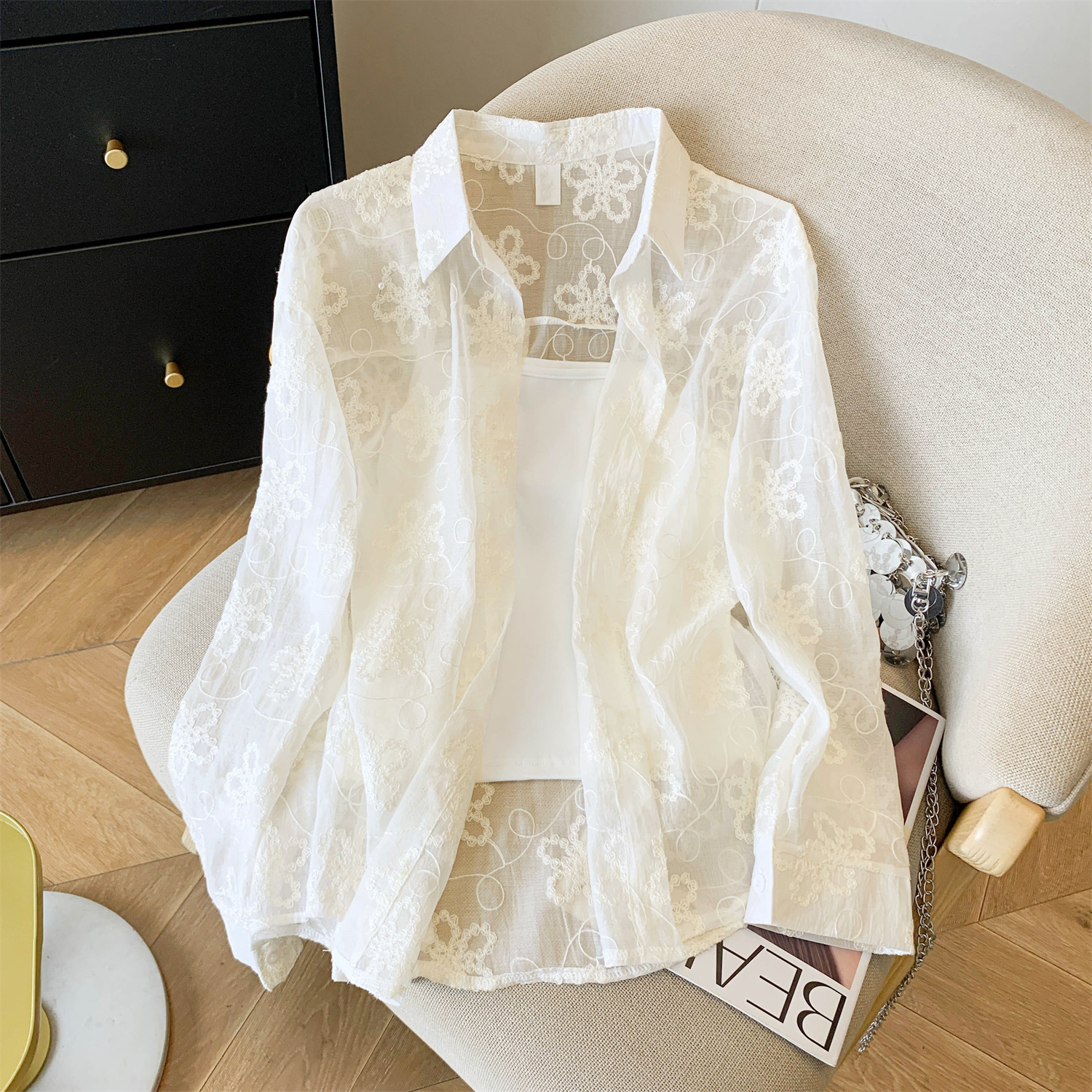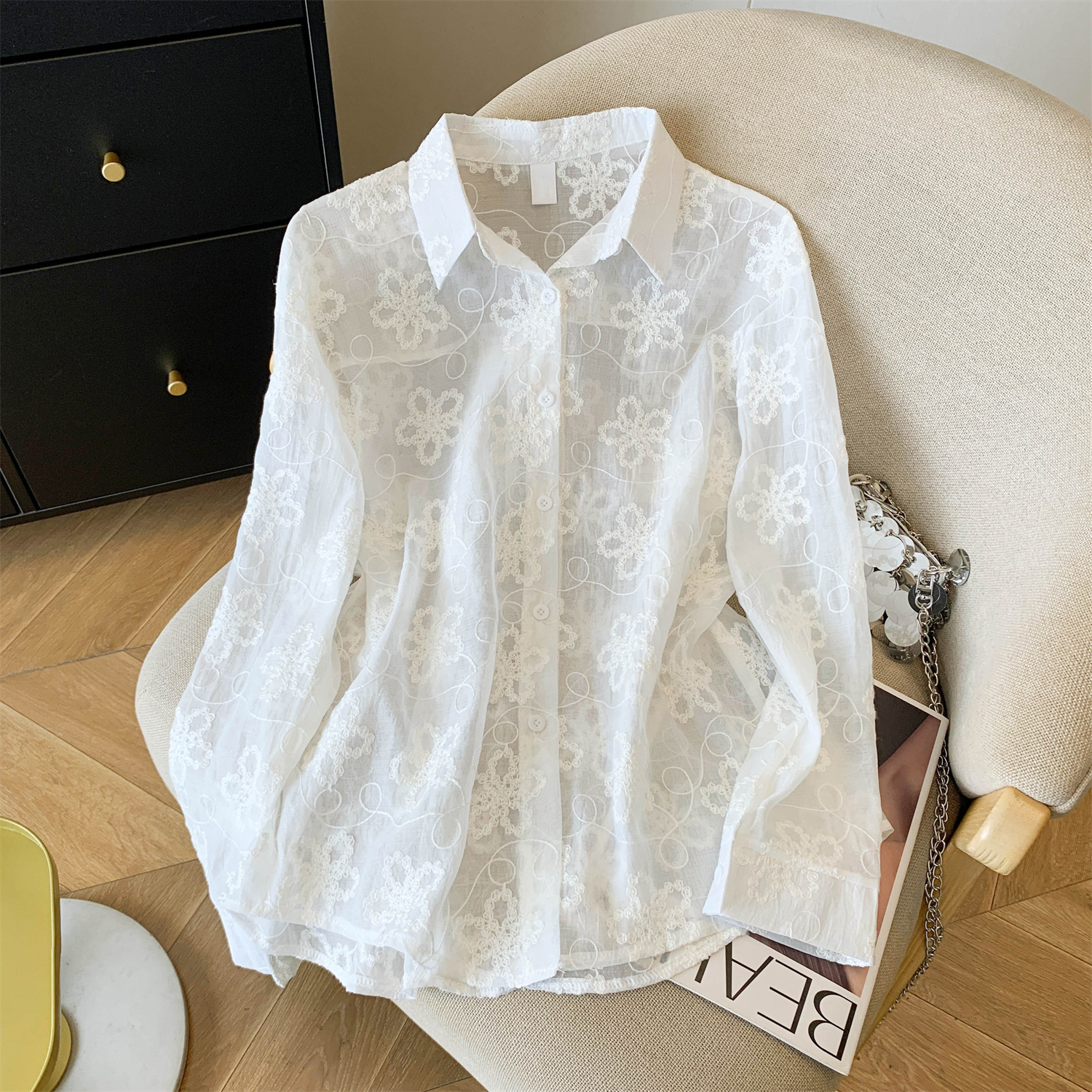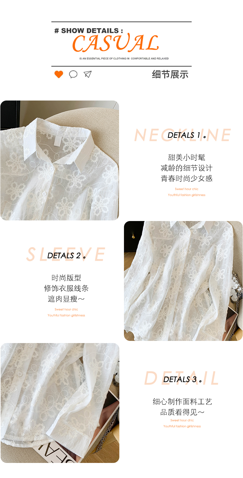 봄 아모이 레이스 자수 얇은 스타일 긴팔 자외선 차단 의류 에어컨 셔츠 맨위 루즈핏 슬림해 보이는 다용도 셔츠 짧은 외투
