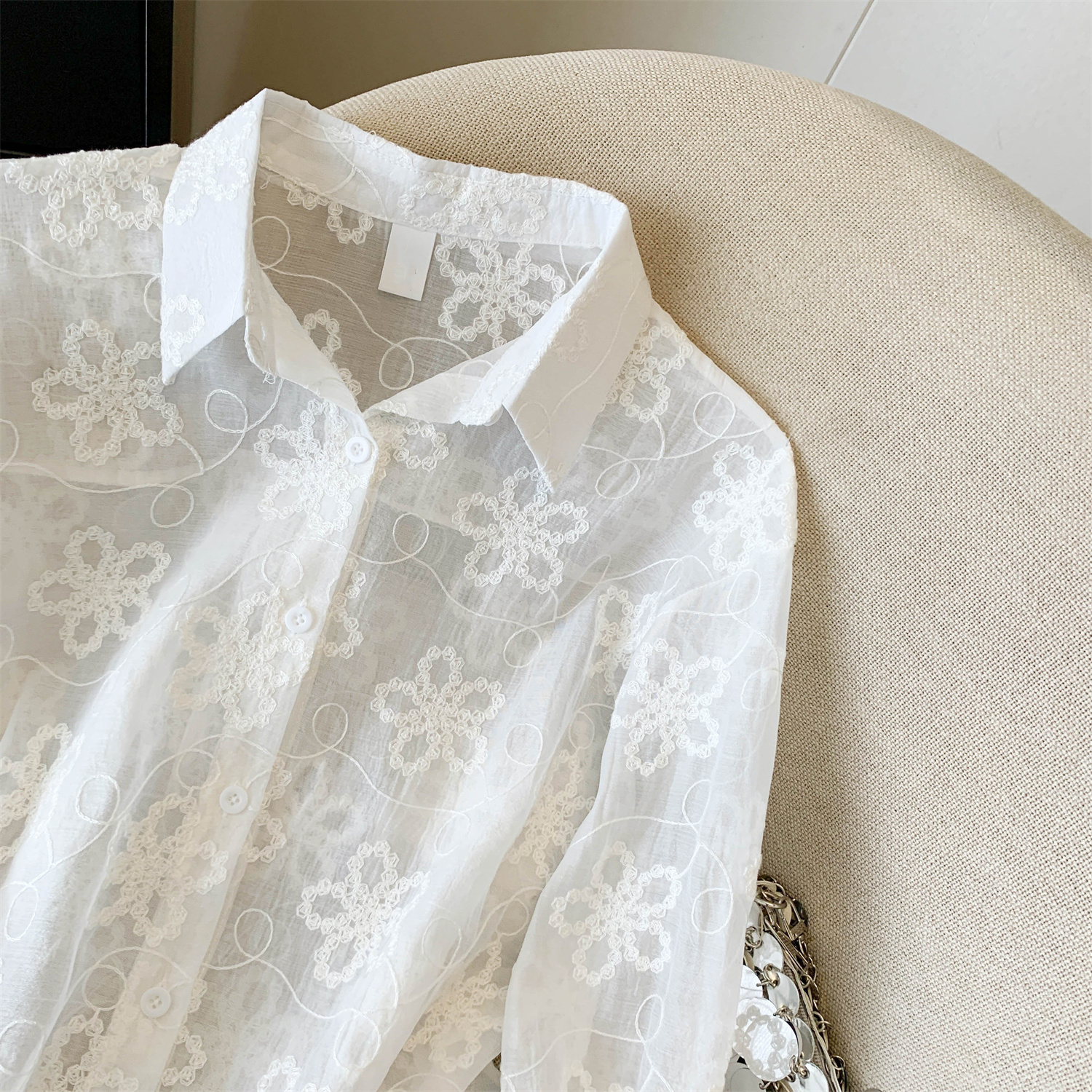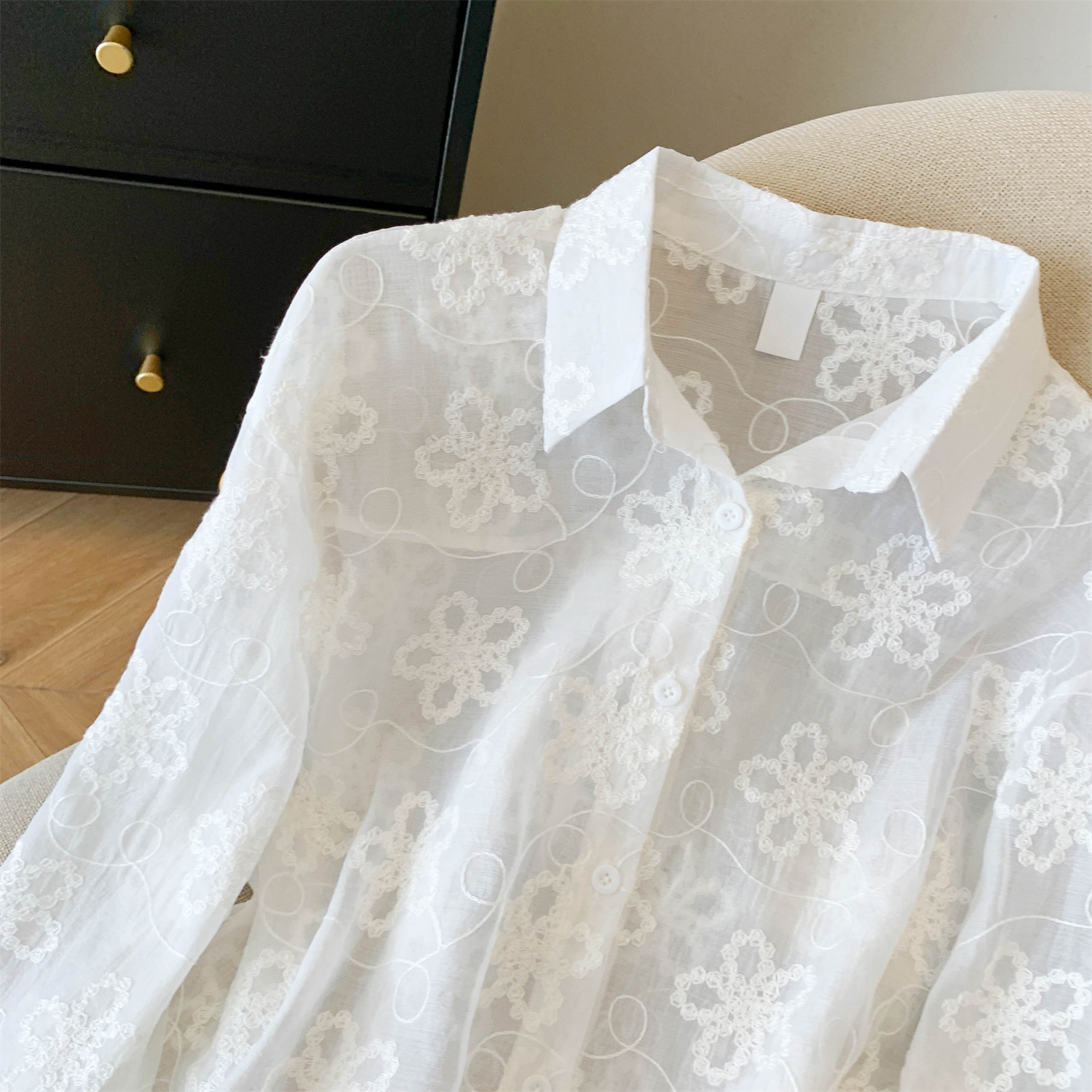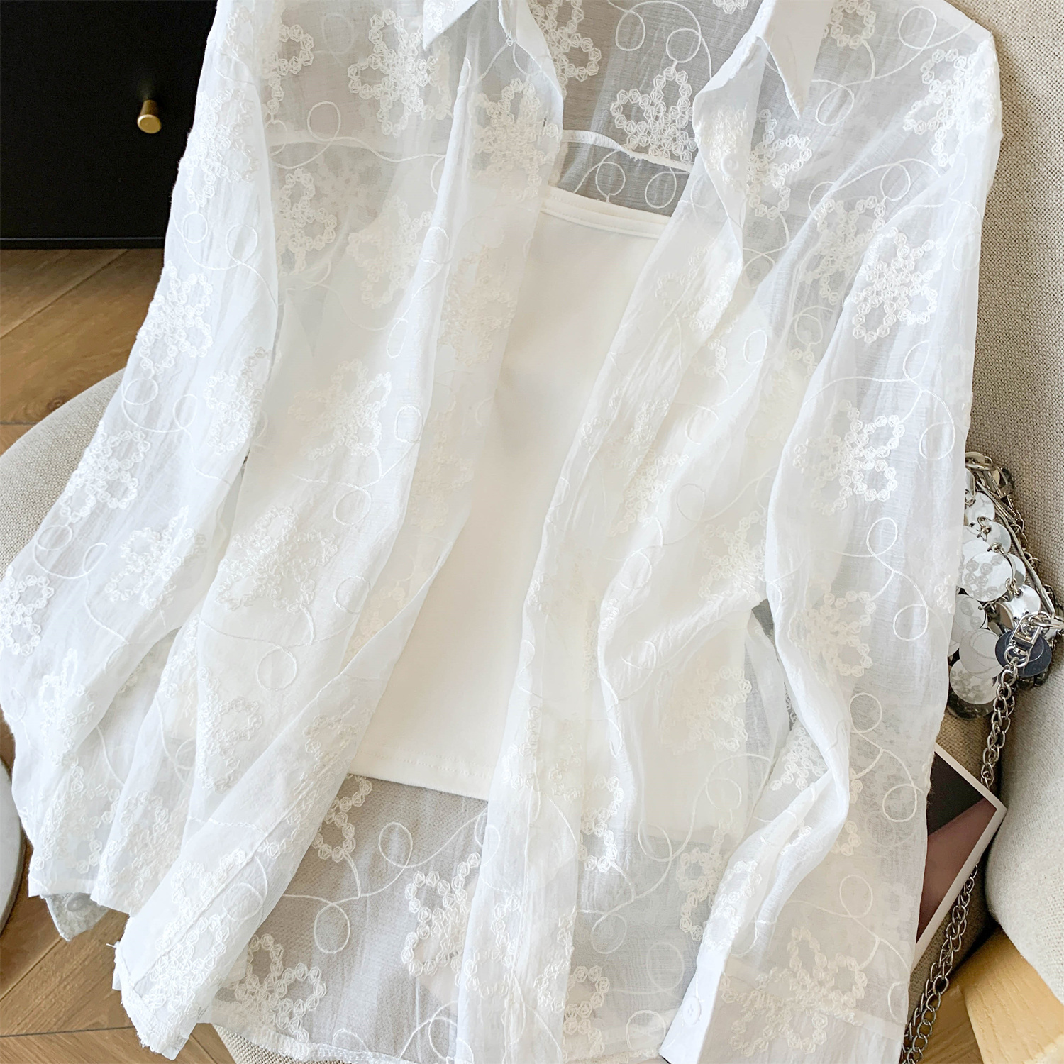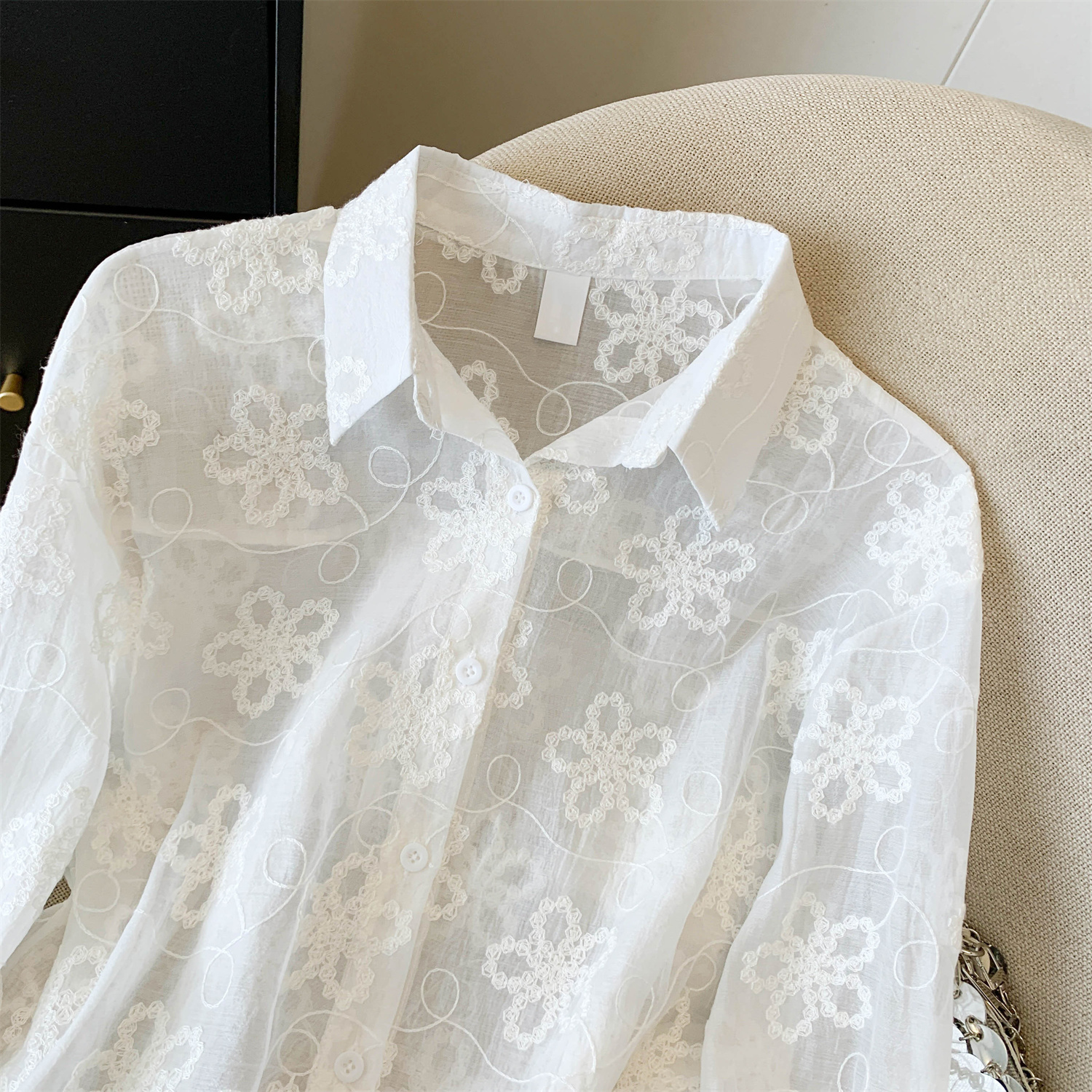 봄 아모이 레이스 자수 얇은 스타일 긴팔 자외선 차단 의류 에어컨 셔츠 맨위 루즈핏 슬림해 보이는 다용도 셔츠 짧은 외투