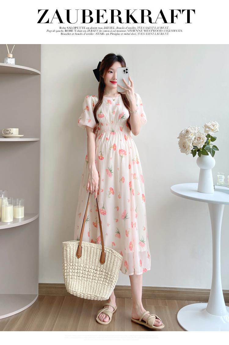 실사 2026 여름 섹션 새로운 출산 착용 주간 실크 부드러운 바람 꽃 칼라 거품 소매 루즈핏 표지 배 드레스
