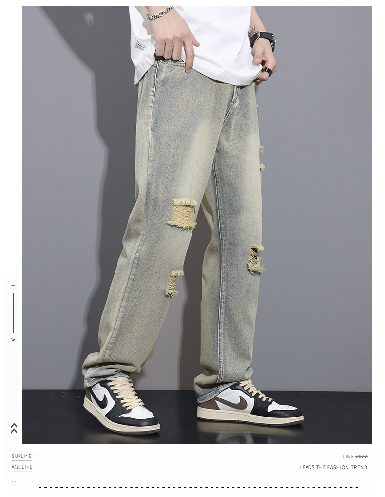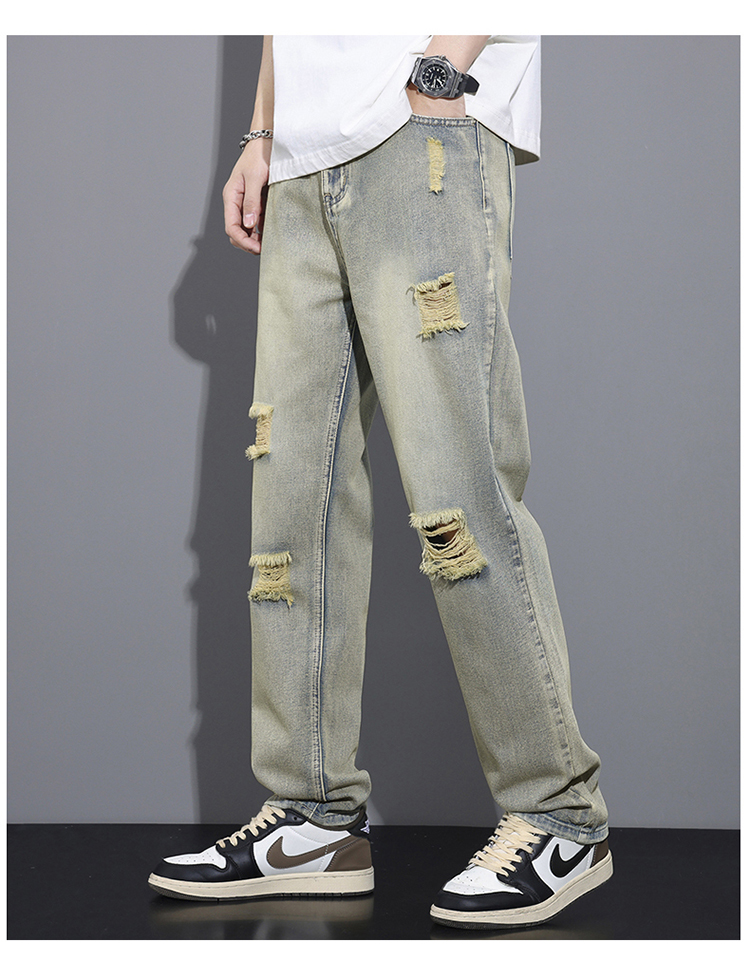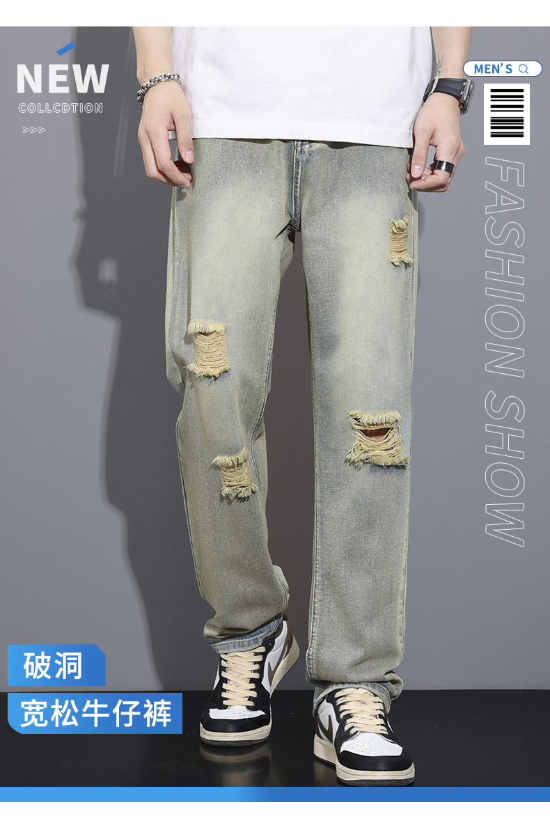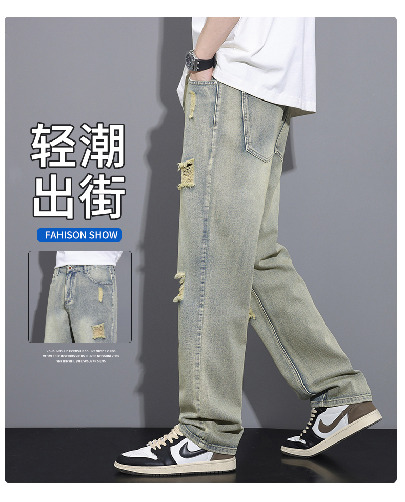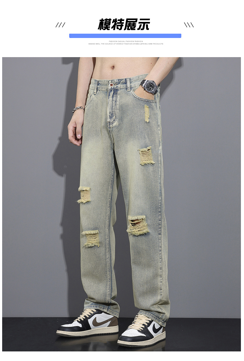 실사 2026 여름 새로운 9 포인트 찢어진 부분 청바지 남자 루즈핏 할란 스트레이트 팬츠