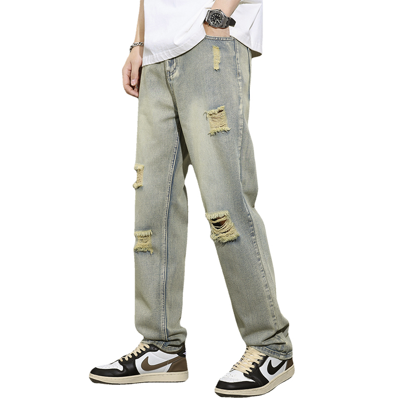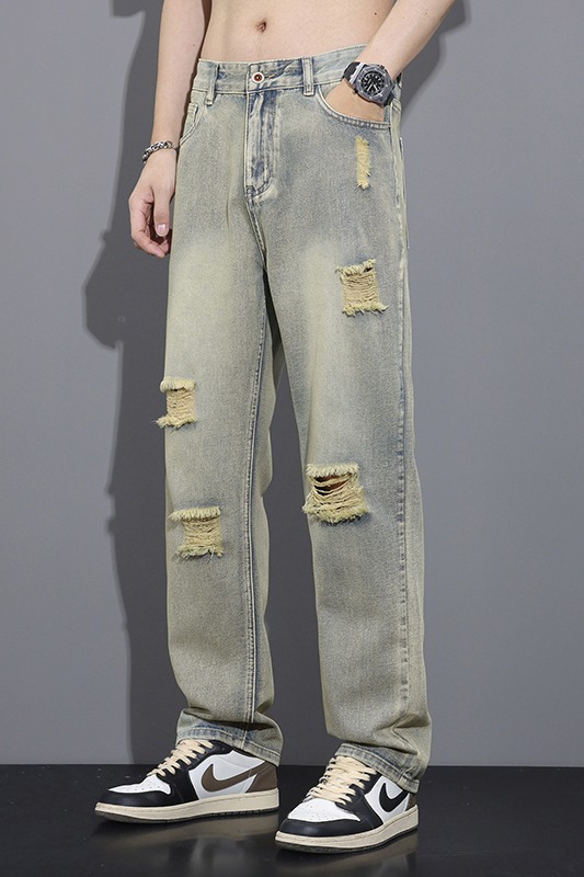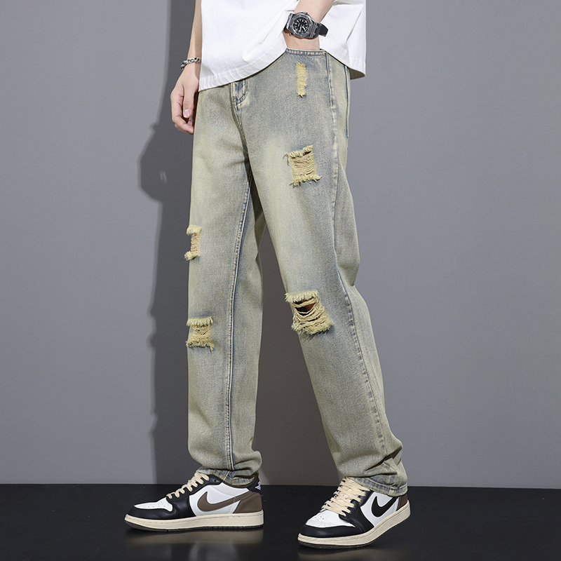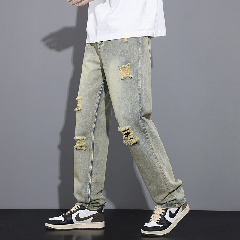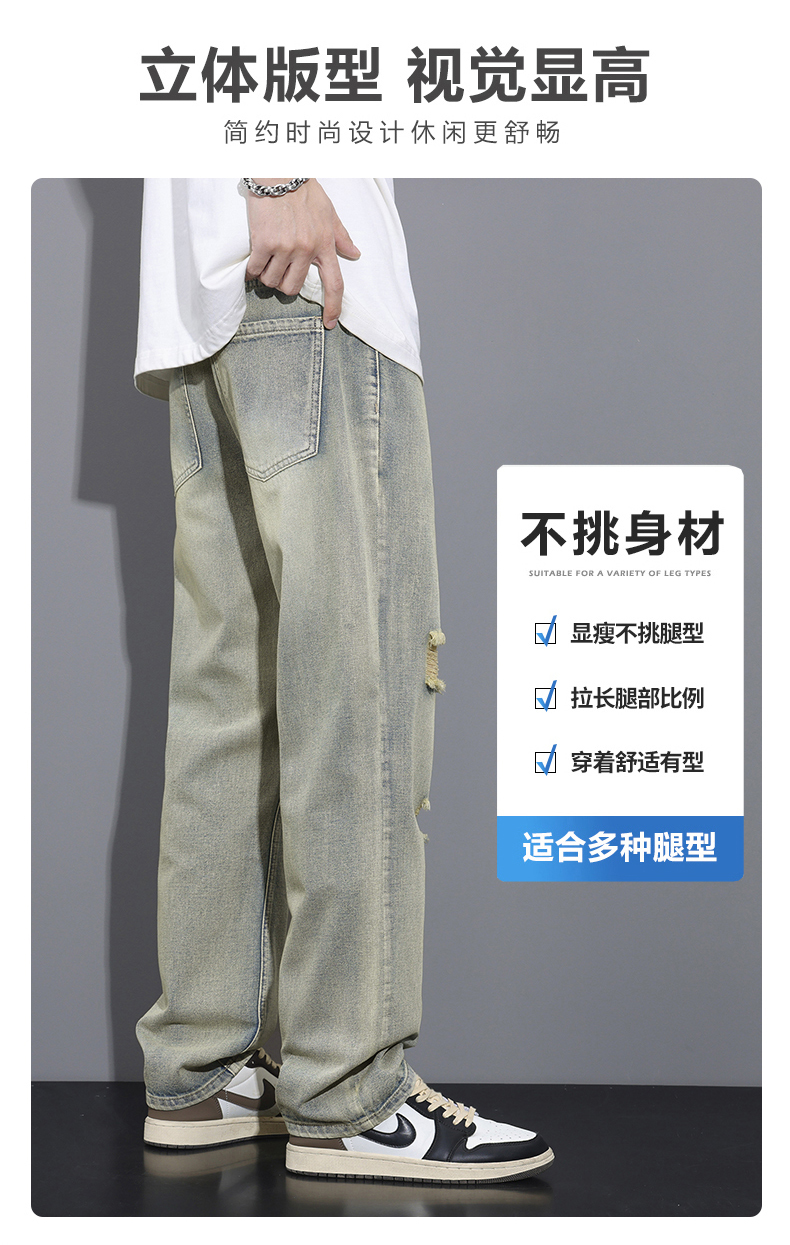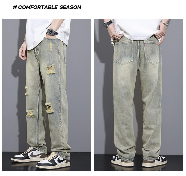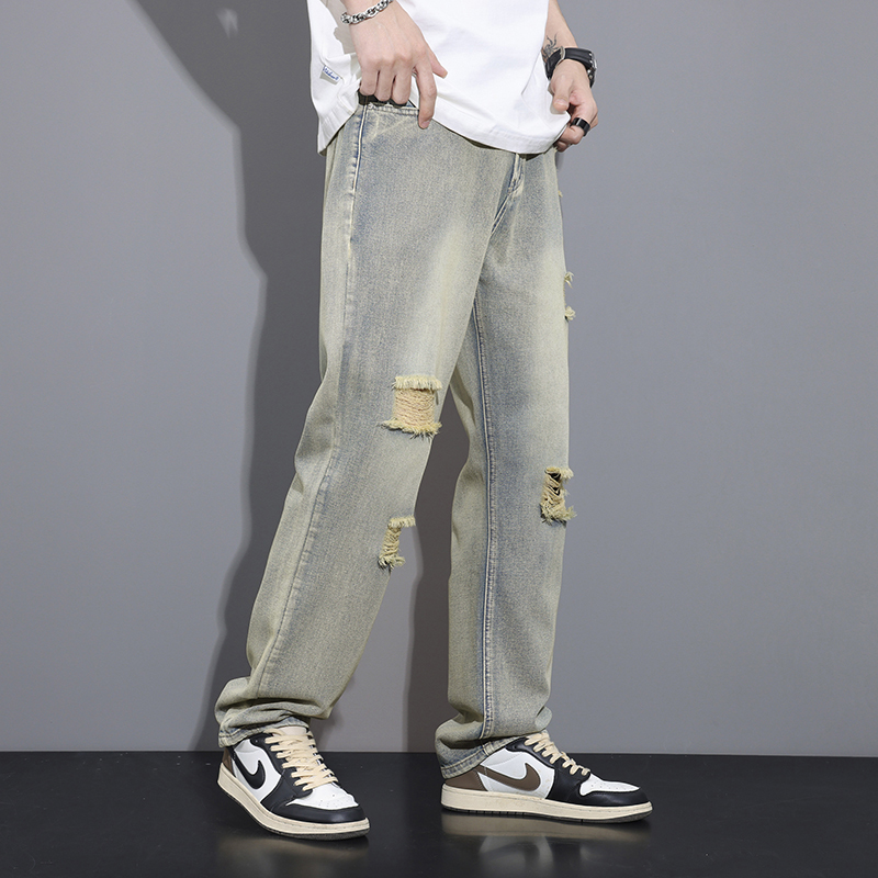 실사 2026 여름 새로운 9 포인트 찢어진 부분 청바지 남자 루즈핏 할란 스트레이트 팬츠