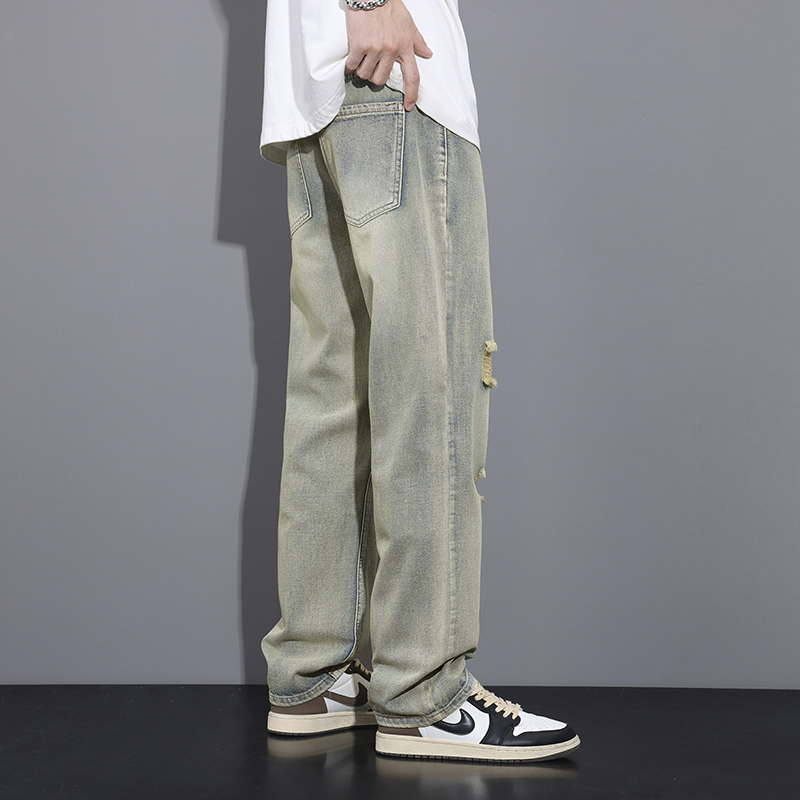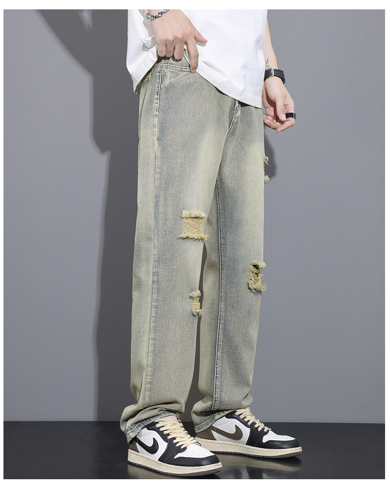 실사 2026 여름 새로운 아메리칸 높음 거리 항구 바람 레트로 노스탤지어 개성 찢어진 부분 루즈핏 넓은 다리 청바지 남자