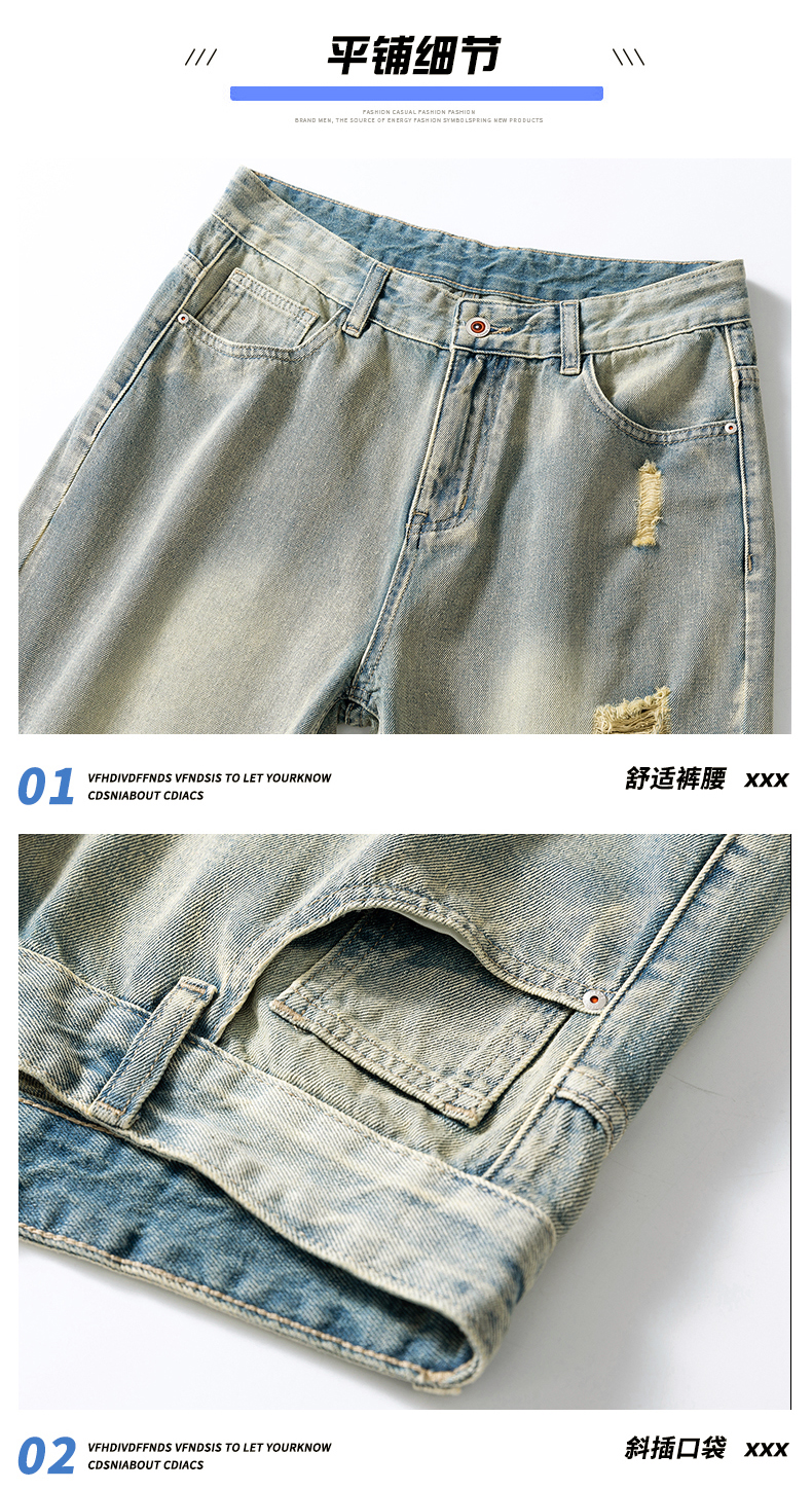 실사 2026 여름 새로운 한국 스타일 데님 바지 남자 루즈핏 스트레이트 워크웨어 팬츠 아메리칸 레트로 캐주얼 반바지