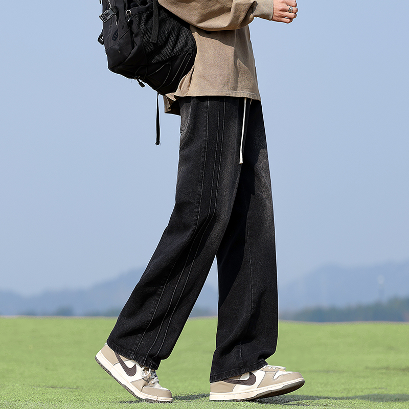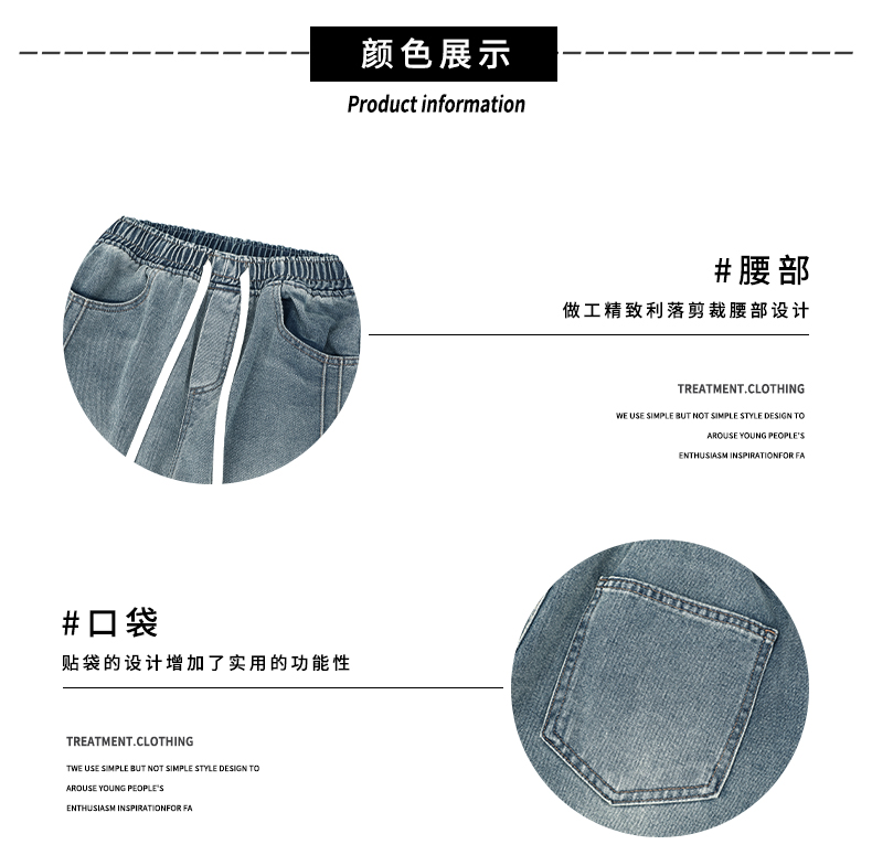 실사 여름 새로운 워크웨어 빅 포켓 데님 오부 바지 남자 루즈핏 전체 밴딩 펌프 로프 캐주얼 다용도 바지