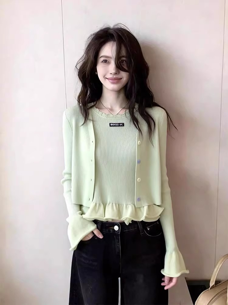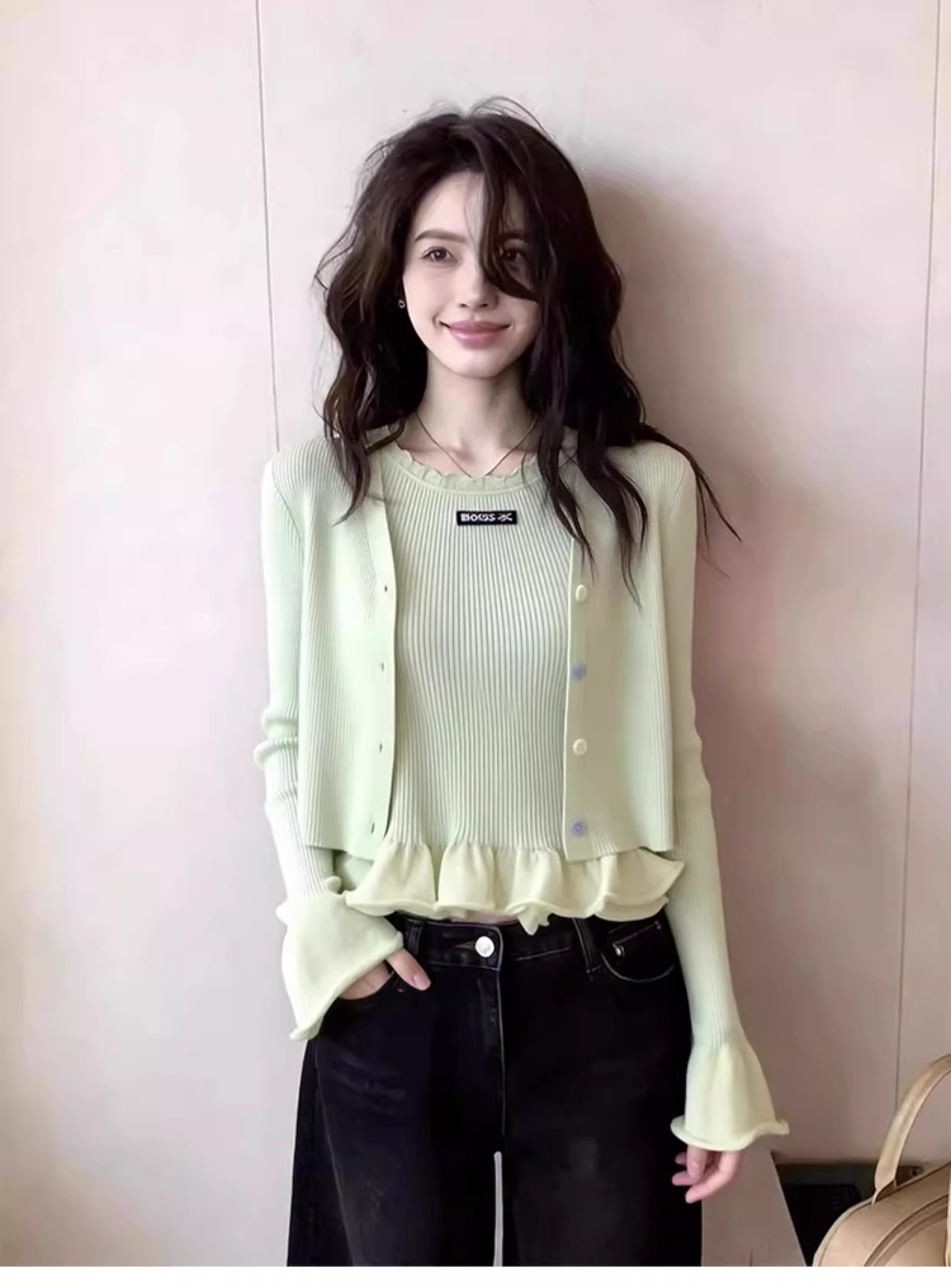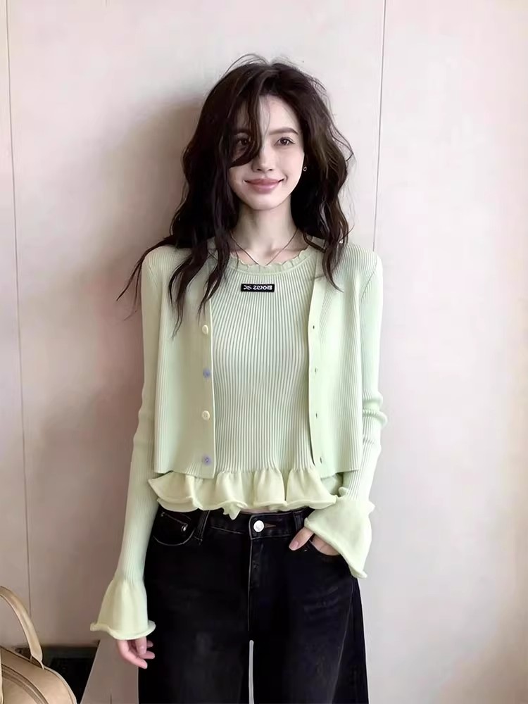 한 부서 고유 한 아름다운 핑크색 진주 버클 니트 오픈 가디건 여성 코트 이른 봄 부드러운 다용도 쇼트 스타일 긴팔 맨위
