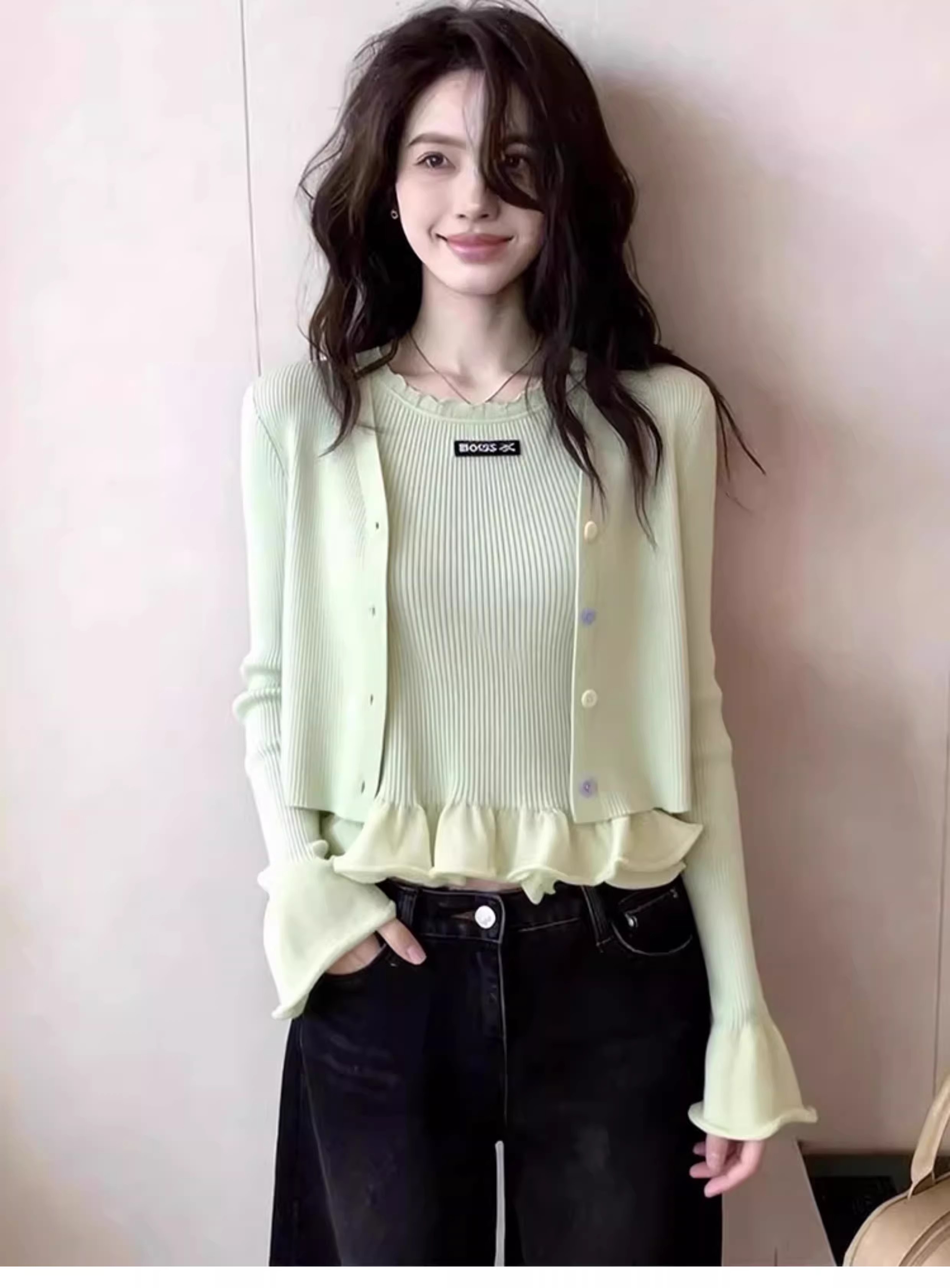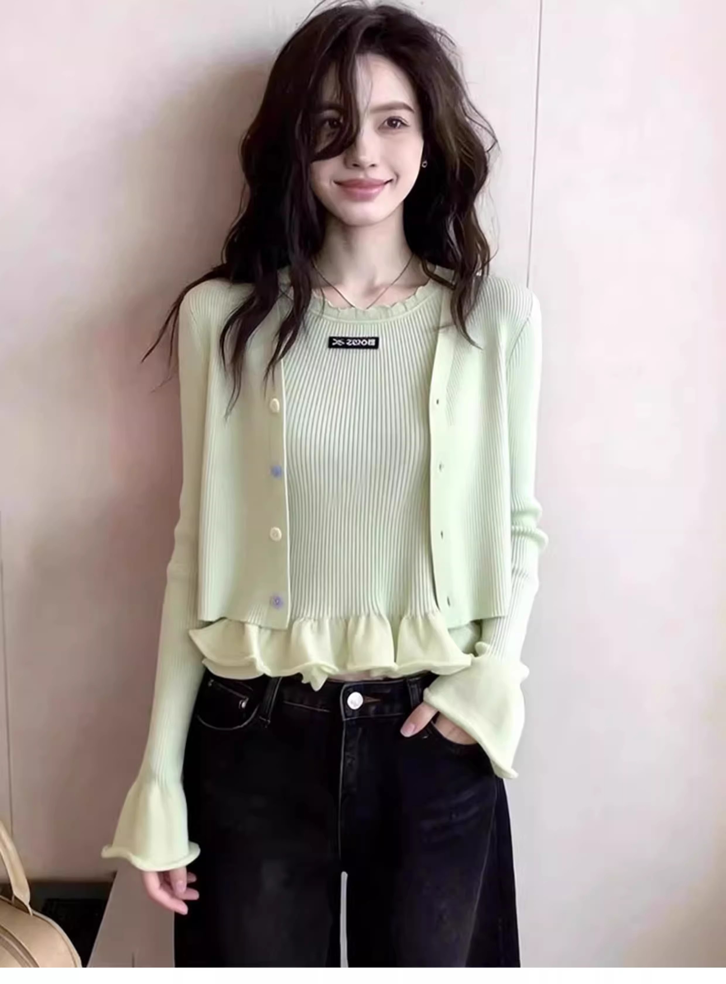 2026 슈퍼 화재 열린 봄 착용 가져 가라. 전체 집합 고유 한 아름다운 자이언트 잘 생긴 스택 착용 파란색 맨위 3종 세트 바지 여성