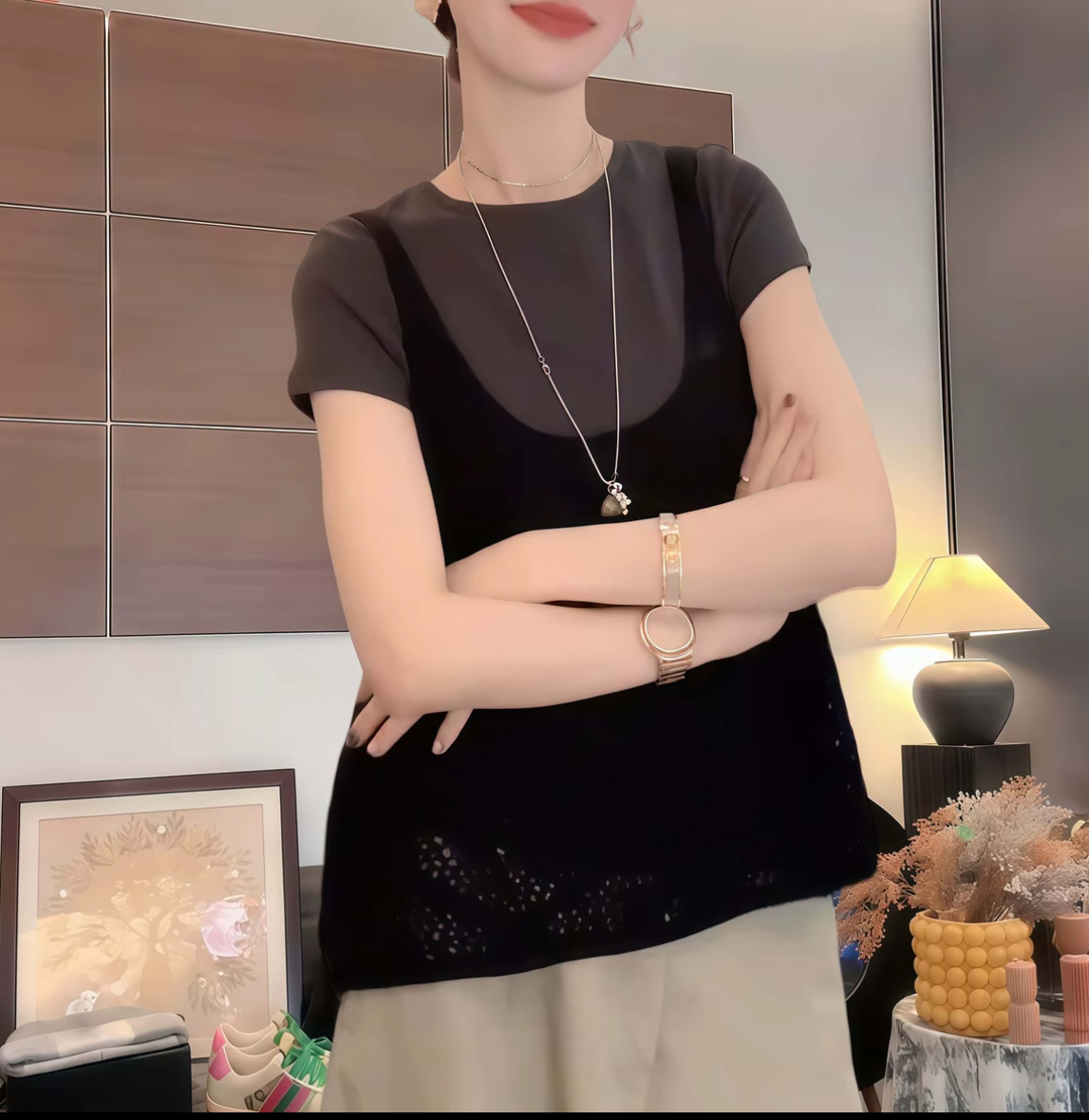 2026 여름 새로운 디자인 센스 작은 대중 패션 품격 여성 V넥 반팔 티셔츠 다용도 작은 레이스 치마