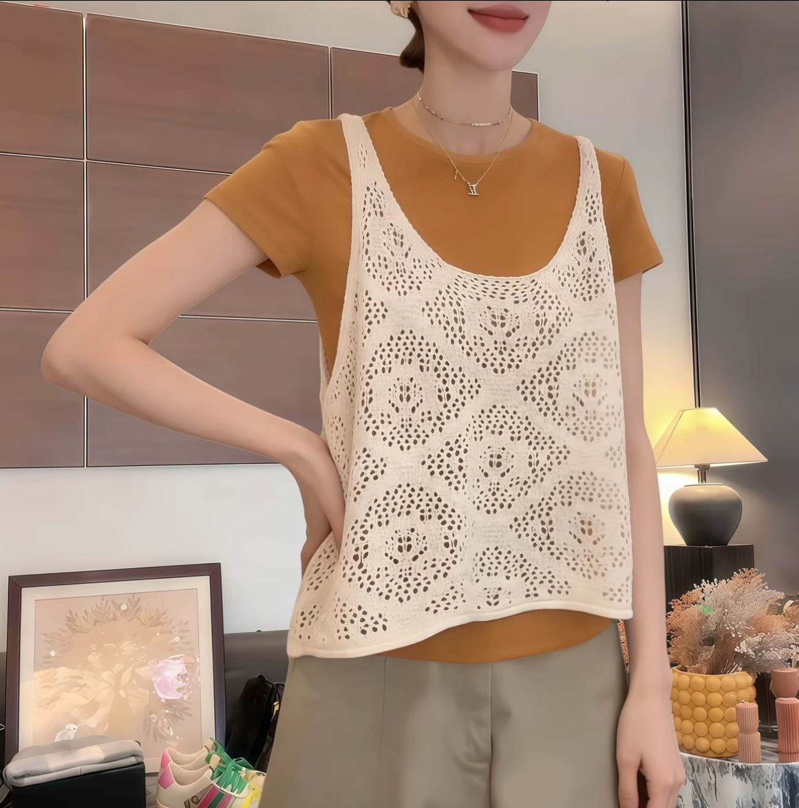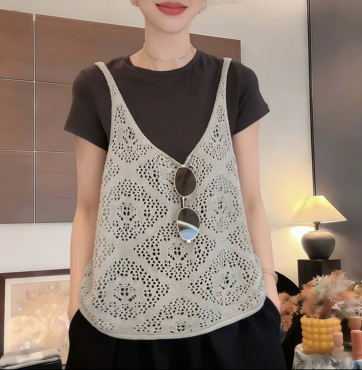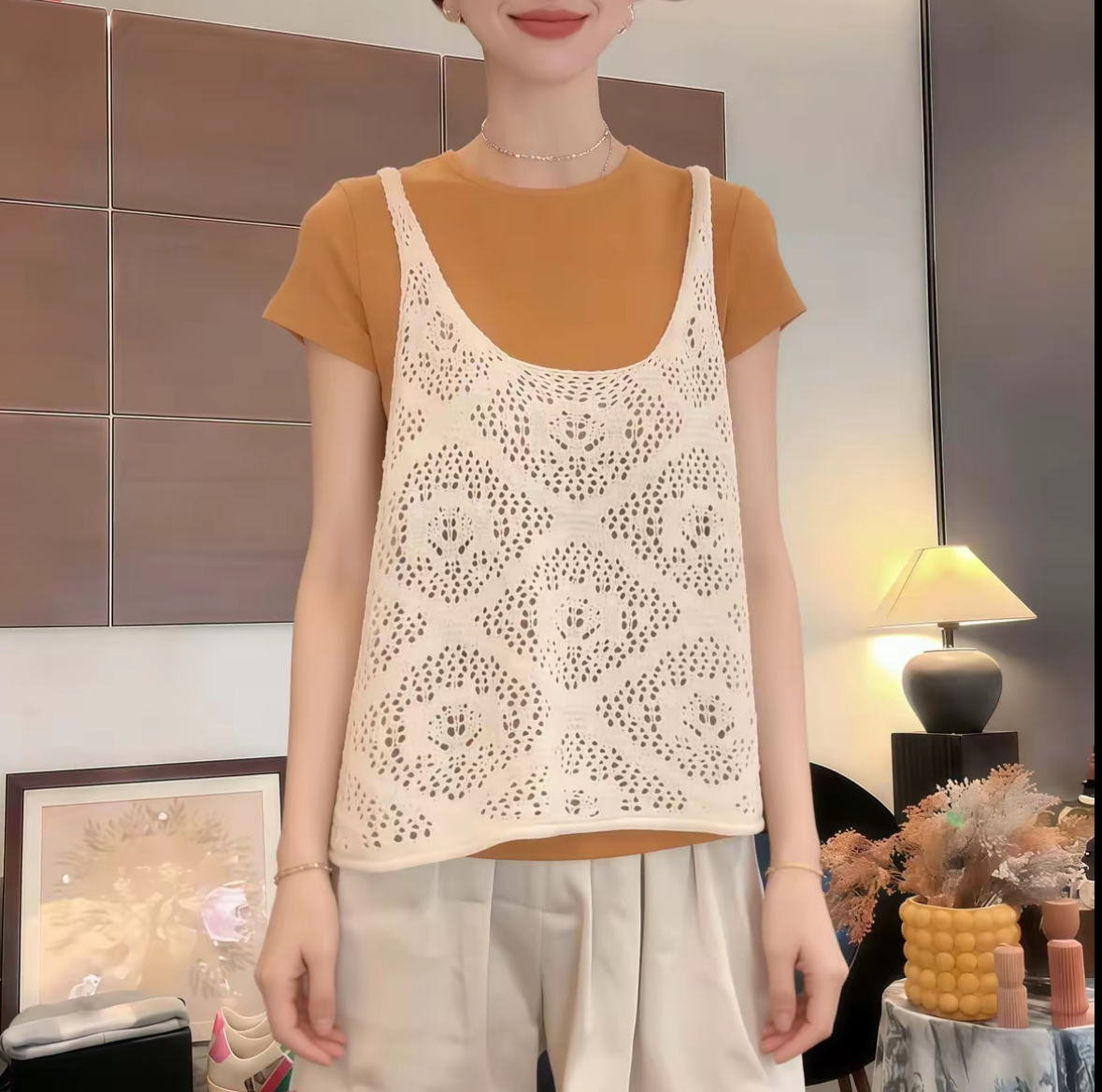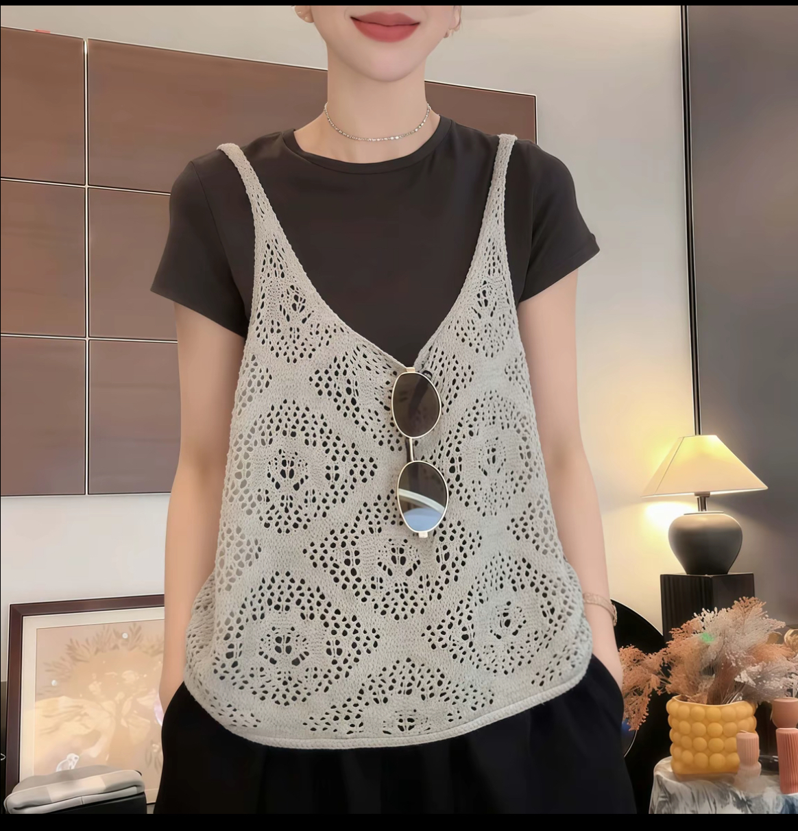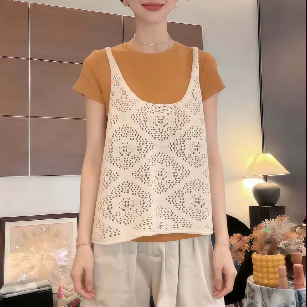 봄 단색 얇은 스타일 자수 홀로우 아웃 조끼 여자 2026 새로운 패션 캐주얼 느긋한 다용도 캐미솔