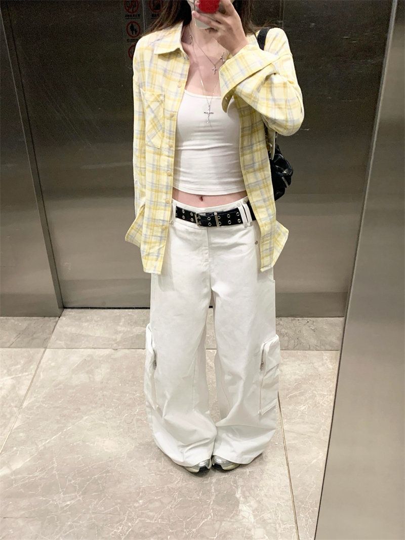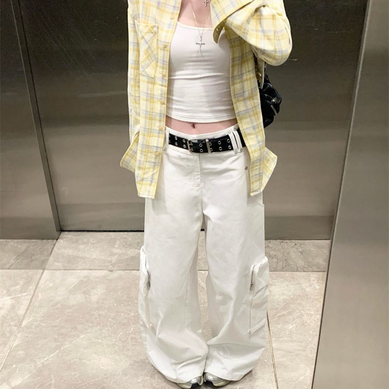 3 차원 허리 고밀도 사선 무늬 화이트 바지 도루 센스 빅 사이즈 슬림해 보이는 루즈핏 워크웨어 캐주얼 와이드 레그 팬츠