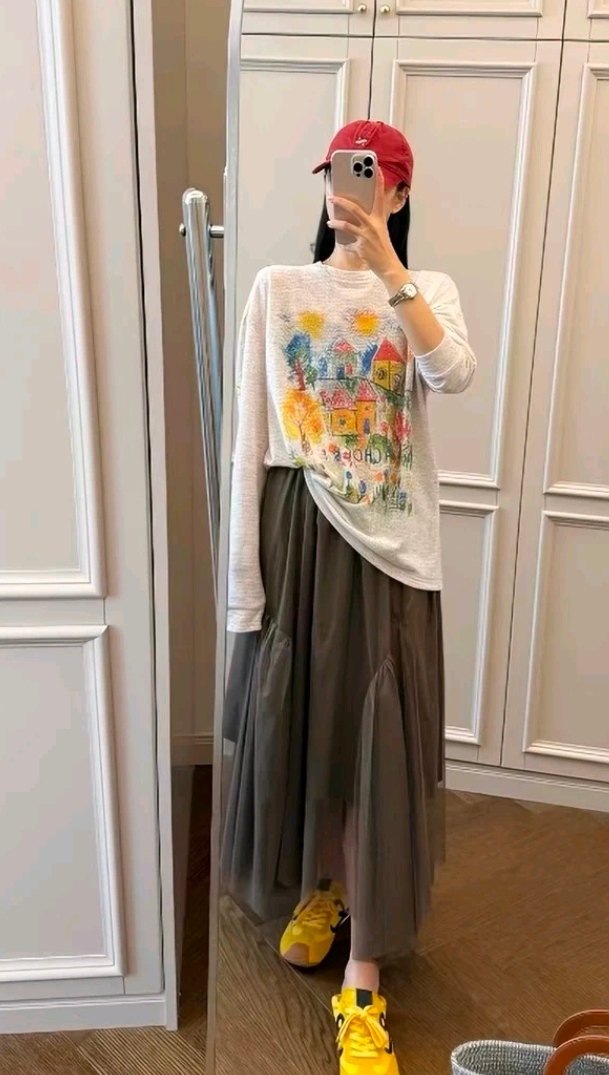 yy ・ studio2026 여름 라운드 넥 캐주얼 루즈핏 반팔 티셔츠 달 흔적 약탈 플레이아데스 밴딩 주름 반신 스커트