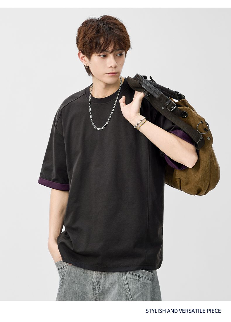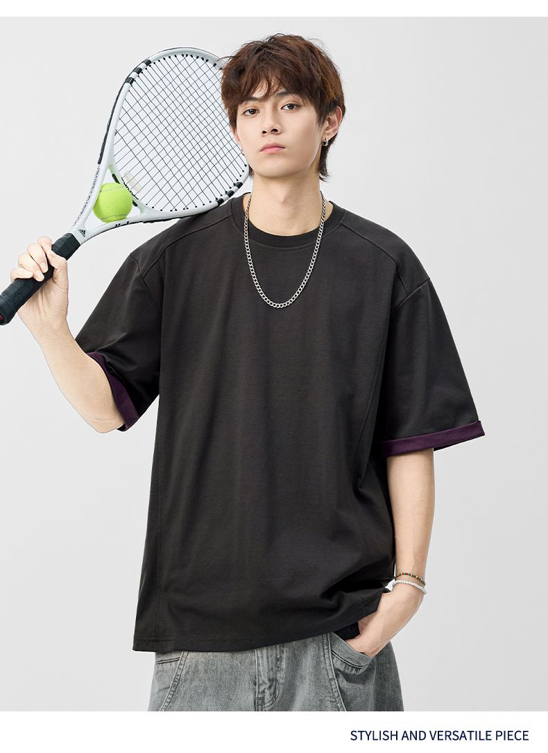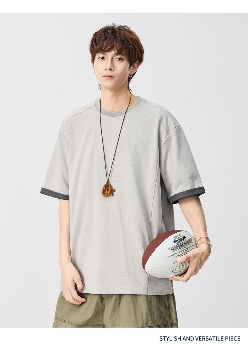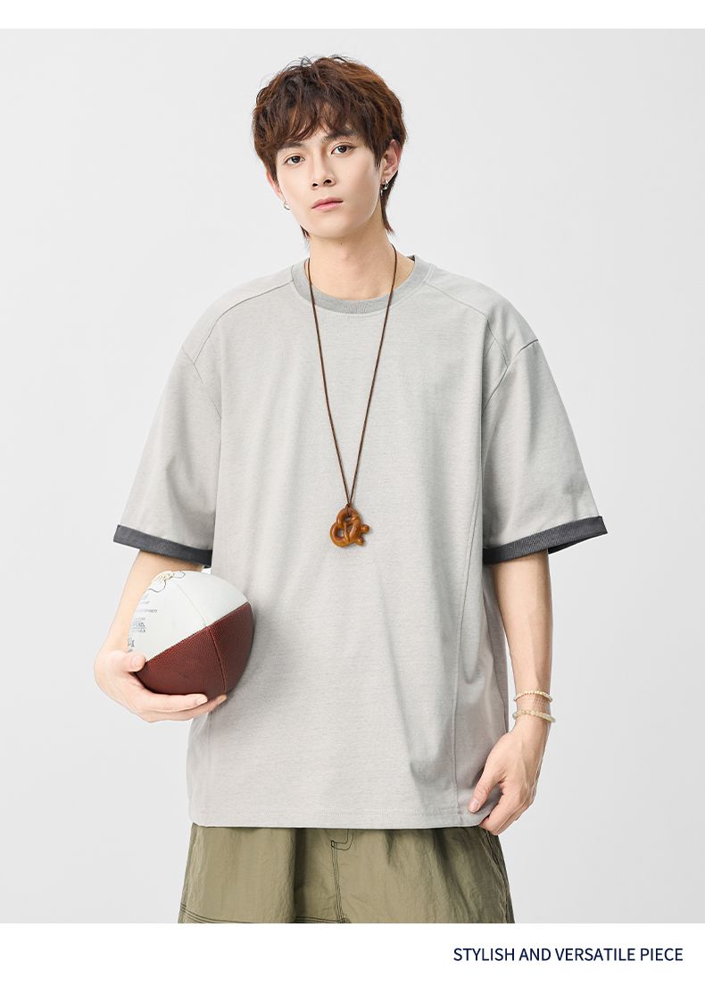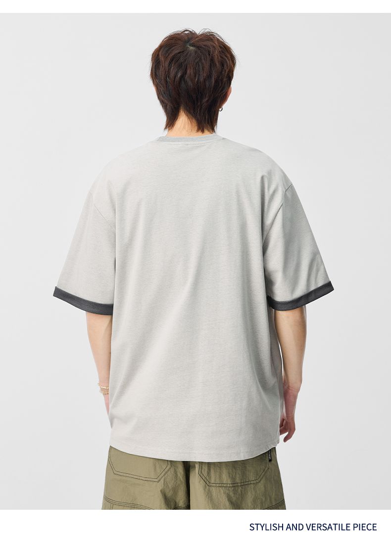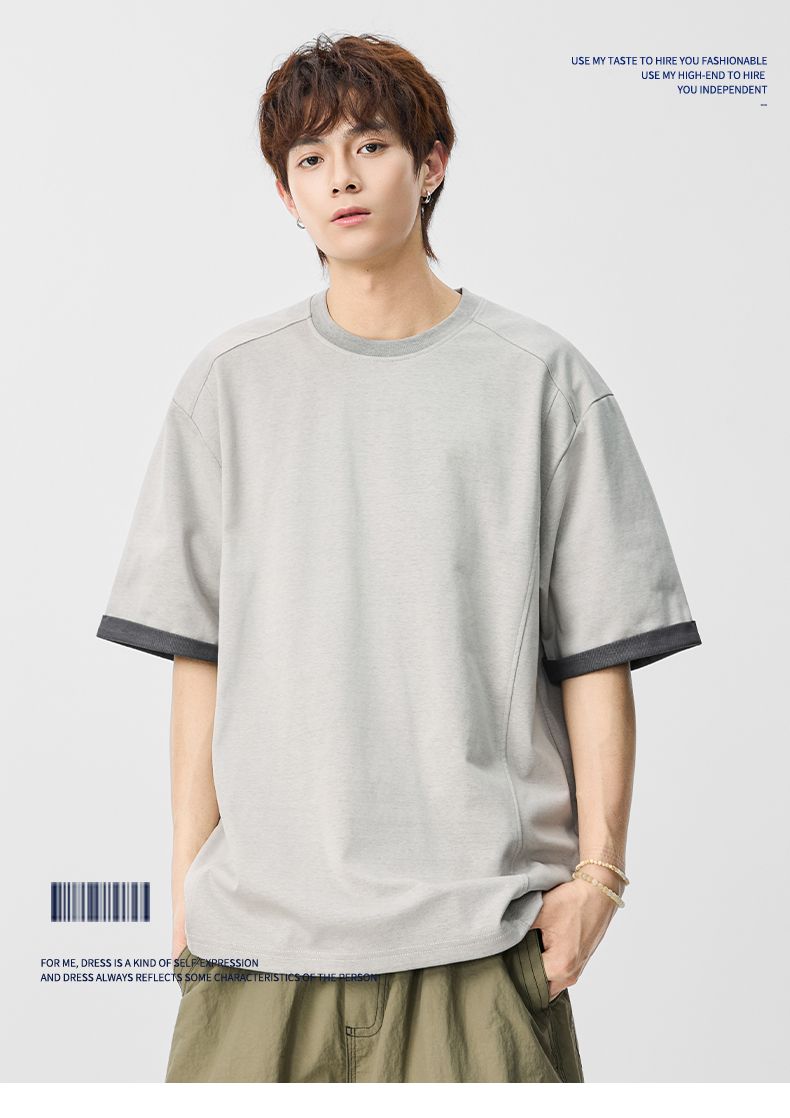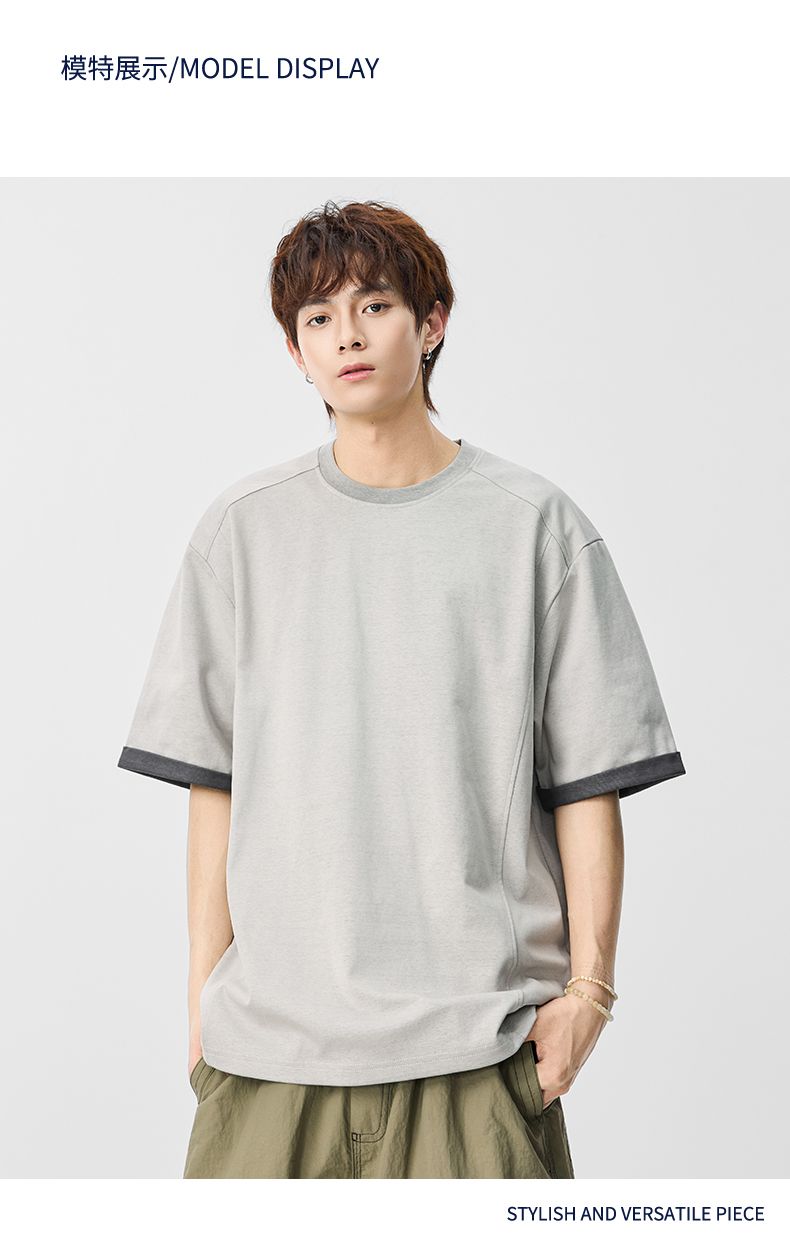 실사 2026 여름 새로운 단색 패치워크 반팔 티셔츠 남자 무거운 일본식 트렌드 5 점 소매 동정