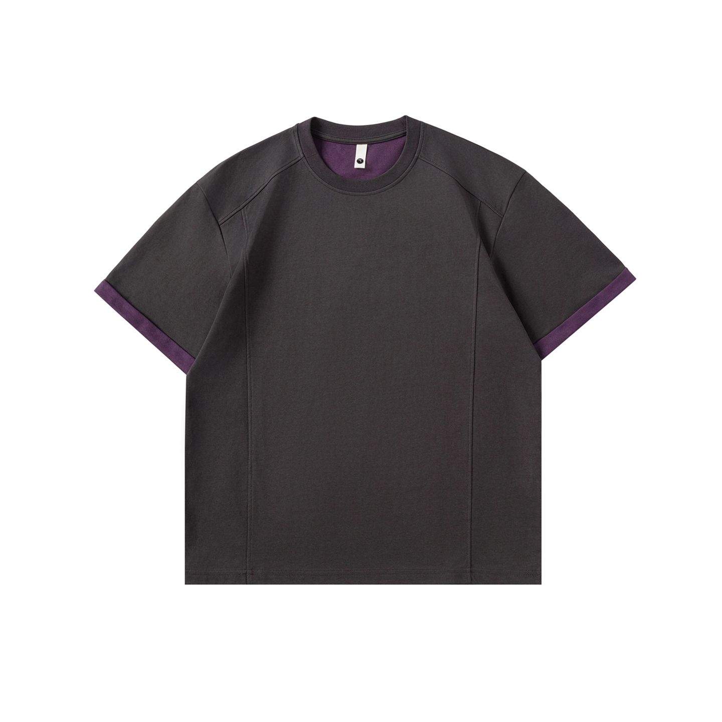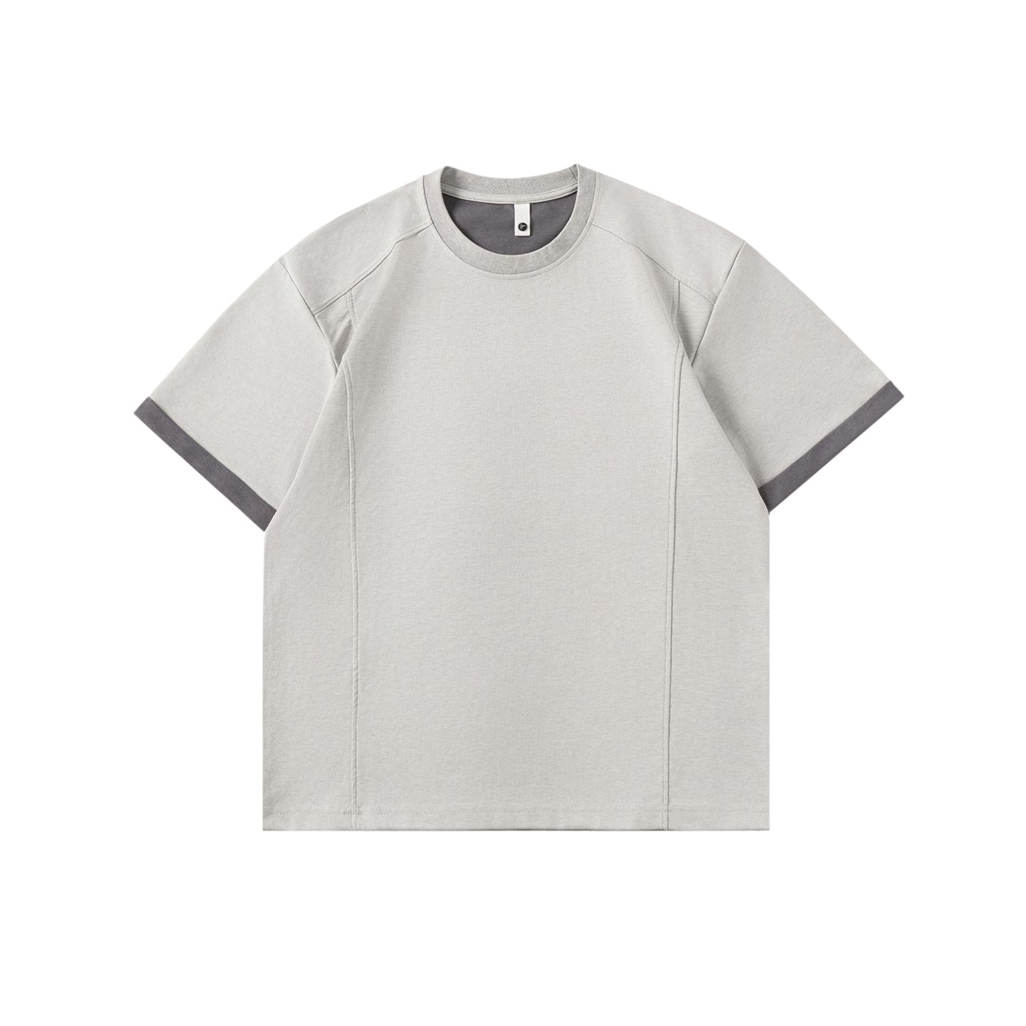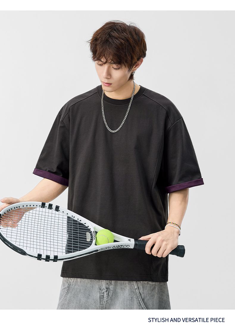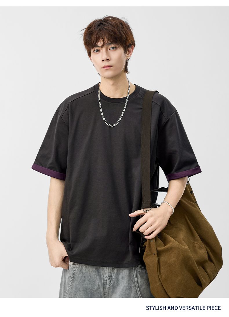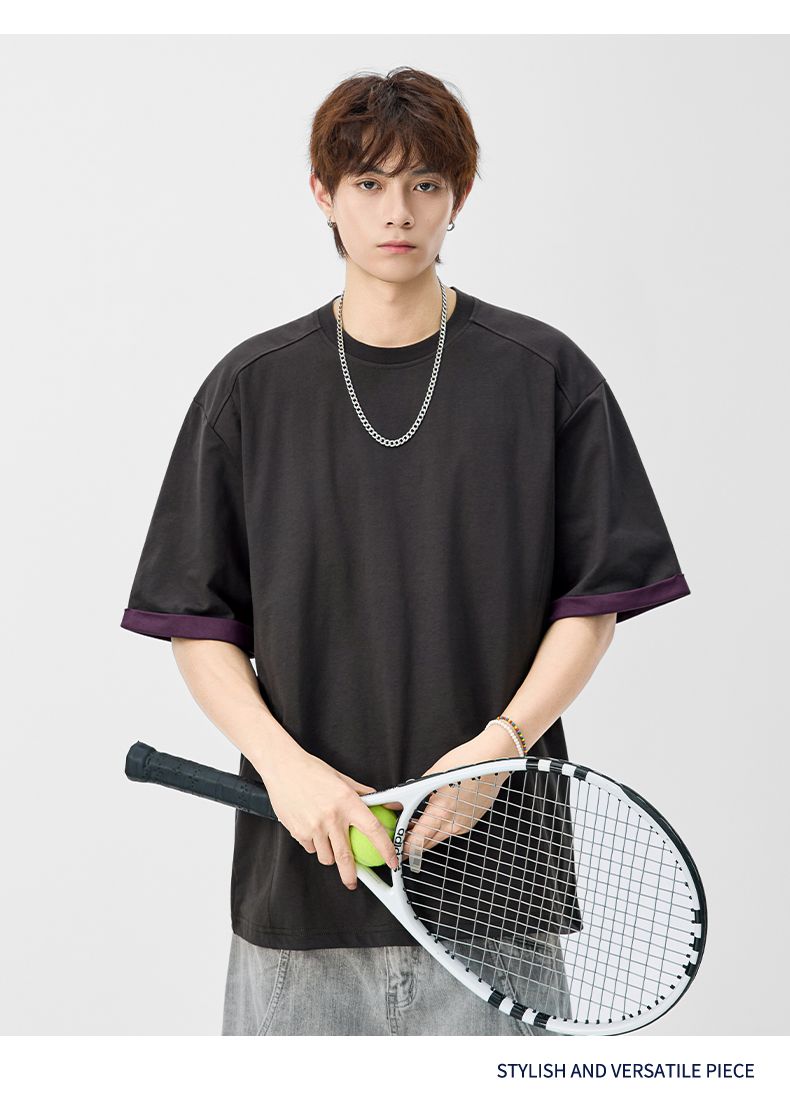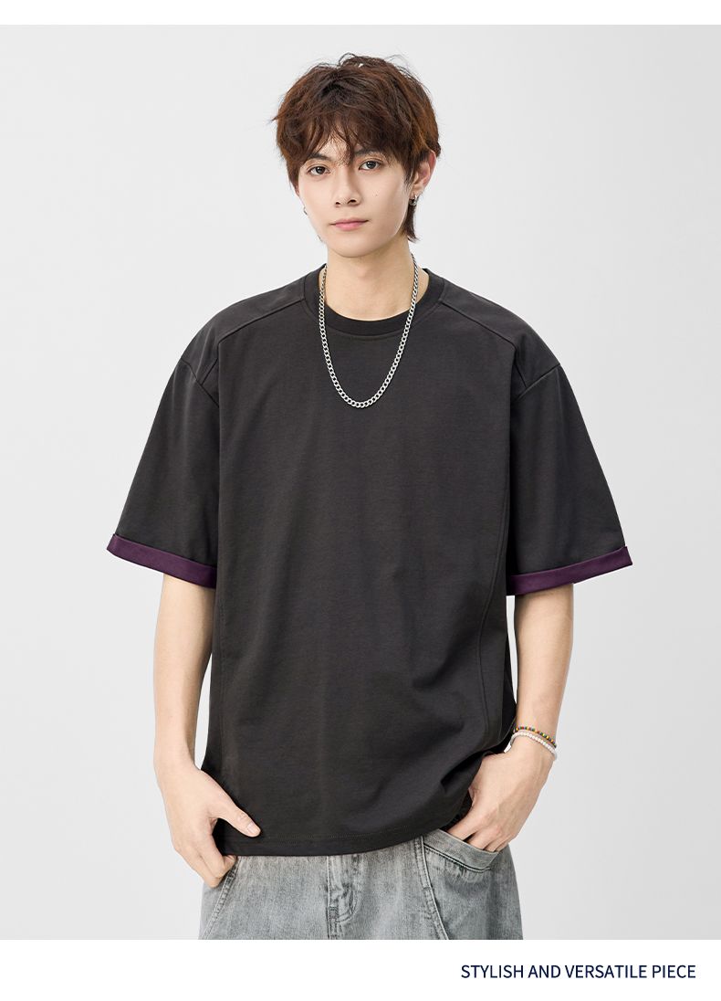 실사 2026 여름 새로운 단색 패치워크 반팔 티셔츠 남자 무거운 일본식 트렌드 5 점 소매 동정