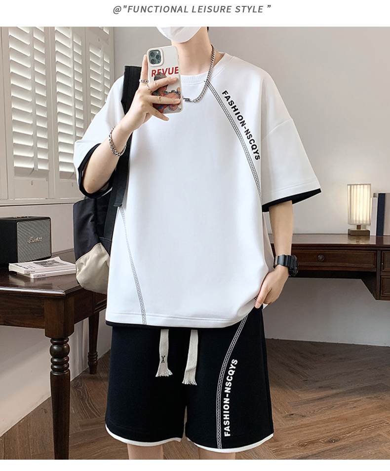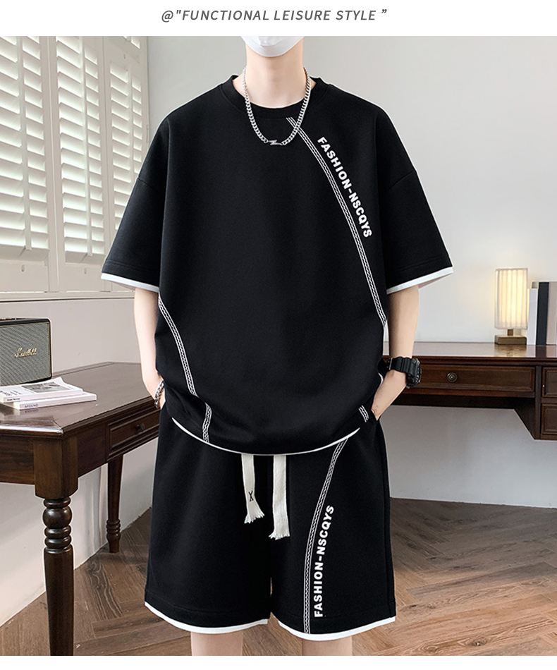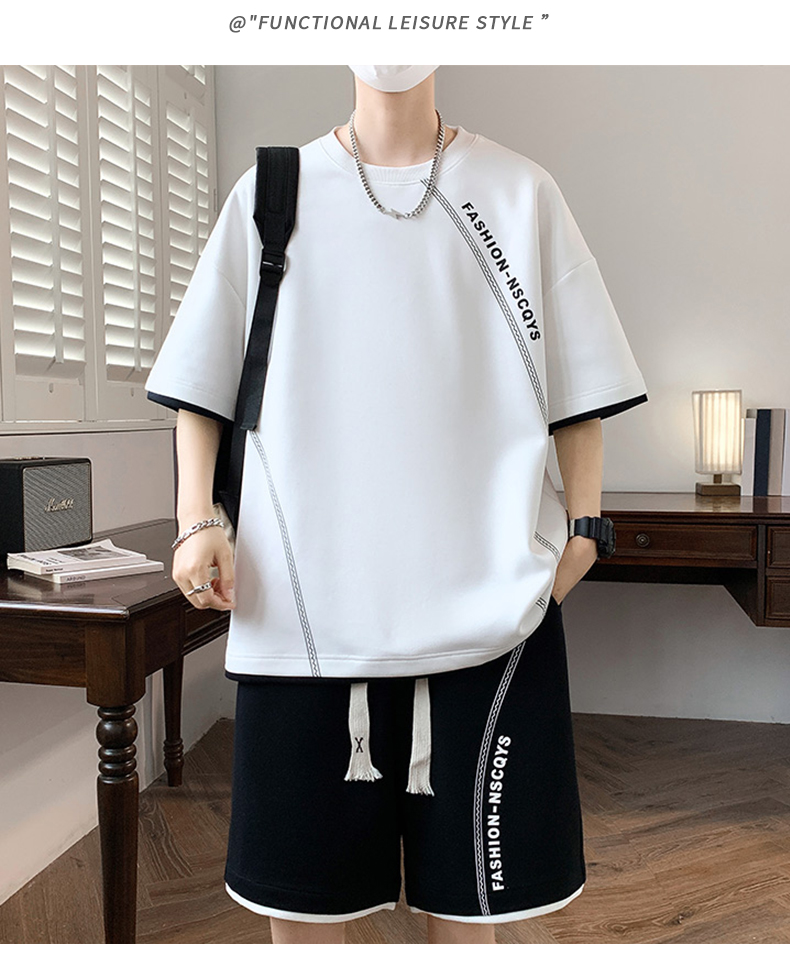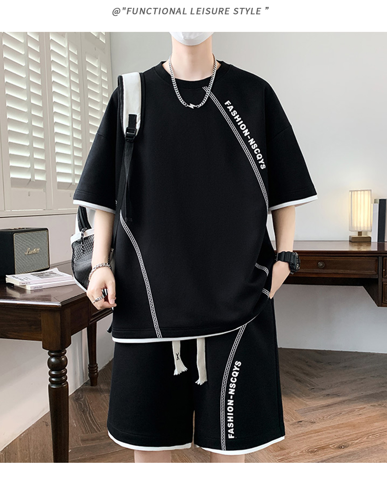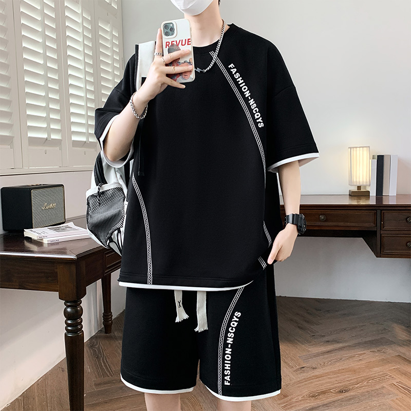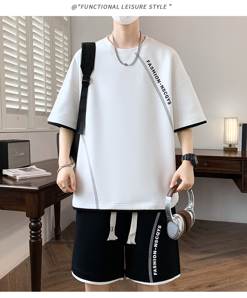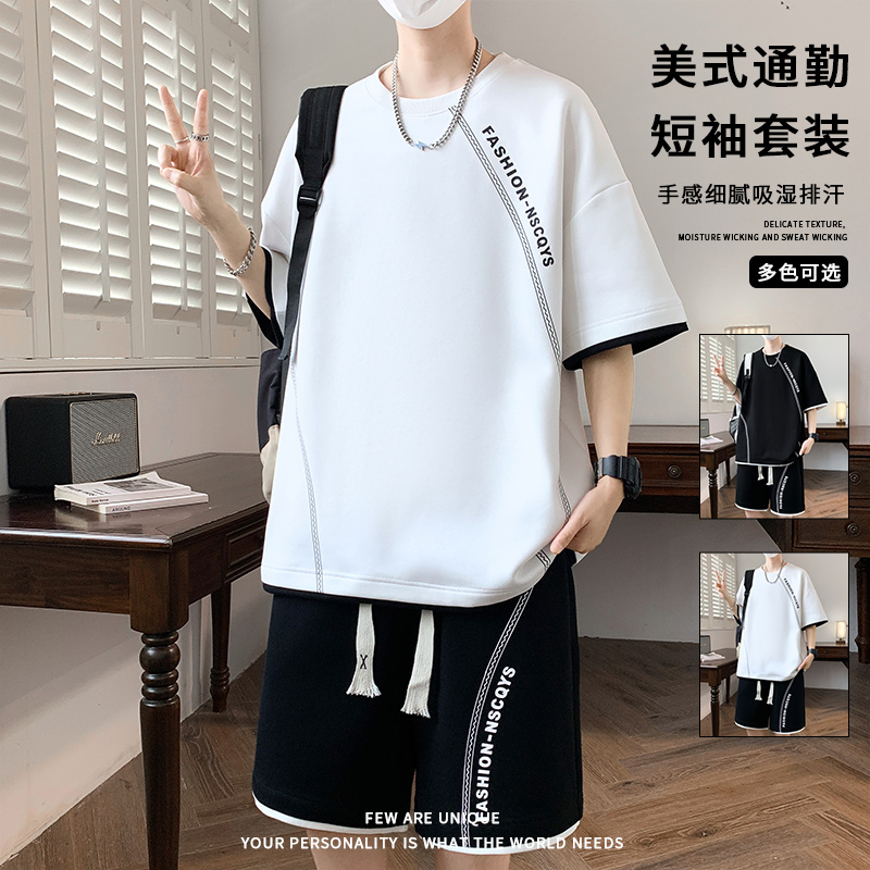 여름 신제품 스포츠 슈트 남성 실행 페이스 건조한 라운드 넥 반팔 티셔츠 루즈핏 연주 중 훈련 서비스 투피스 세트