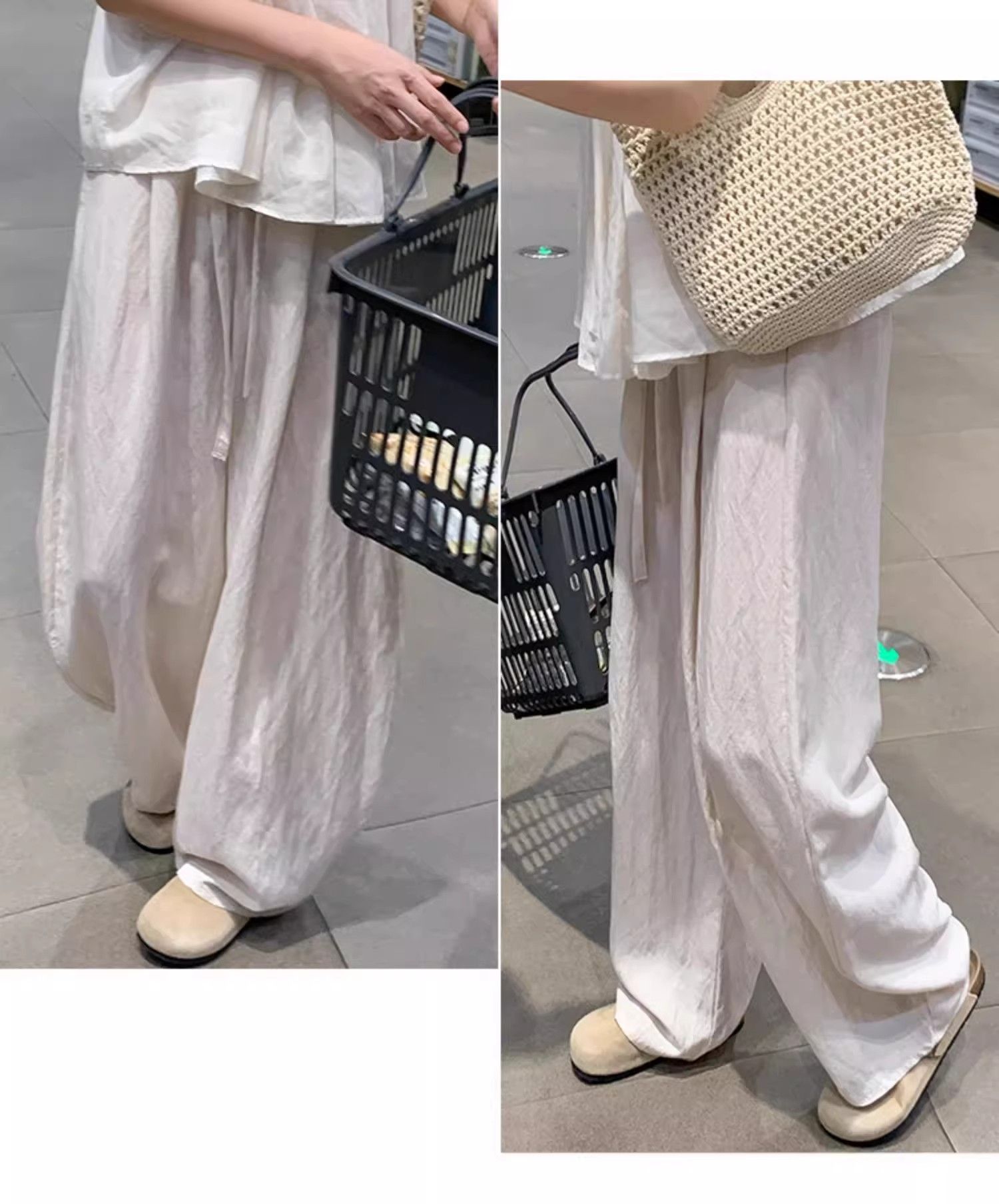 3 차원 허리 고밀도 사선 무늬 화이트 바지 도루 센스 빅 사이즈 슬림해 보이는 루즈핏 워크웨어 캐주얼 와이드 레그 팬츠